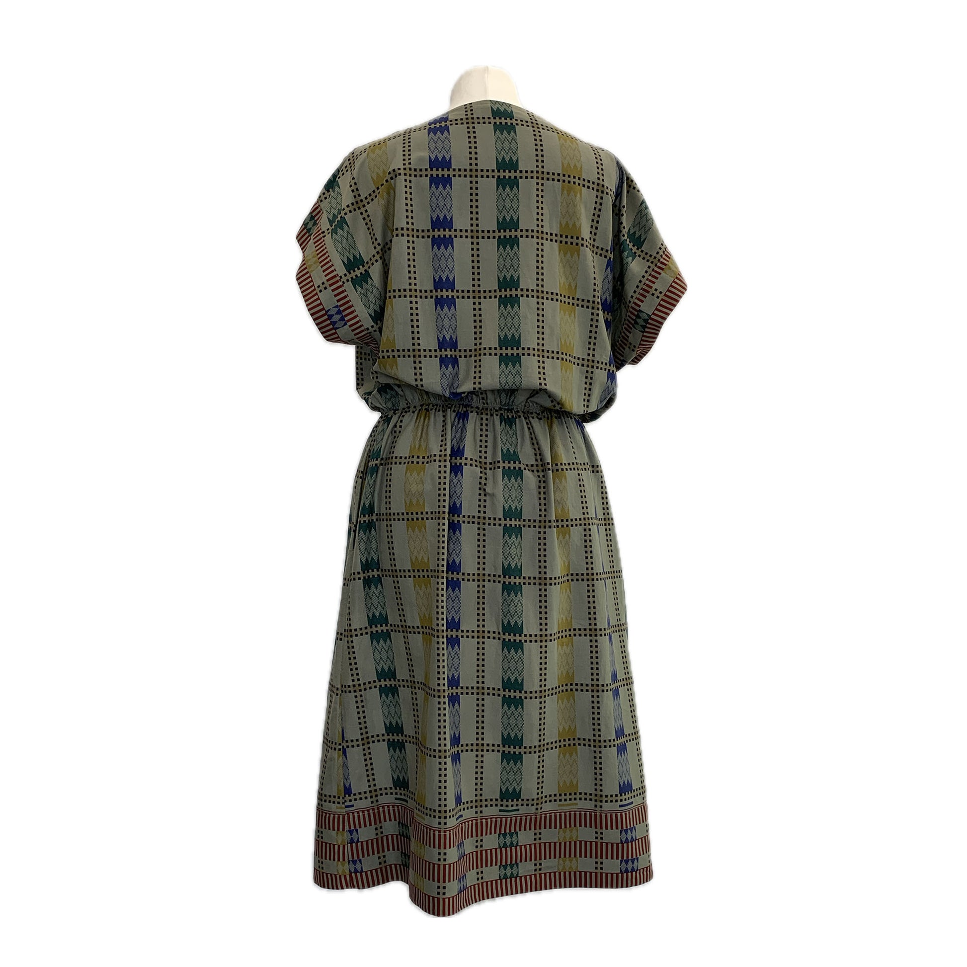 Beautifully cut and sewn, generously sized, extremely wearable simplicity in a dress. The pattern placement and print is wonderful, with back-faced contrast print to hem and sleeves.