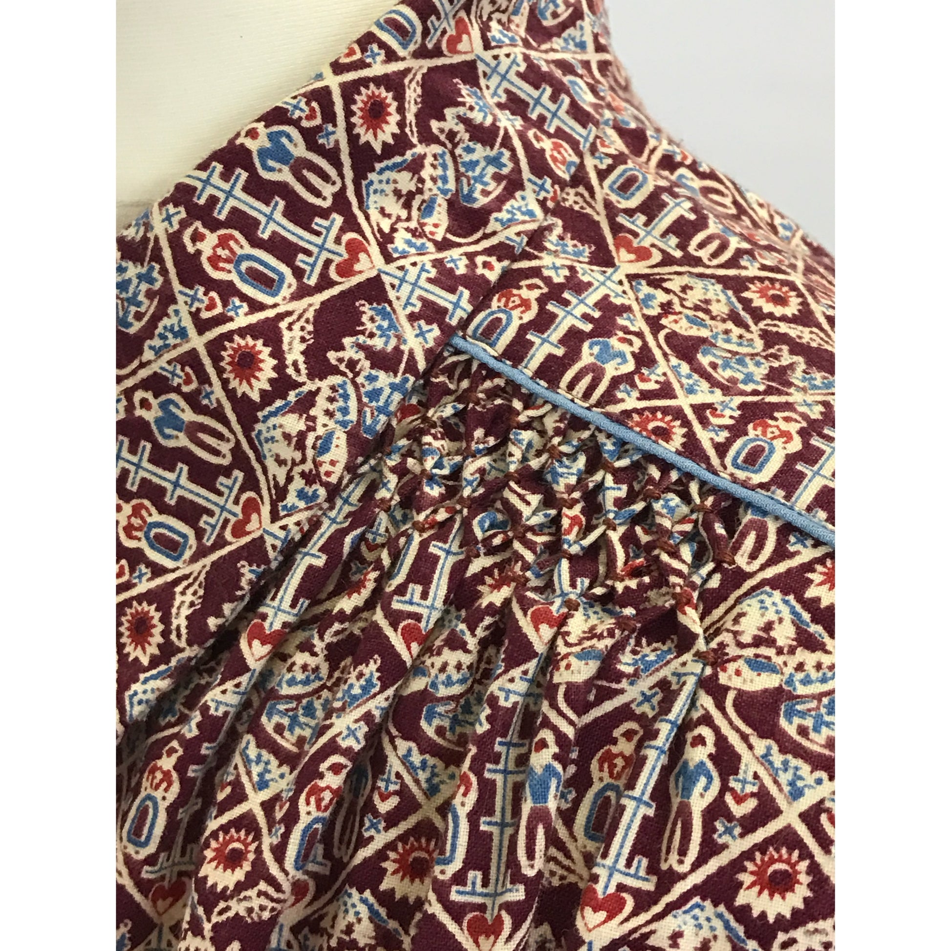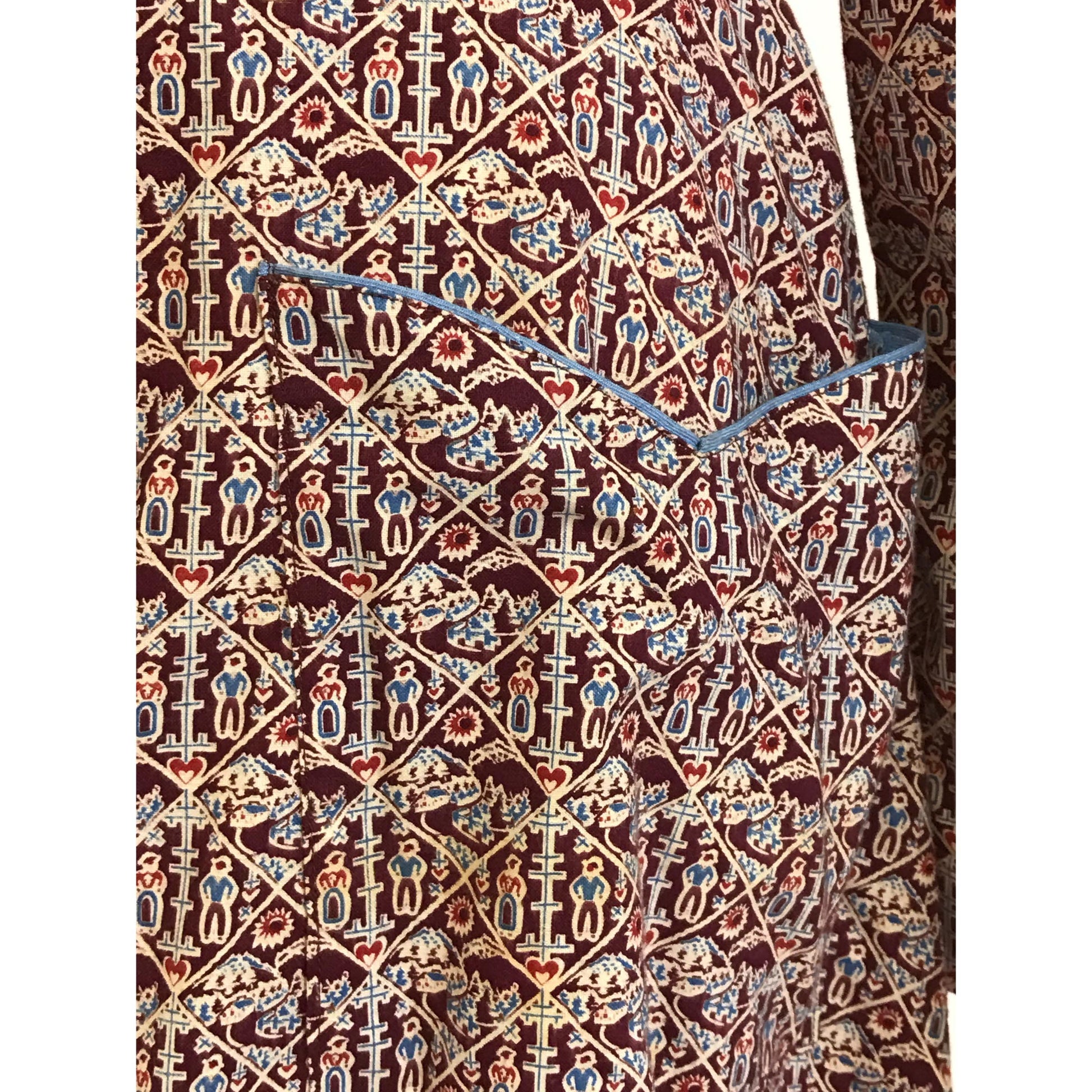The work that went into constructing 1930’s garments never fails to astonish me. This is such a wonderful piece, and in superb condition. Circa 1930's cotton robe/housecoat/dressing gown in a gorgeous folk print cotton textile, collars and contrast blue button front (these look and feel like celluloid buttons). Lovely deep pockets and hand-smocking detail to the shoulders. Contrast piping to shoulders and pockets. Garment still has its original self-tie belt.