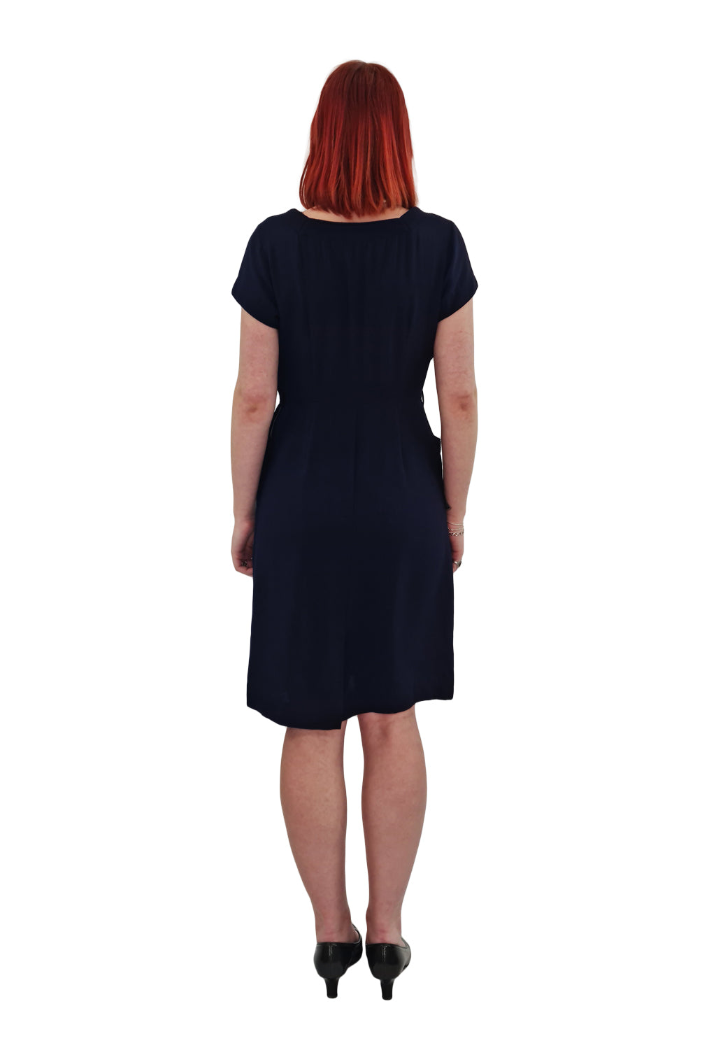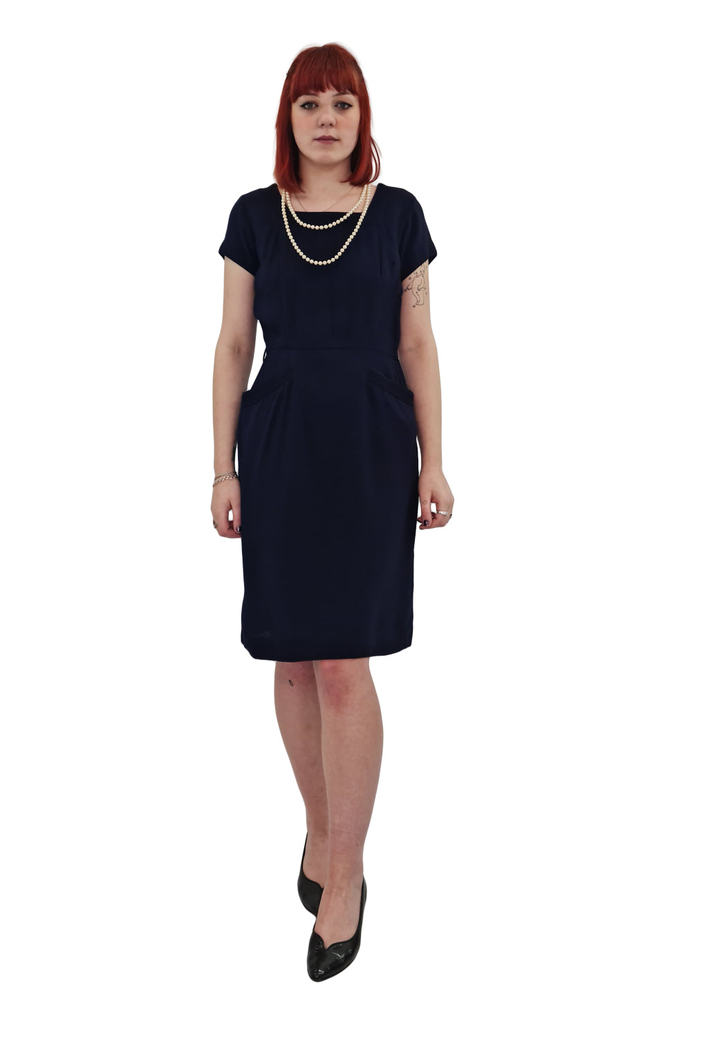 1950's square neck shift dress with pockets. Beautifully cut with nipped in waist. Lovely self-colour stitch trim detailing to neckline and pockets.
