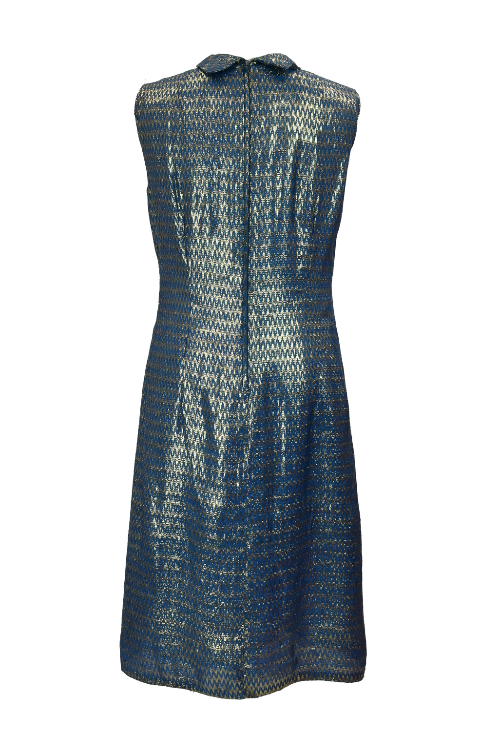 A fabulous blue and gold chevron-weave lurex party dress. Features an inverted diamond shaped keyhole opening to the chest.