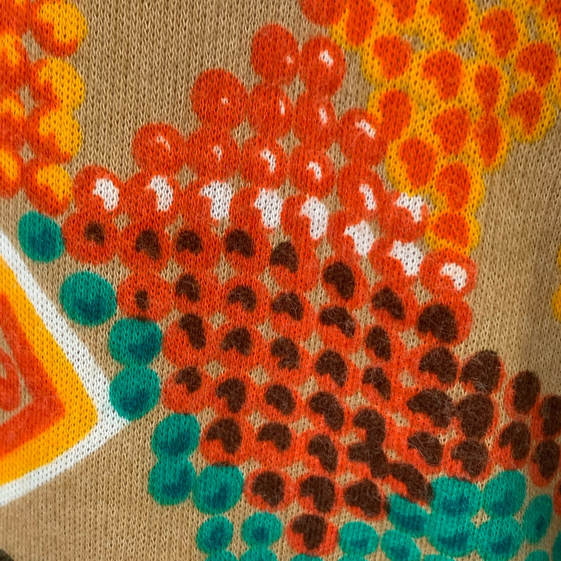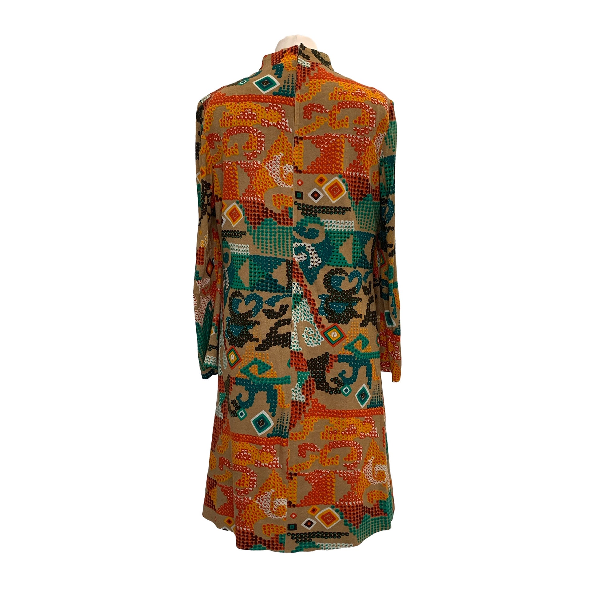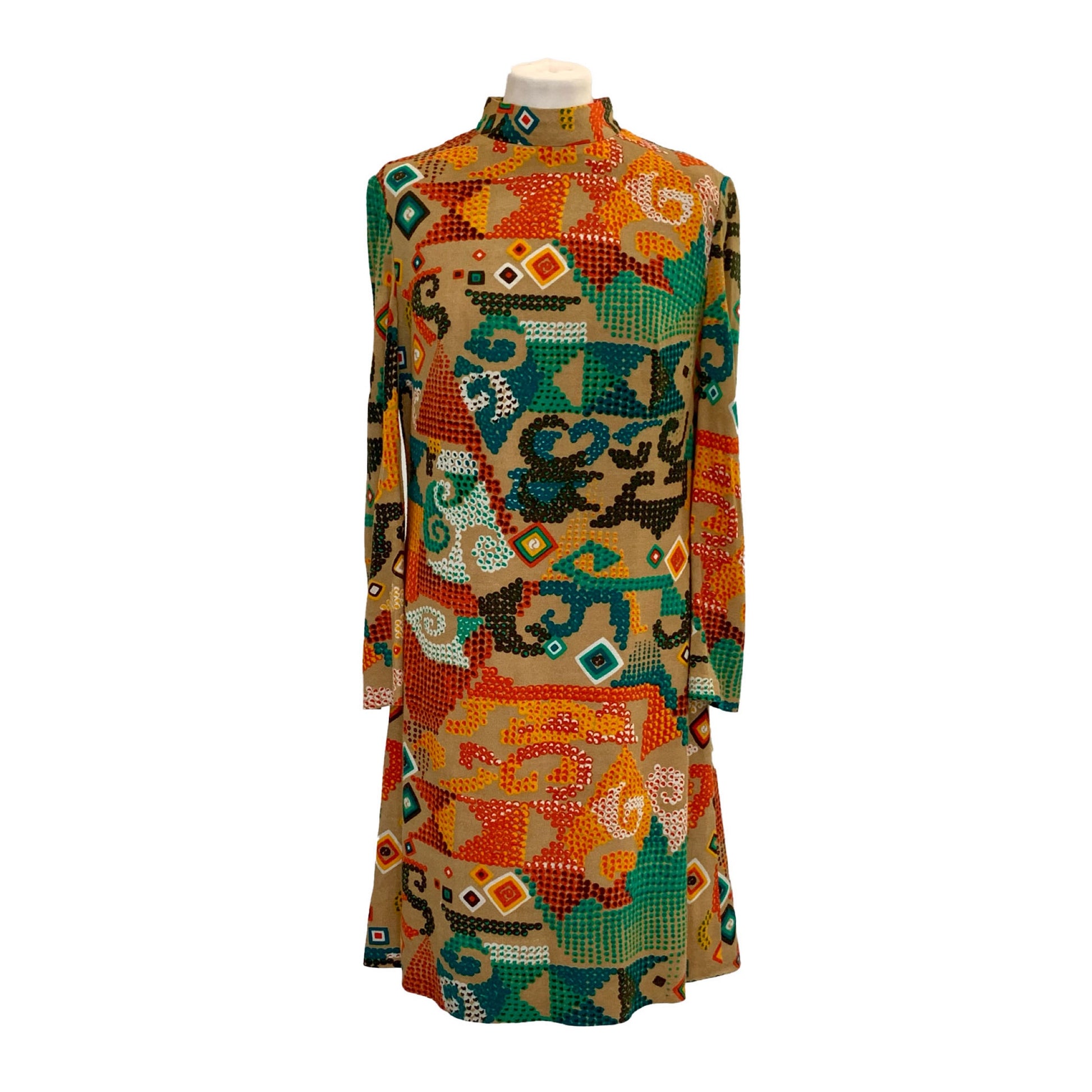 True vintage 60’s abstract printed long sleeved jersey dress. Feels like Trevira textile, which is a soft brushed fine knitted jersey textile popularly used in the 1960’s. High neckline to turtle-neck collar, knee length. Slight flare Part-lined.