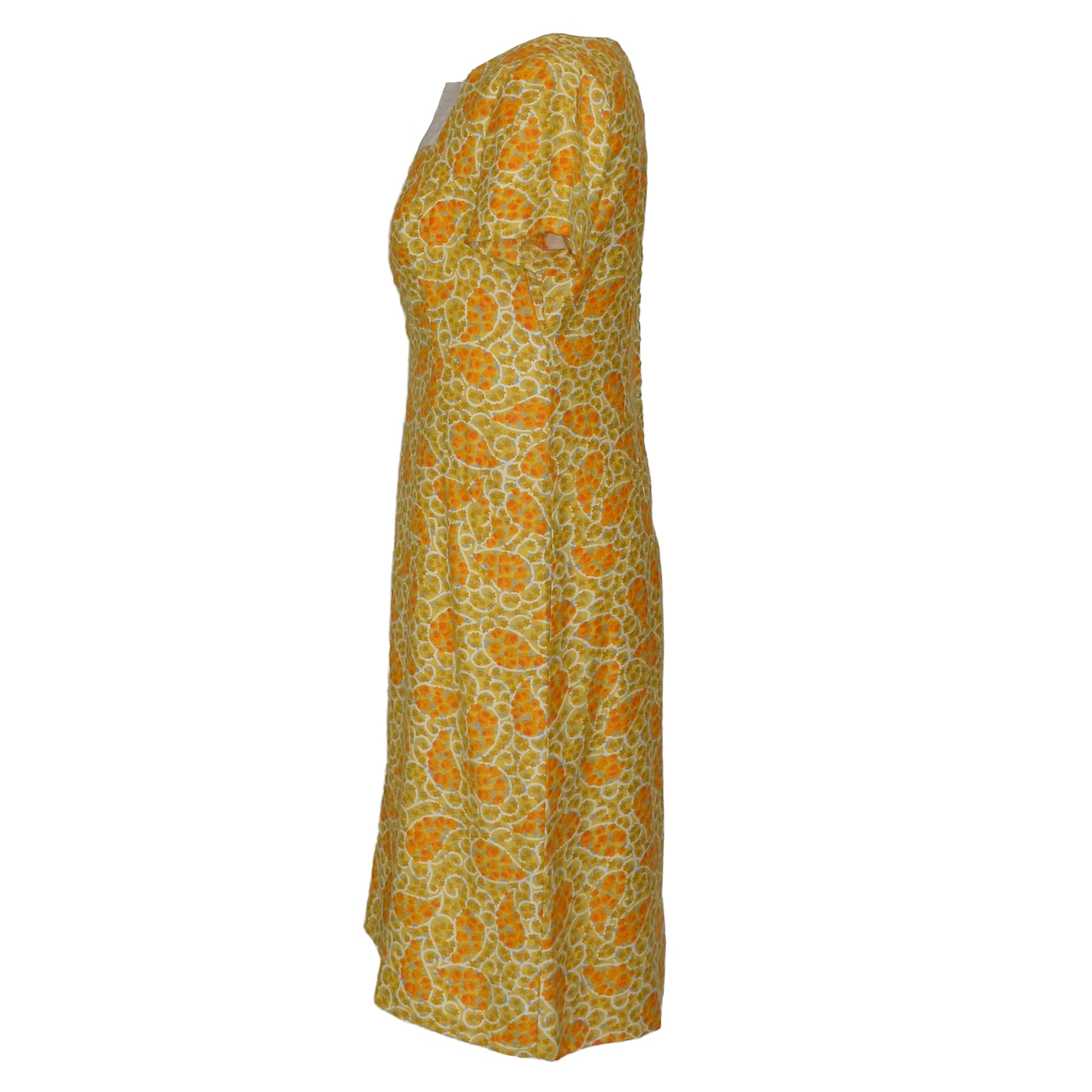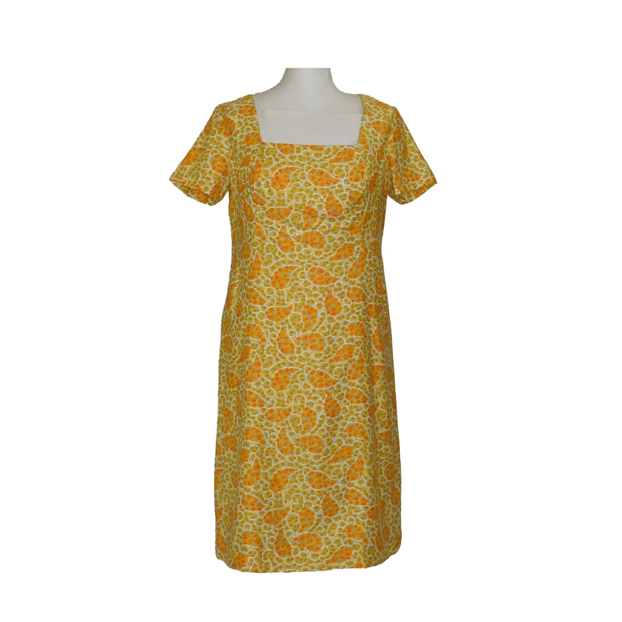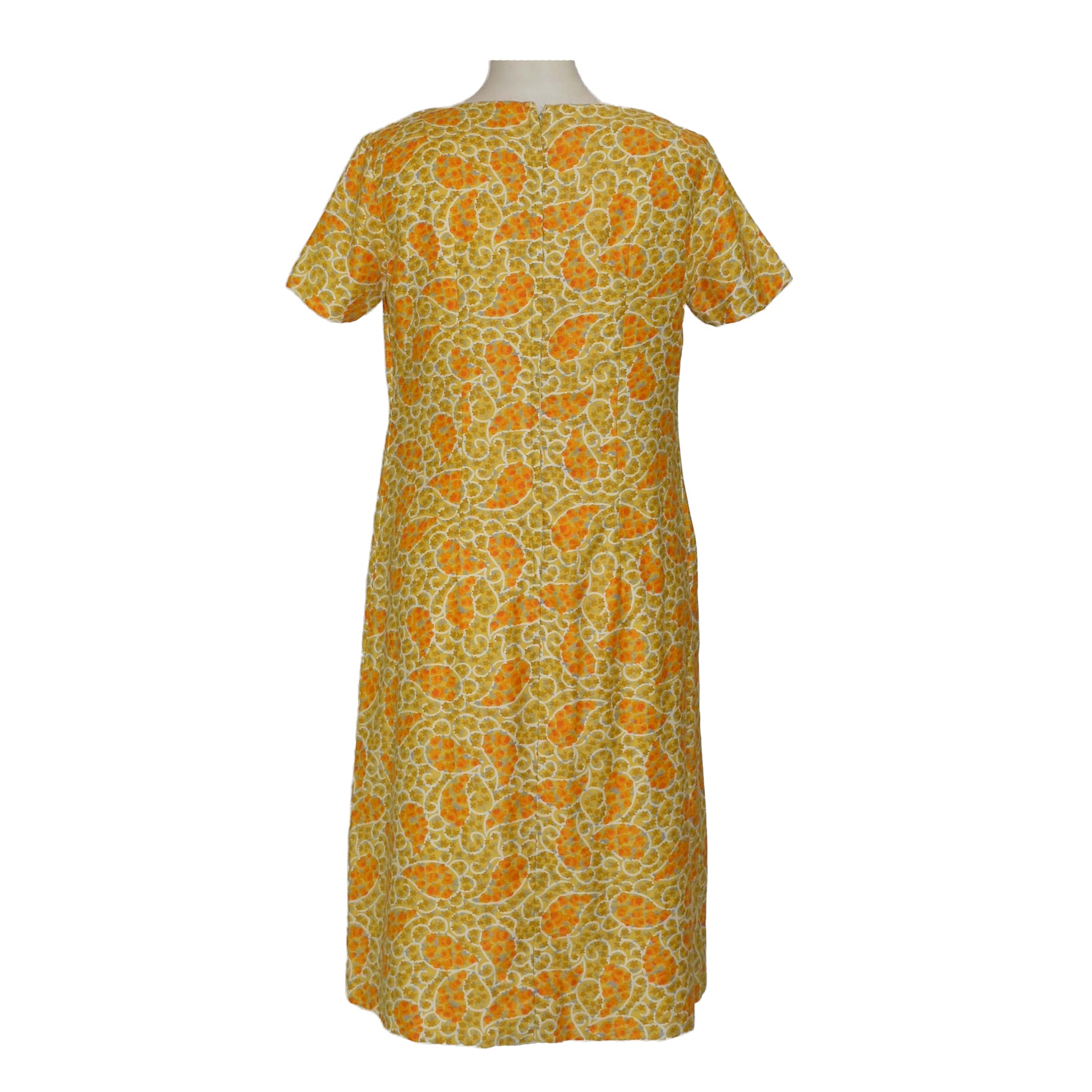 A cute 1960’s floral print shift dress. With short sleeves and contrast inset panel to the neckline. Fully lined in a light cotton gauze. A deep hem with scope for adding to the length. This garment was handmade.