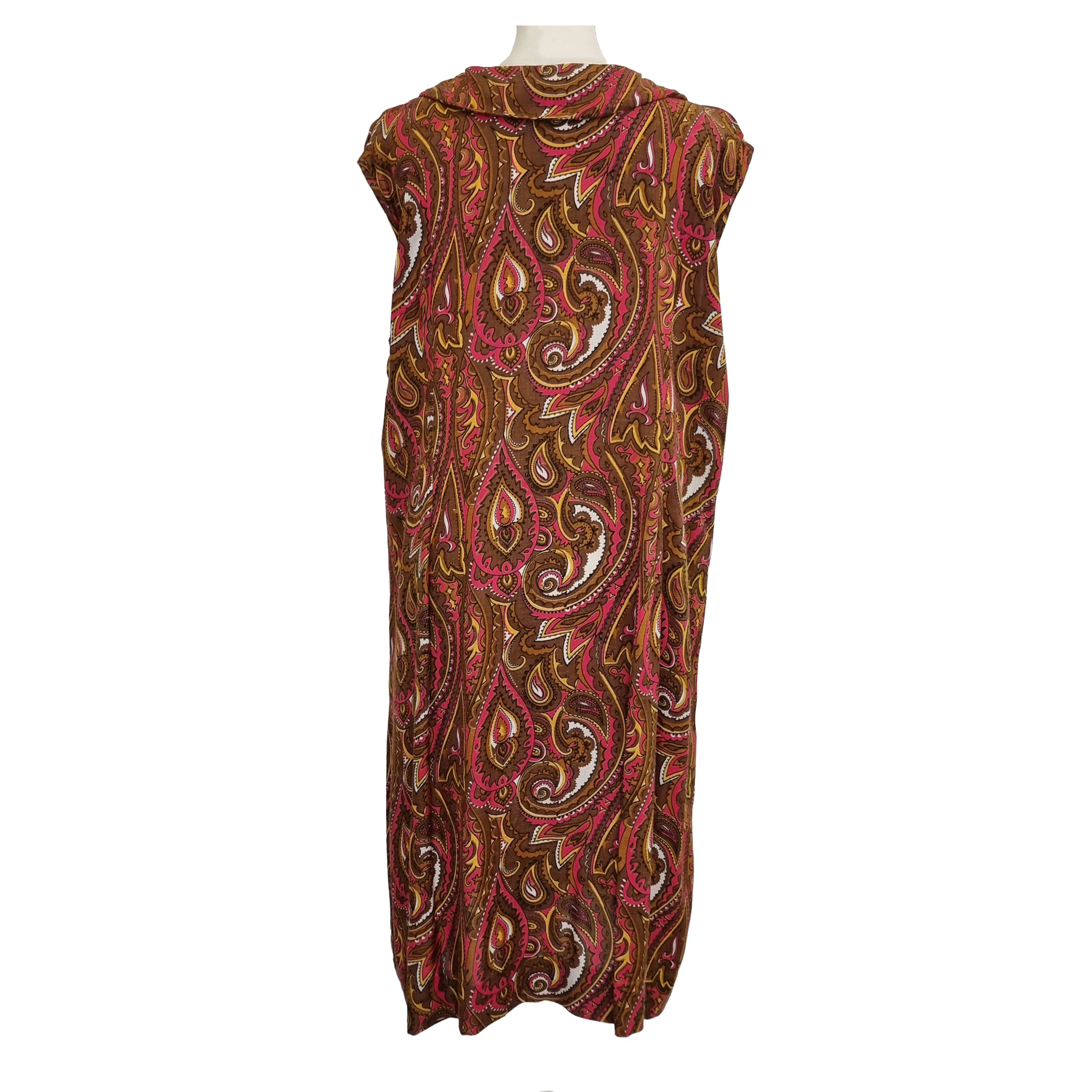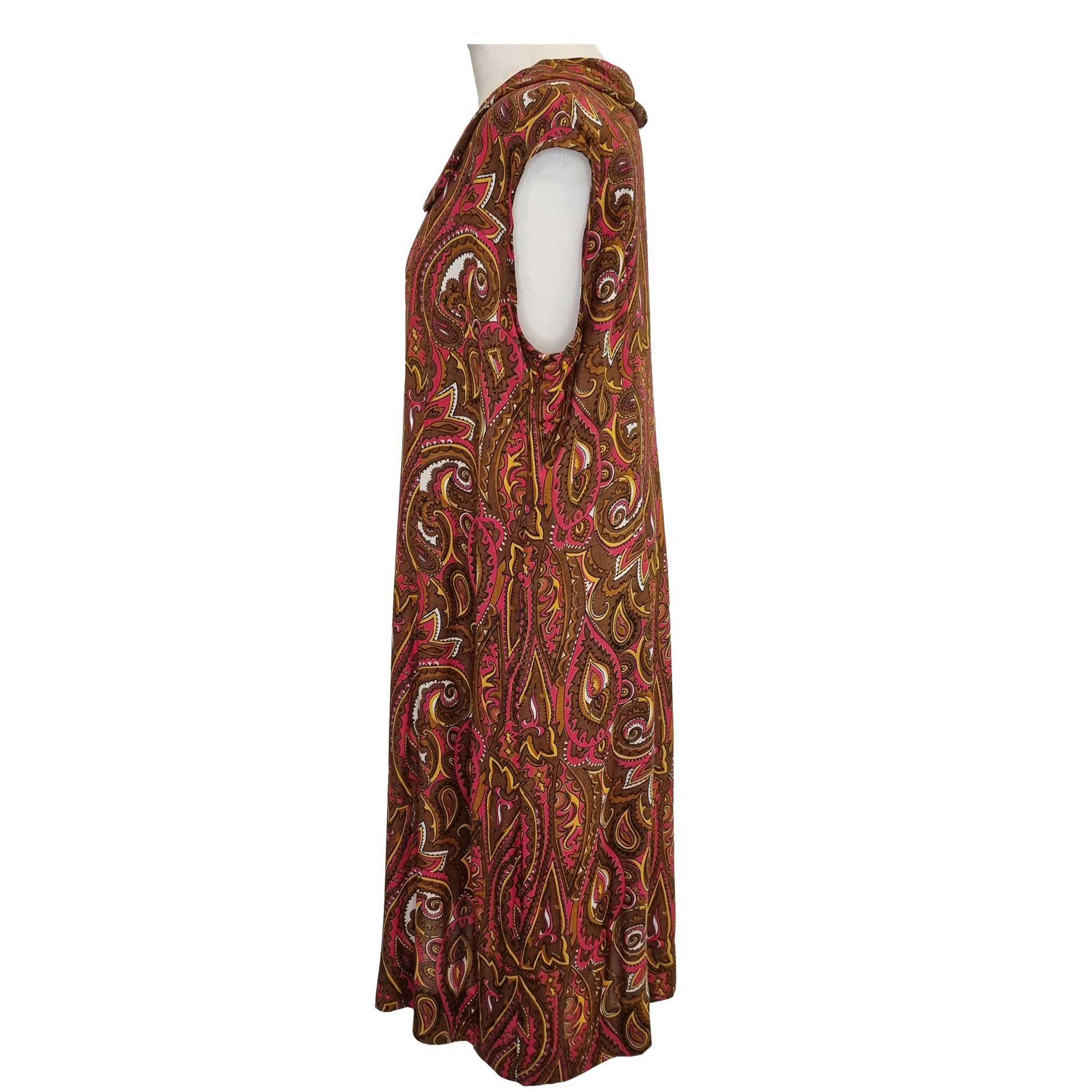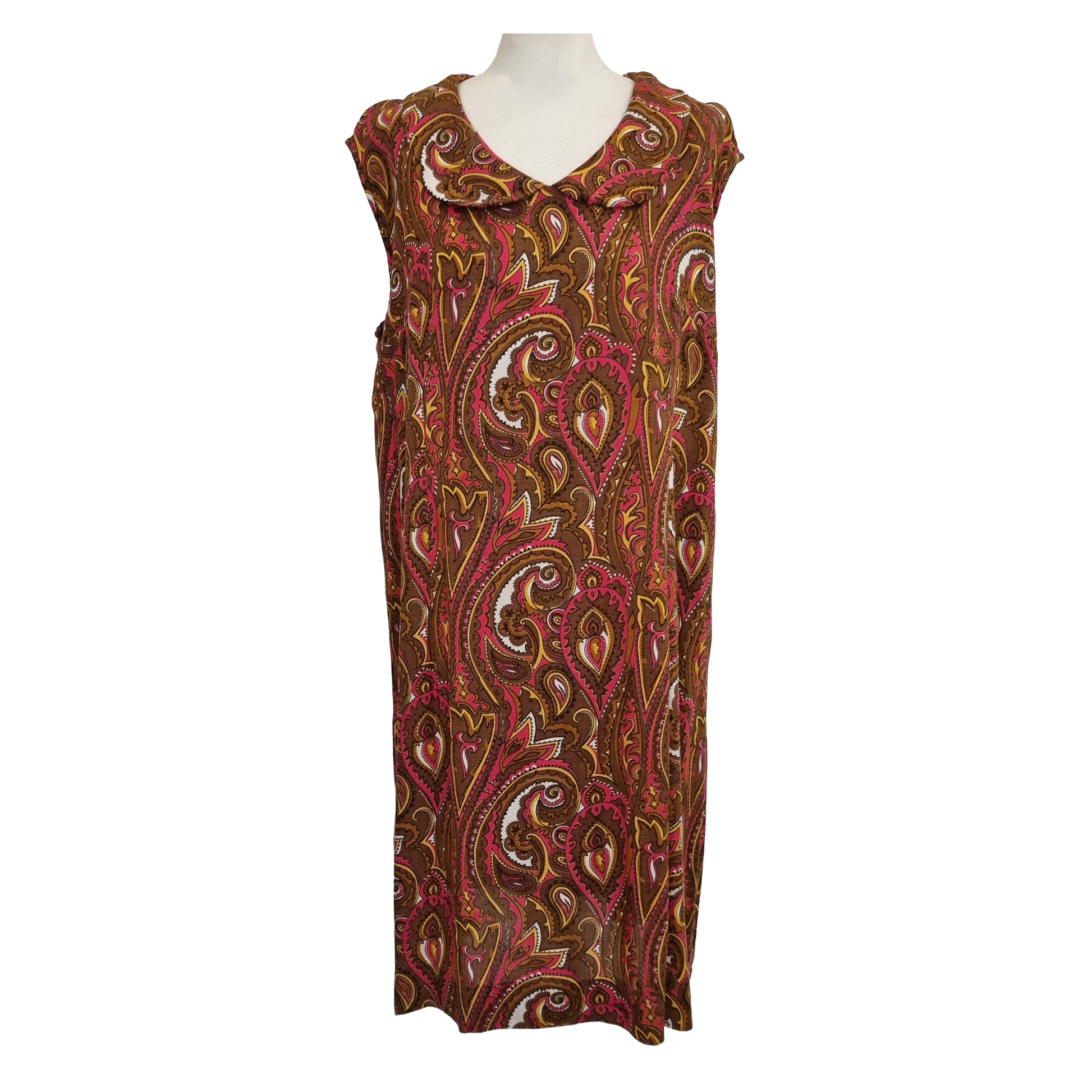 A lovely easy wear vintage 1960s shift dress in a beautiful paisley pattern using a strong colour palette. Sleeveless. The cute penny collars work so well with the curves in the surface pattern of this dress.