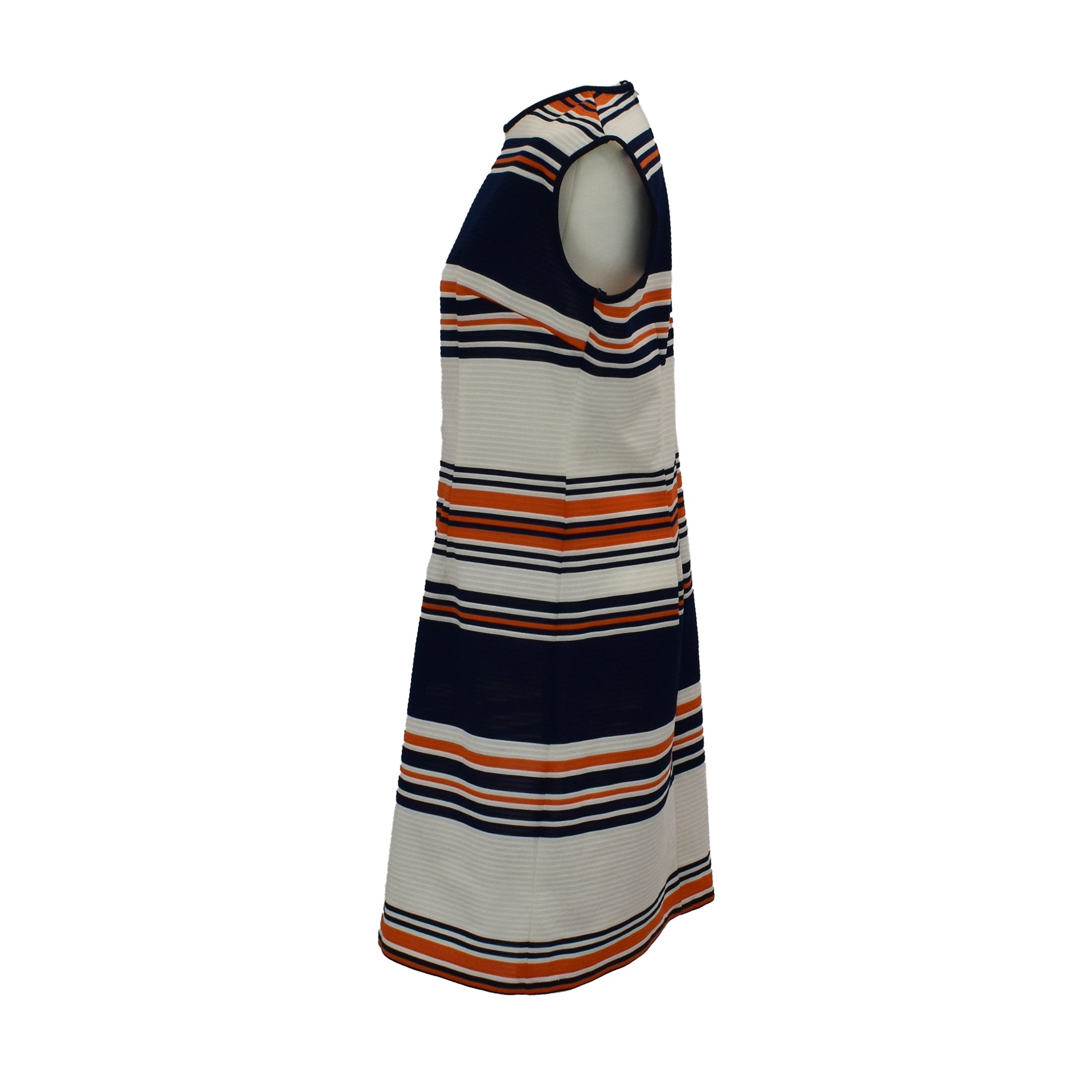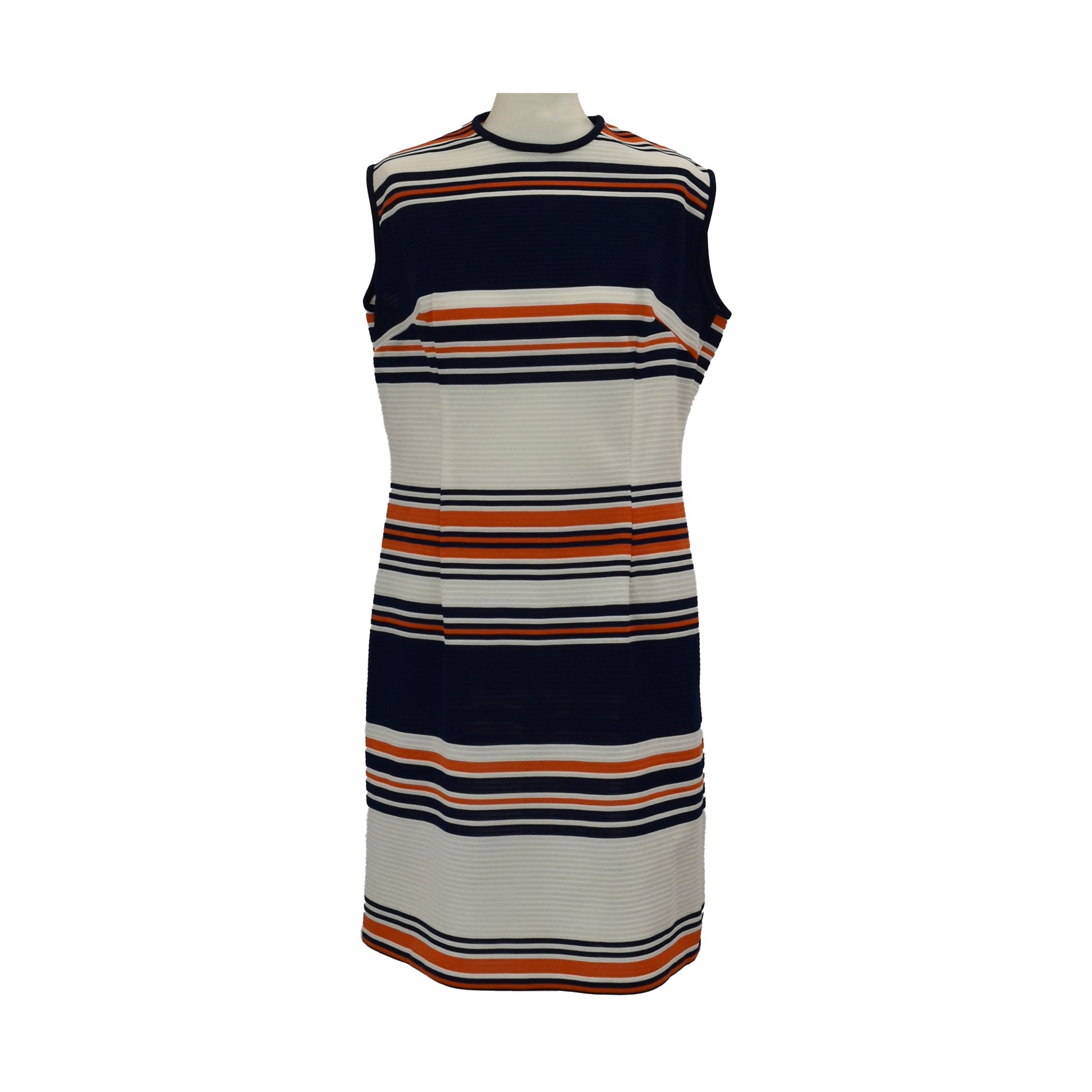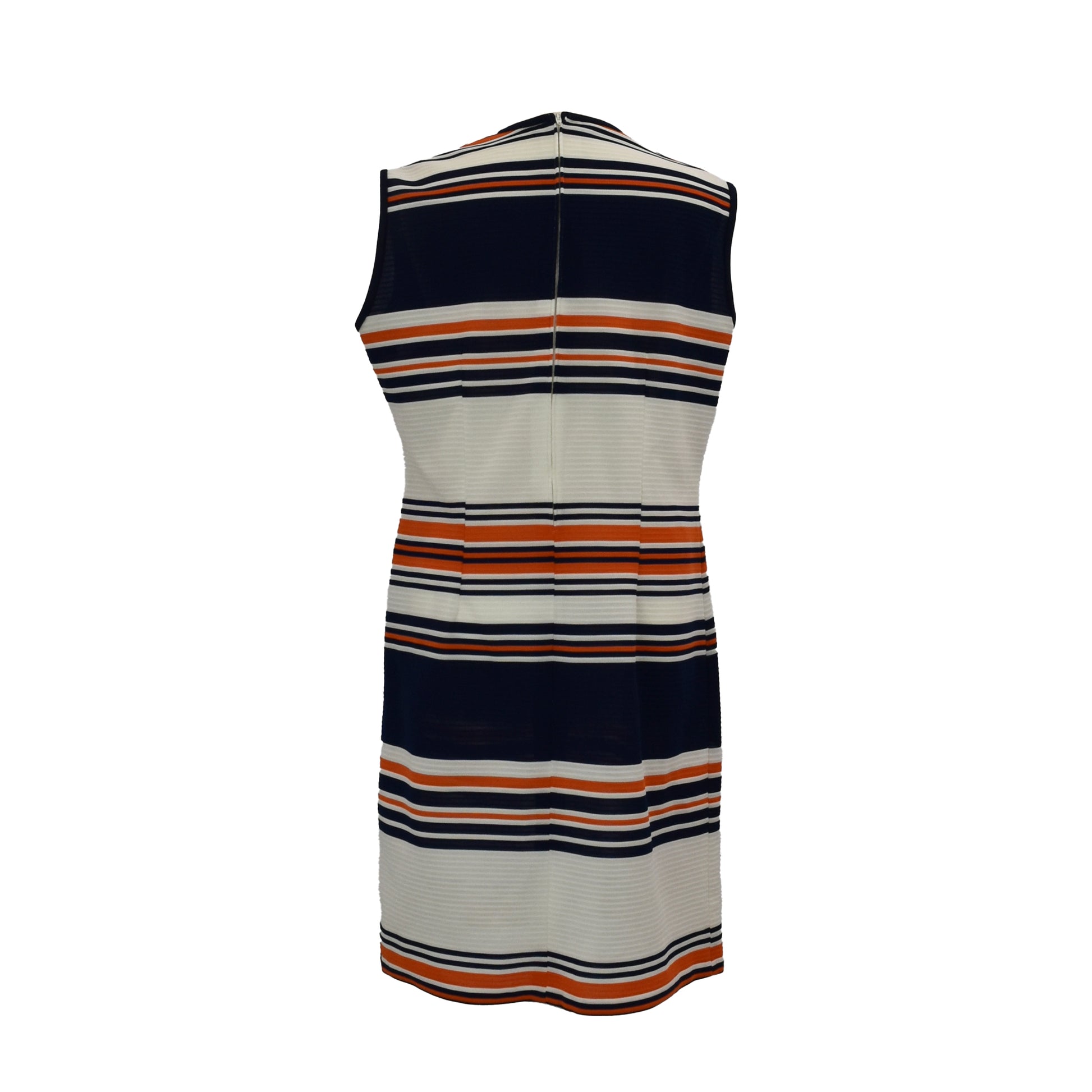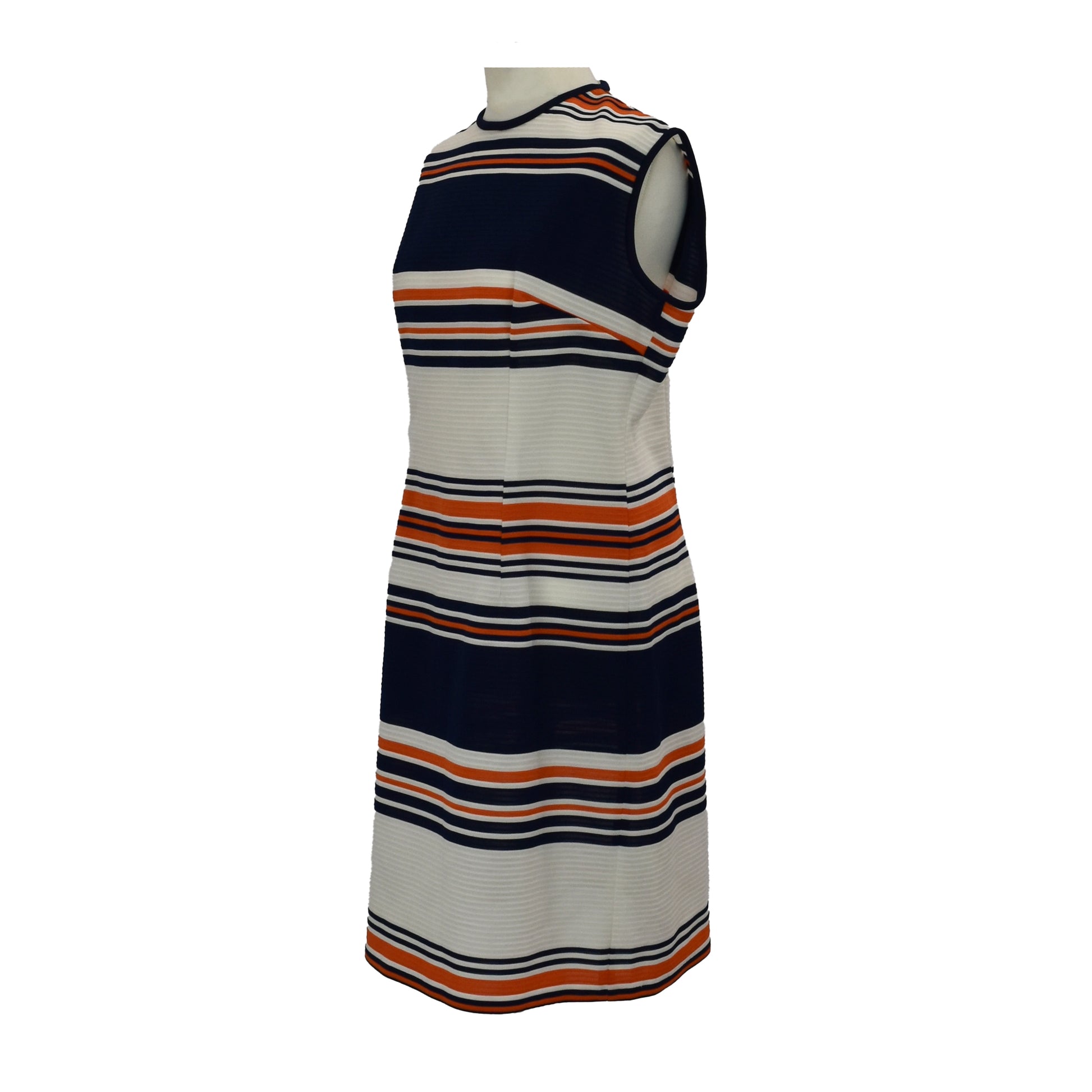 Fab vintage 60’s mod dress with bold stripes of navy blue and orange on white. Contrast piping on neckline and armholes.