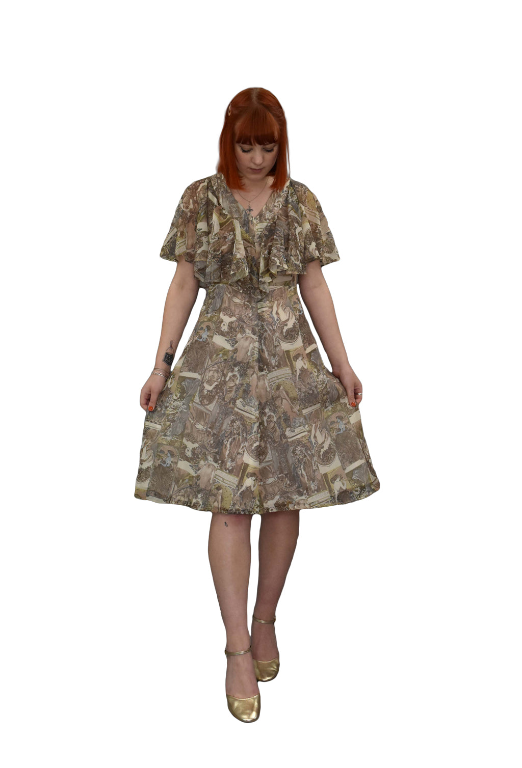 Just beautiful. Vintage 70’s art nouveau print knee length dress with angel sleeve and full skirt
