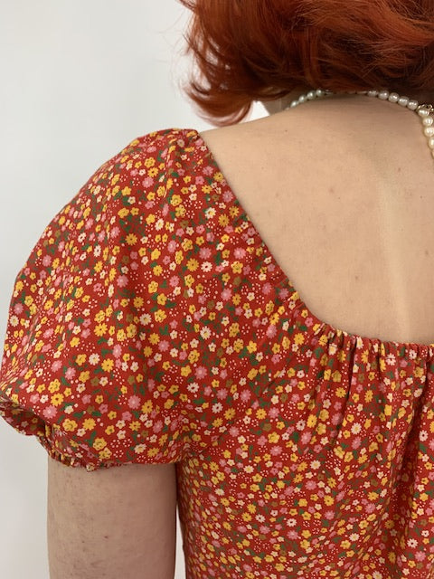 Betty Barclay vintage 1970’s dress in a ditsy red floral print. With tiered skirt with ribbon trim detail. Elasticated neckline and puff sleeves. Back zipper. Midi length.