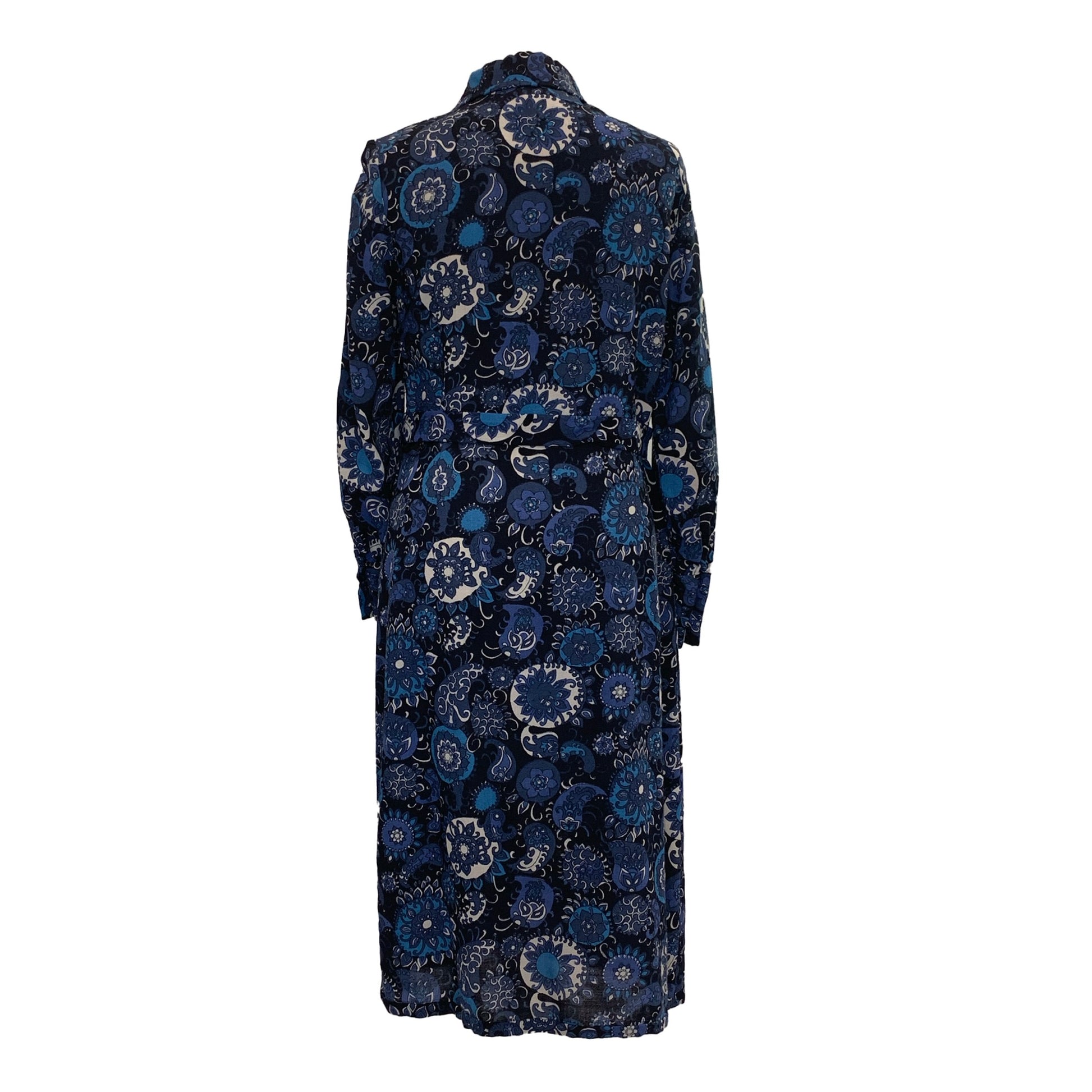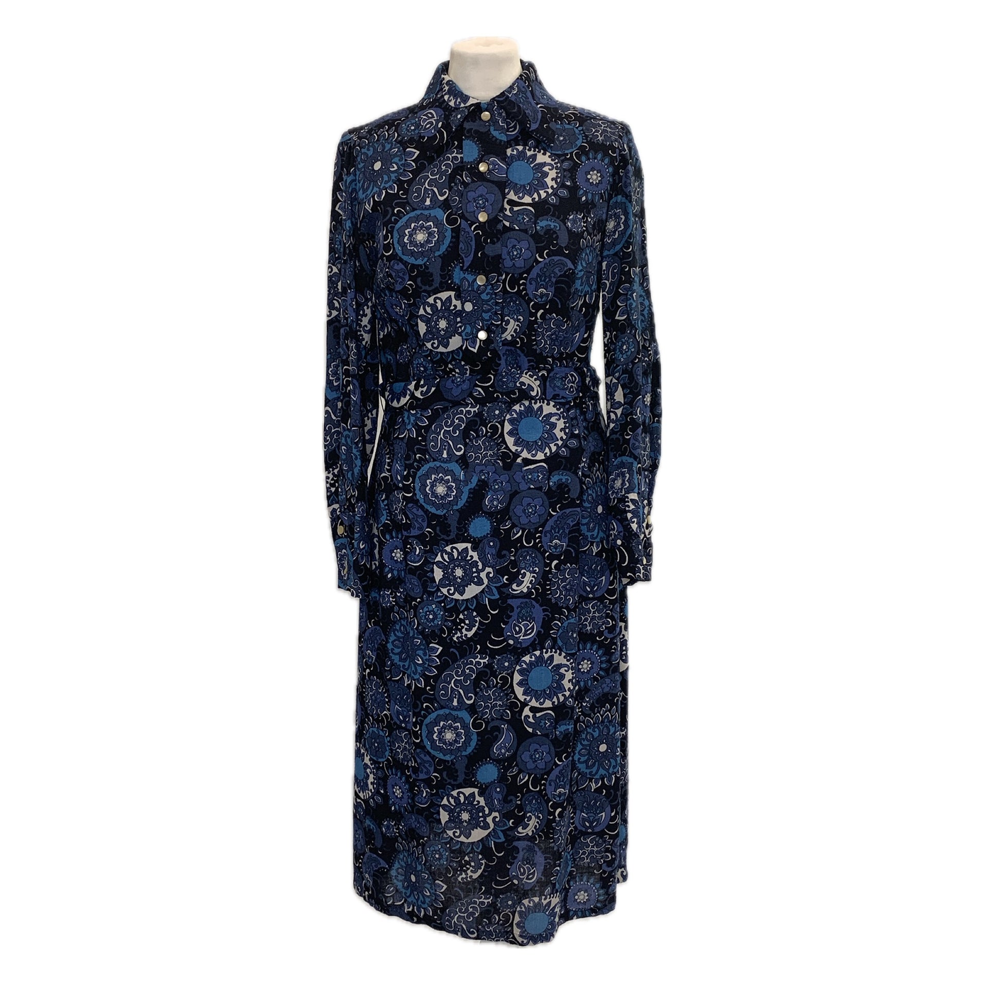 Just fab! Lightweight wool dress with pearlescent button-down front detailing and original self coloured belt. High neck with deep sharp collars. Long sleeves ending in deep cuffs and double buttons. Oversized paisley and wild stylised flower print.