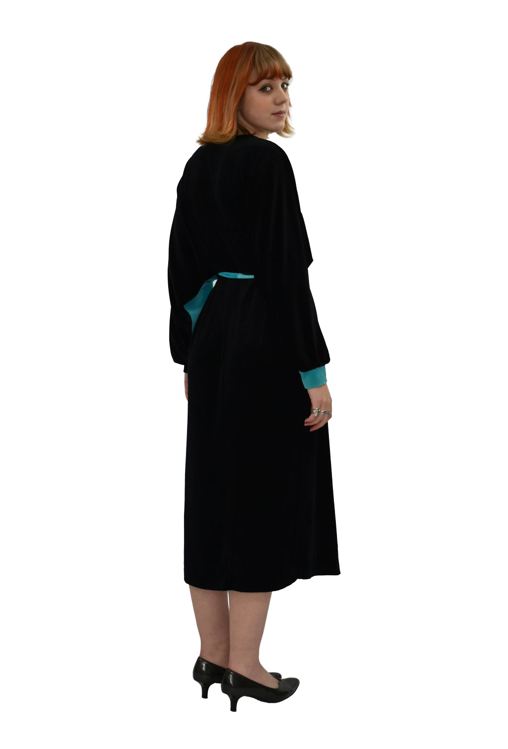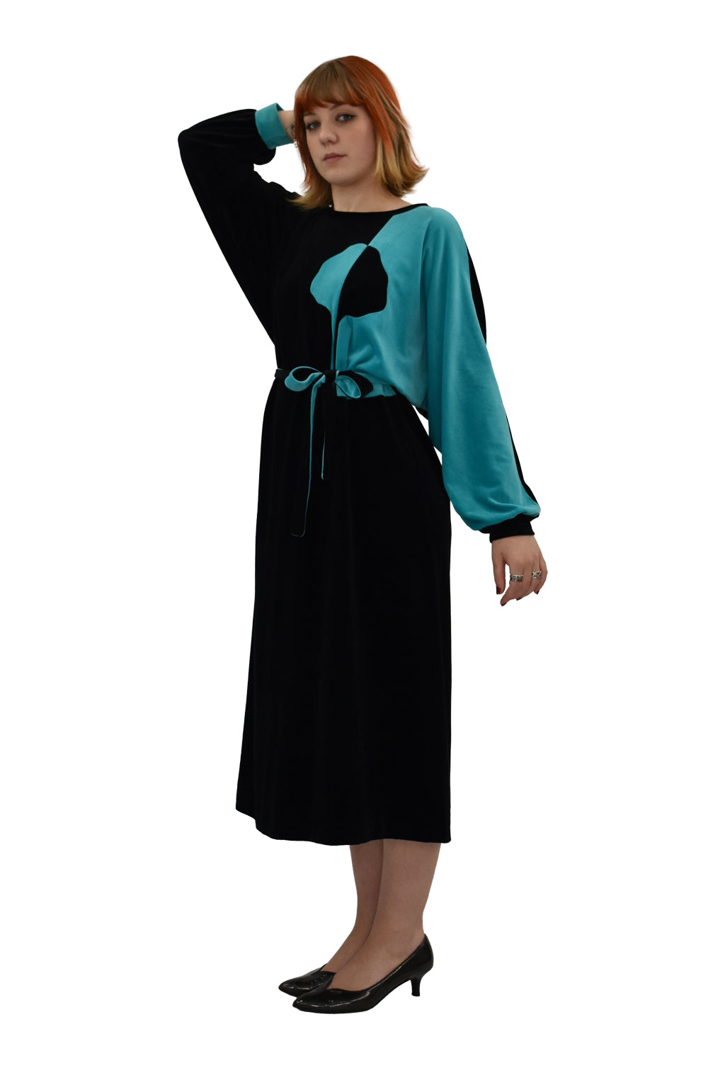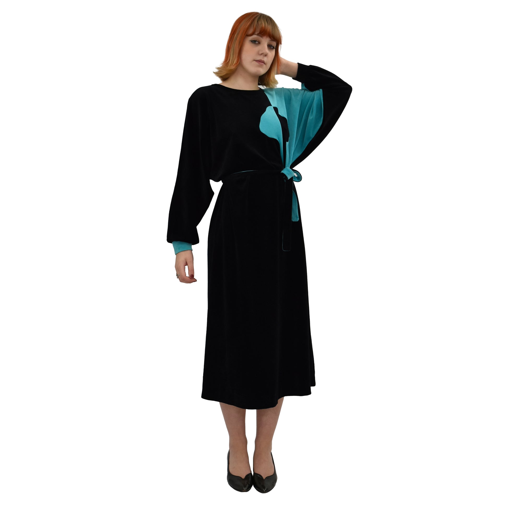 Fabulous beautifully soft velvet dress with a colour-block detail featuring an abstract ginkgo leaf motif to front bodice and left sleeve. High slashed neckline and batwing sleeves, finishing with contrasting colour at sleeve cuffs. Original double-faced contrasting velvet belt.