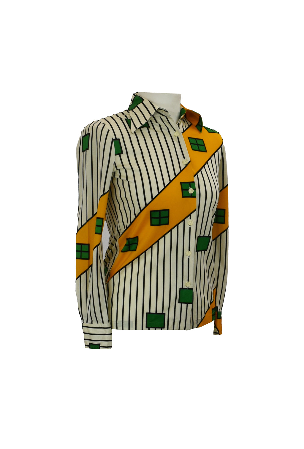 Fabulous 1970’s dagger collar fitted shirt in a striking geometric print.