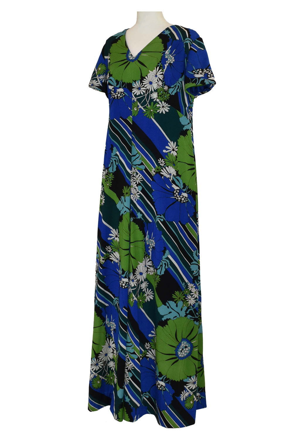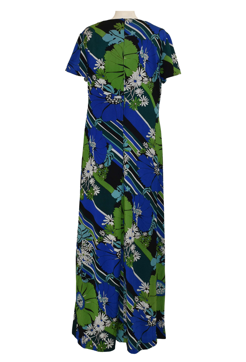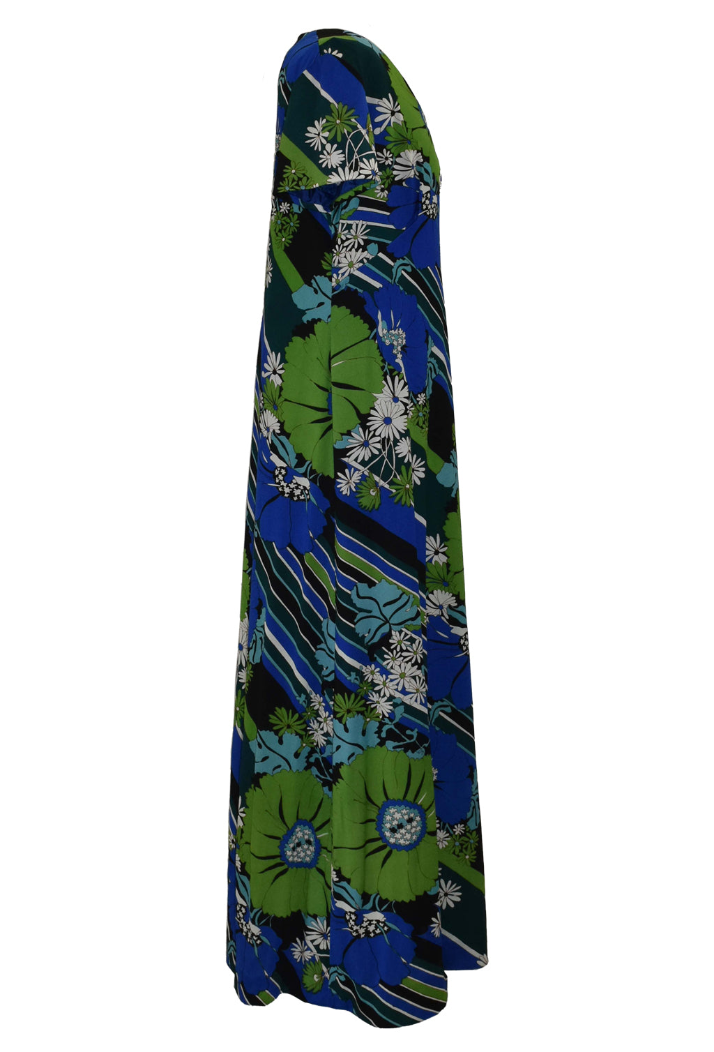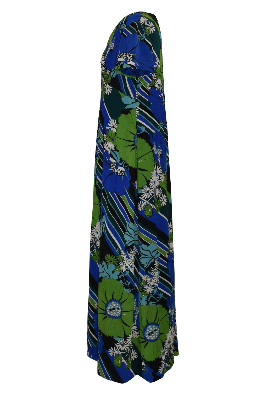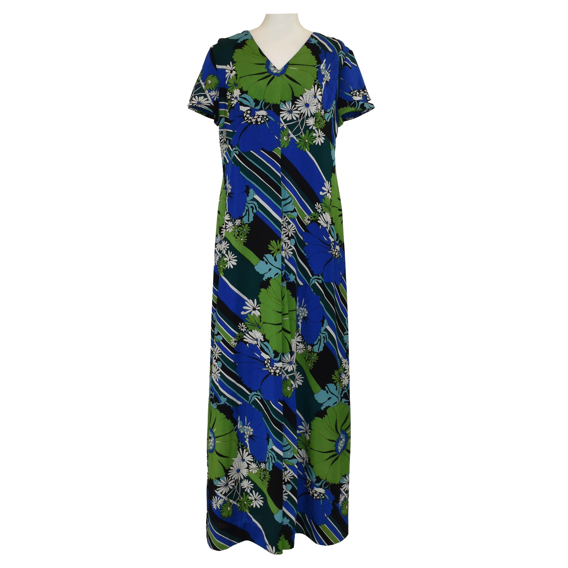 Brilliant vintage 1970’s flower power maxi dress with a geometric twist. In a vibrant blue, green, white, and black colourway. Short sleeves, fully lined.