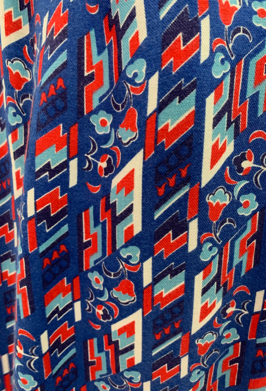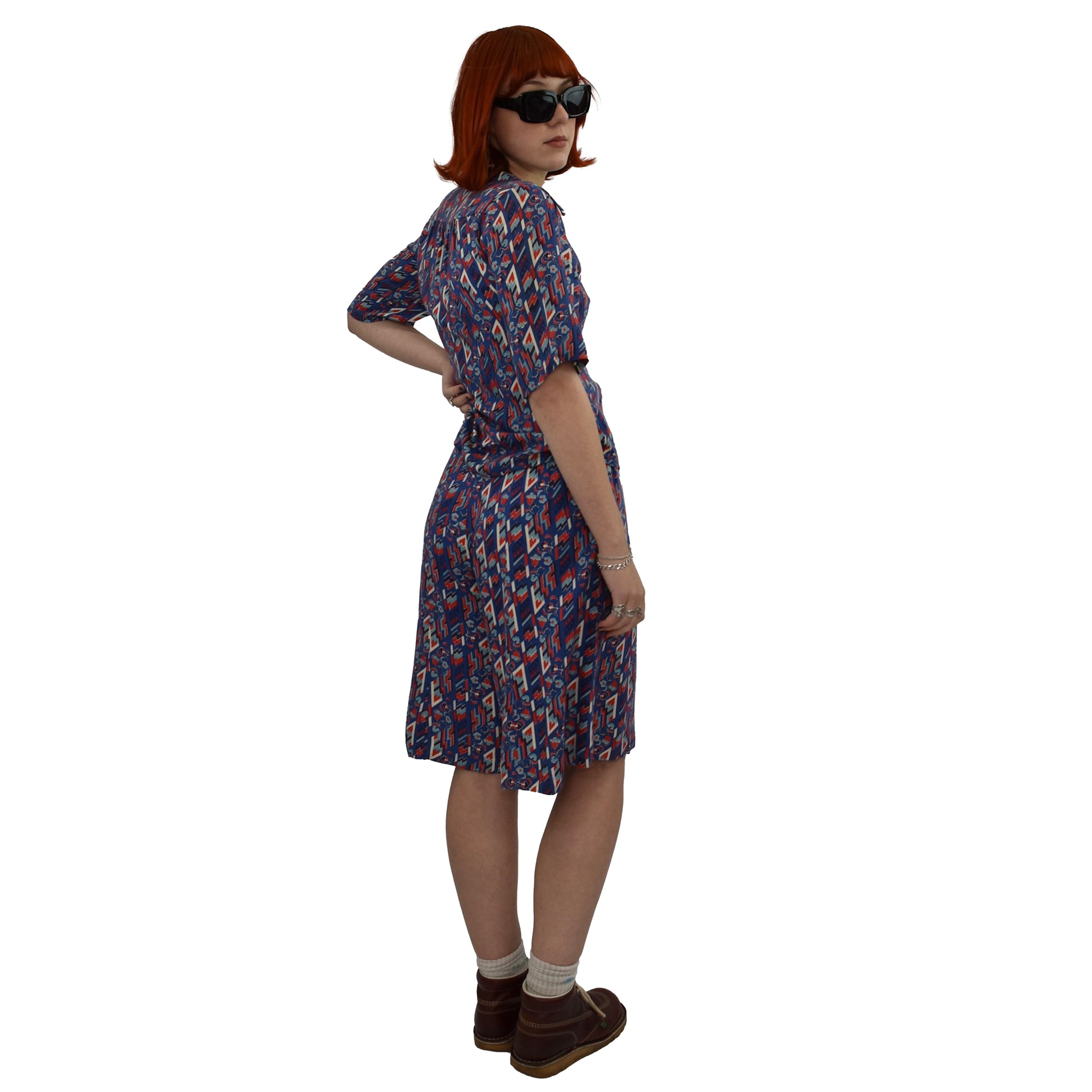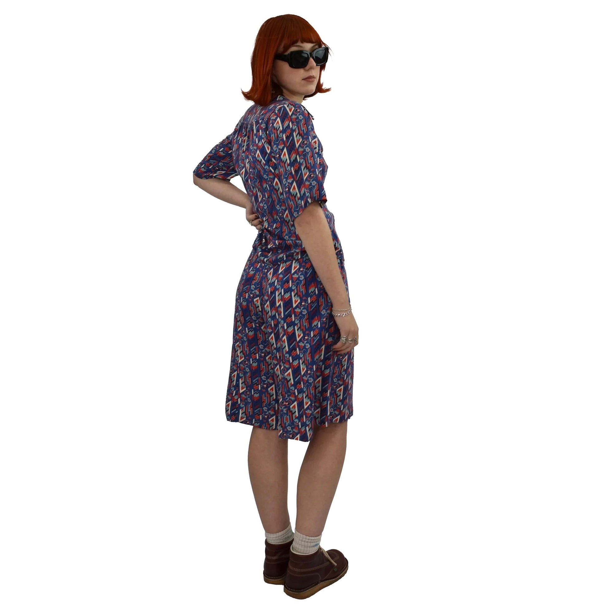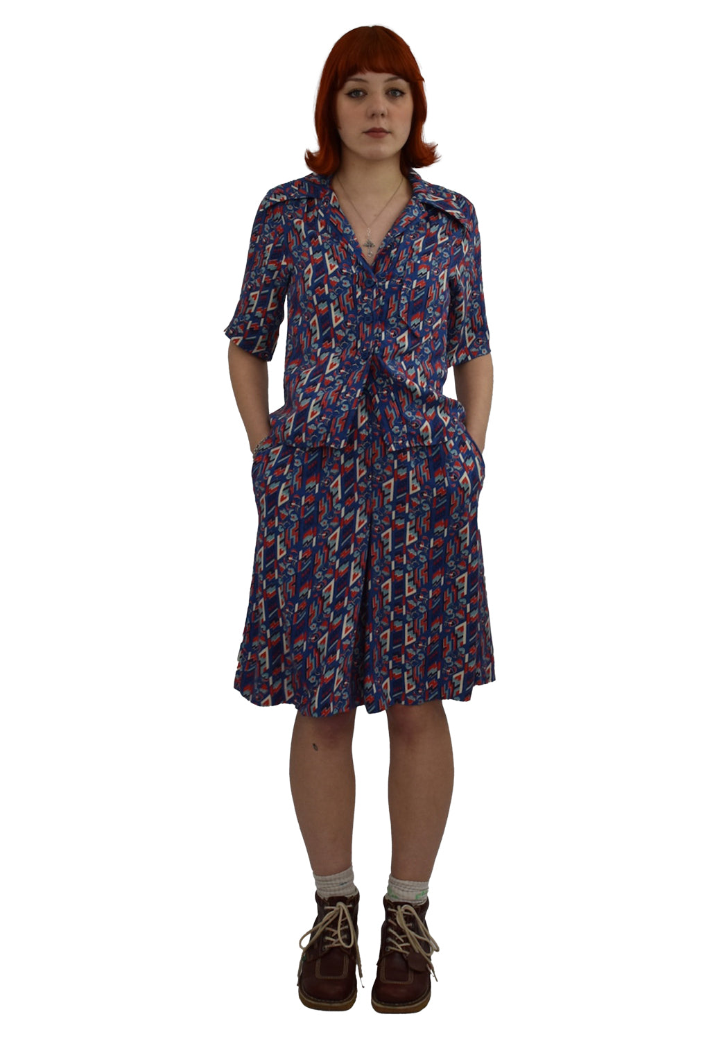 Dagger collars, blue, red and white abstract graphic print two piece shorts and button down shirt. Waist is tight! - please study measurements.