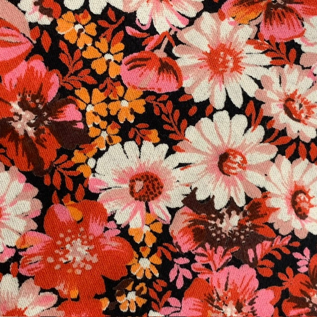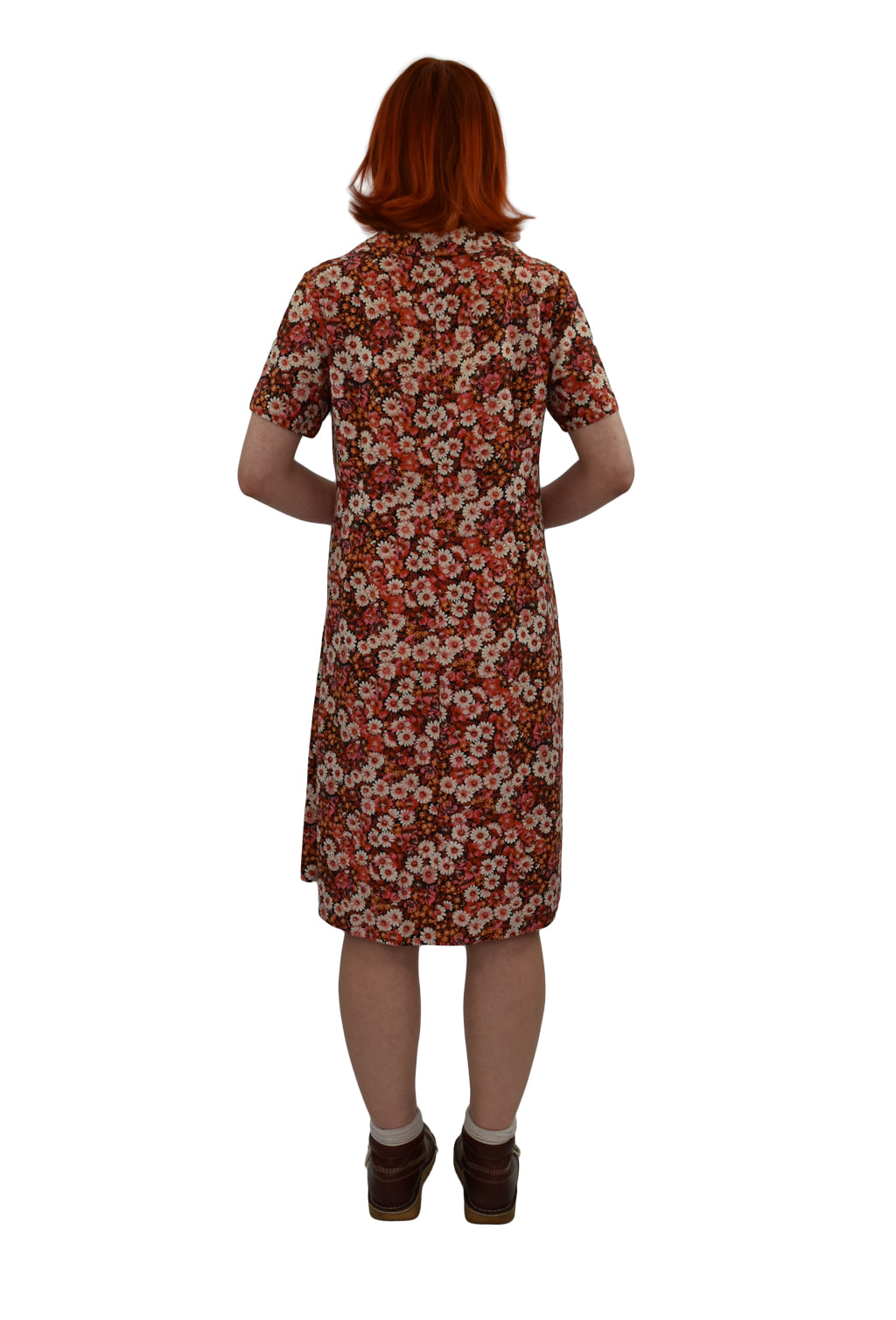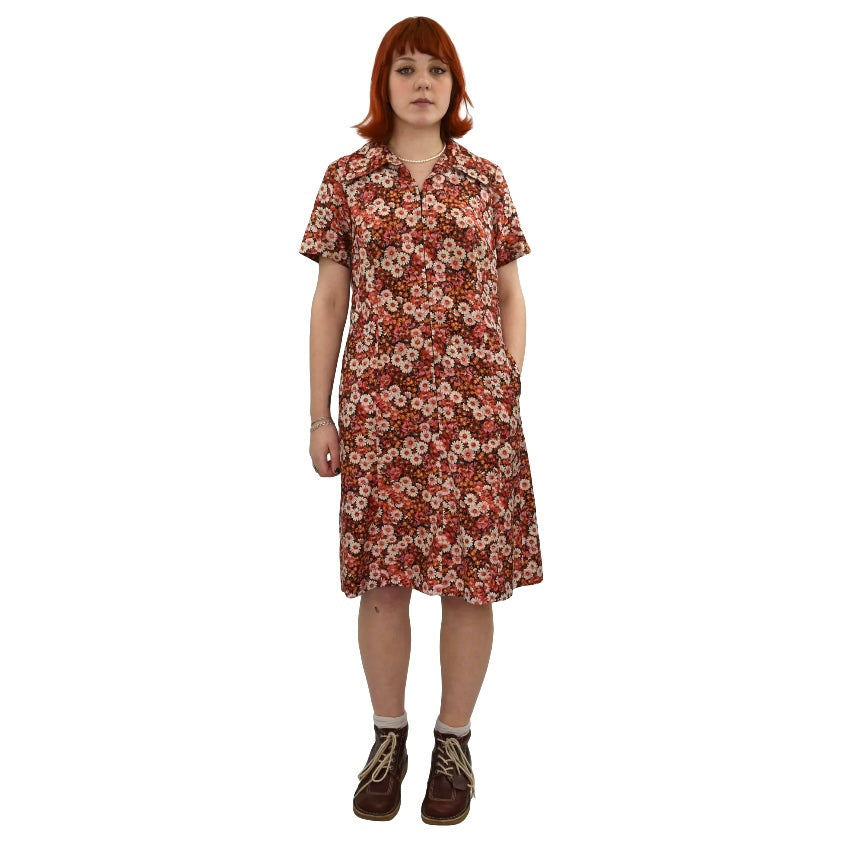 This true vintage 1970's dress is crafted from heavier weight cotton. With an eye-catching vibrant floral print and a zip up front. Dagger collars and short sleeves.
