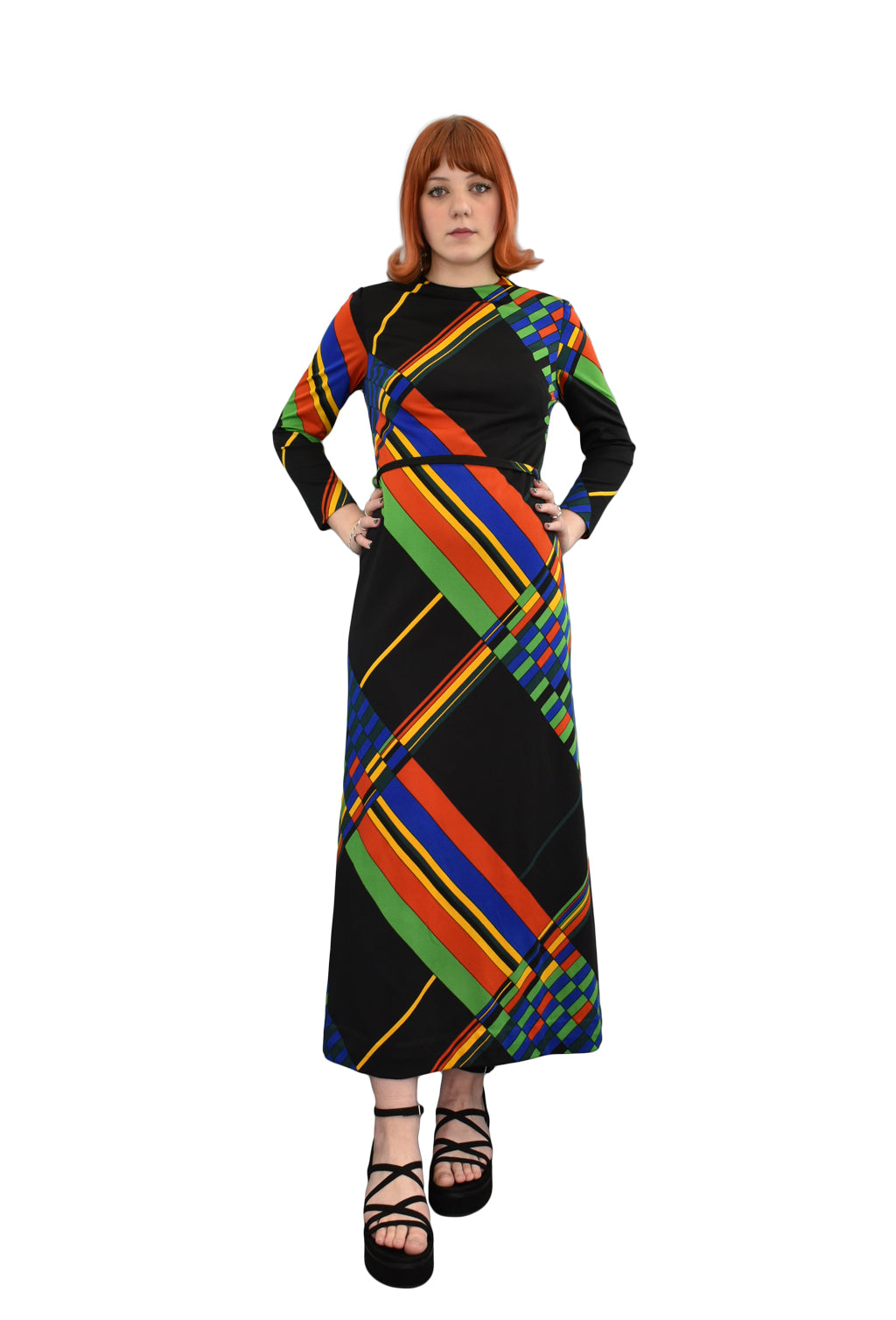 Long sleeved 1970’s true vintage dress with black base colour and large scale geometric print all over. Self-tie belt with silver ball end stoppers.