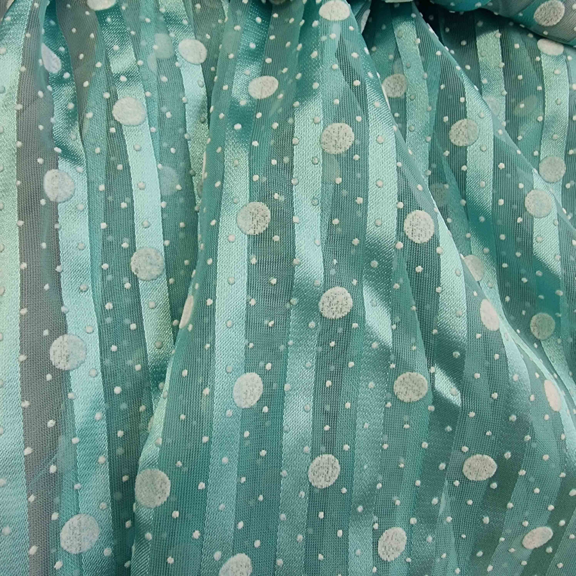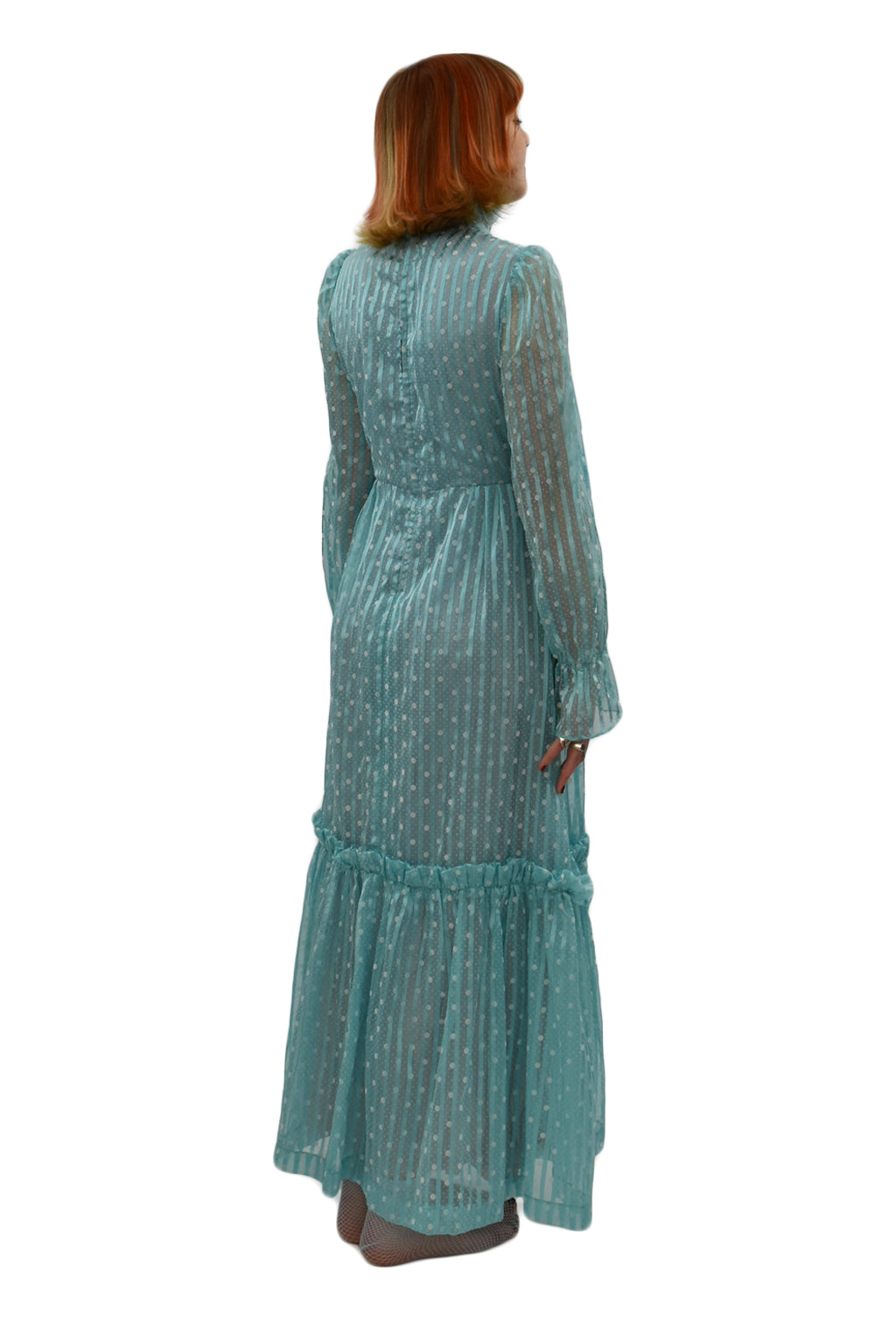 Sheer blue striped and dotty print all-over gilded era / Edwardian style maxi dress with a high frill collar, ruffle detail to tiered skirt, and long sleeves.