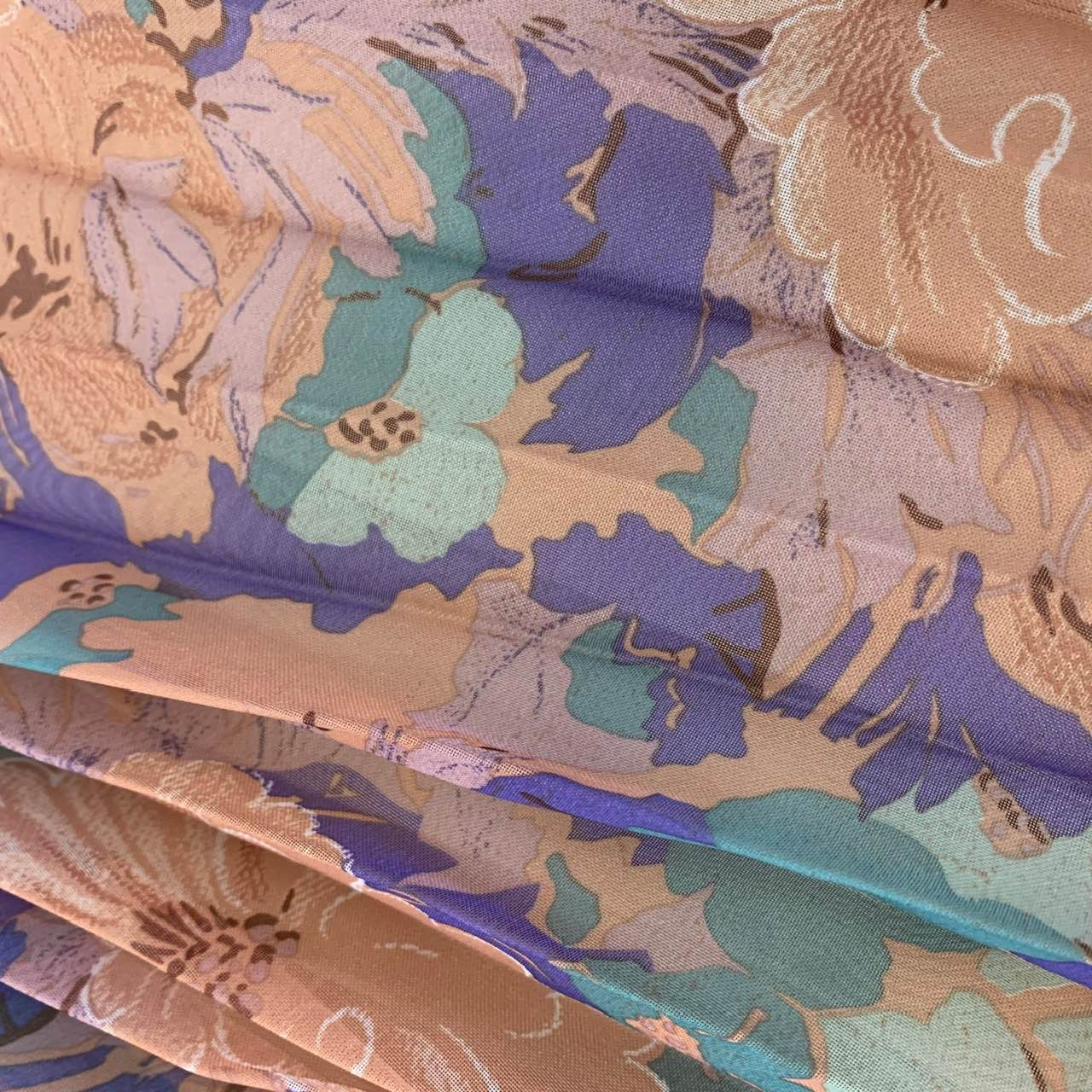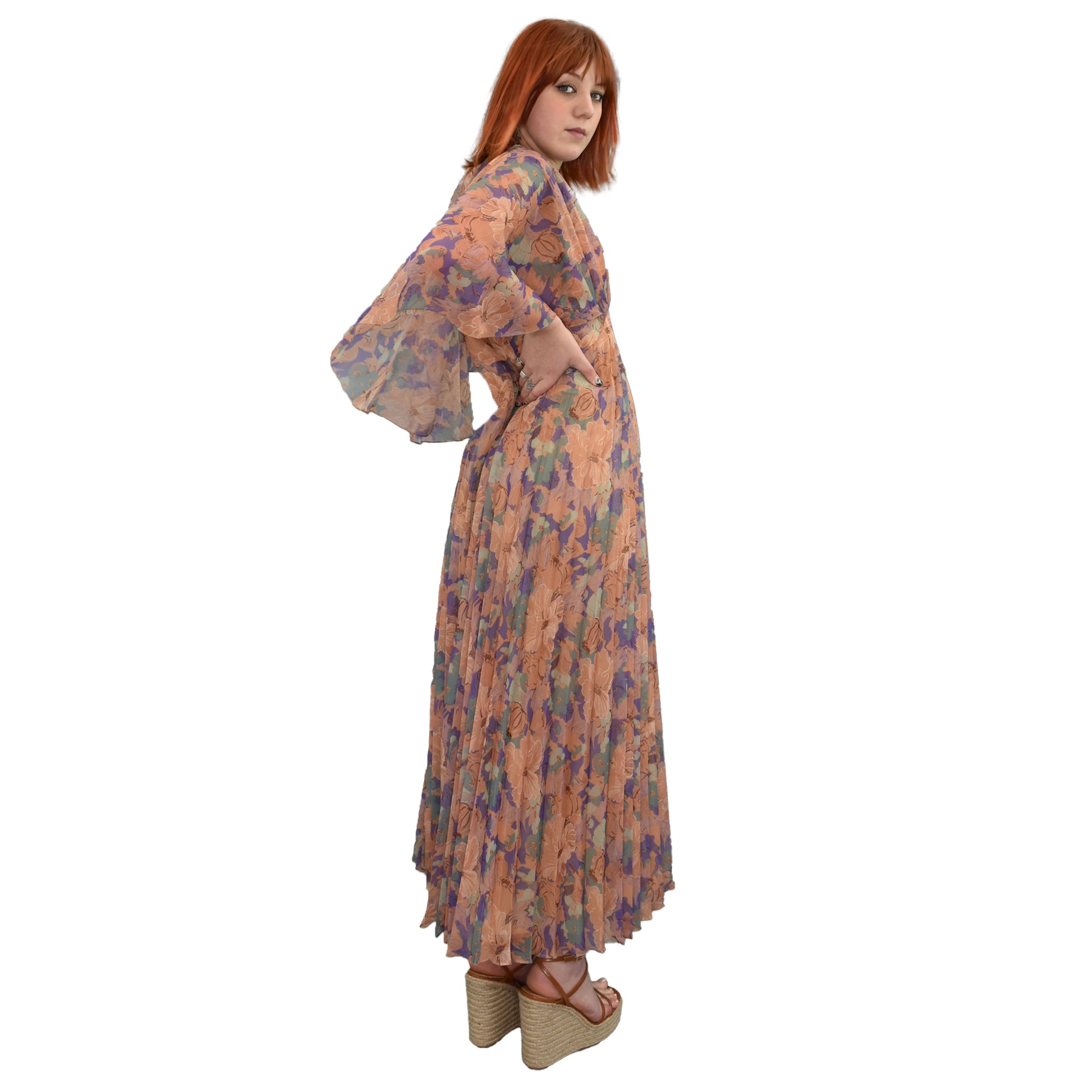1970's vintage floaty floral maxi dress with flowing cape sleeves. Pleated skirt. Colour palette is muted pastel.