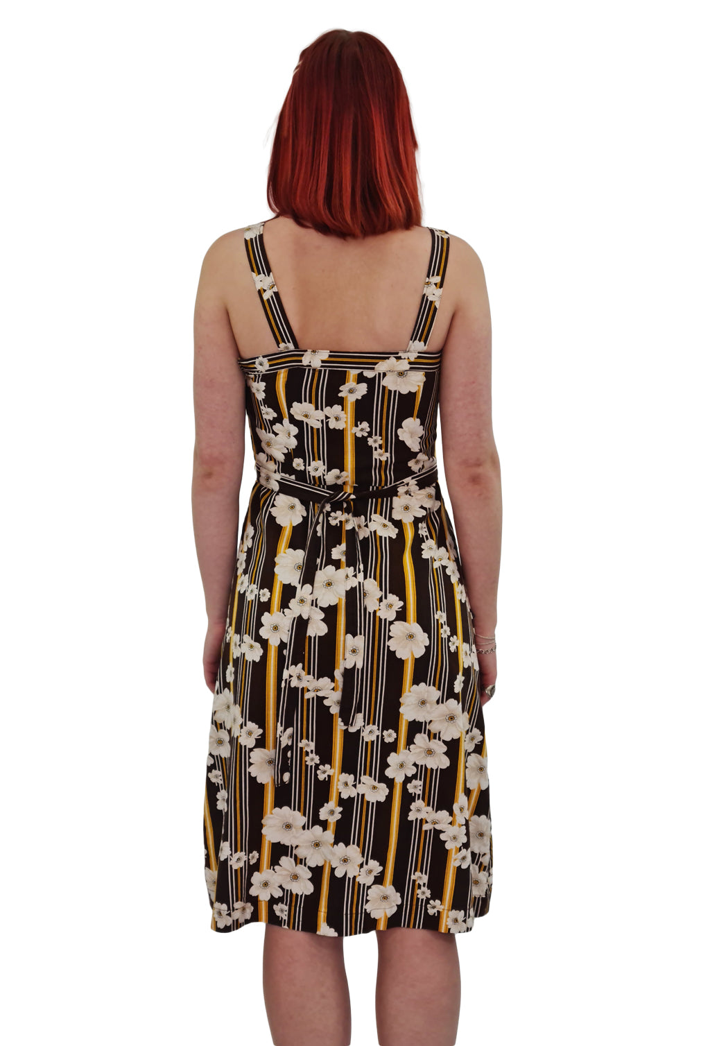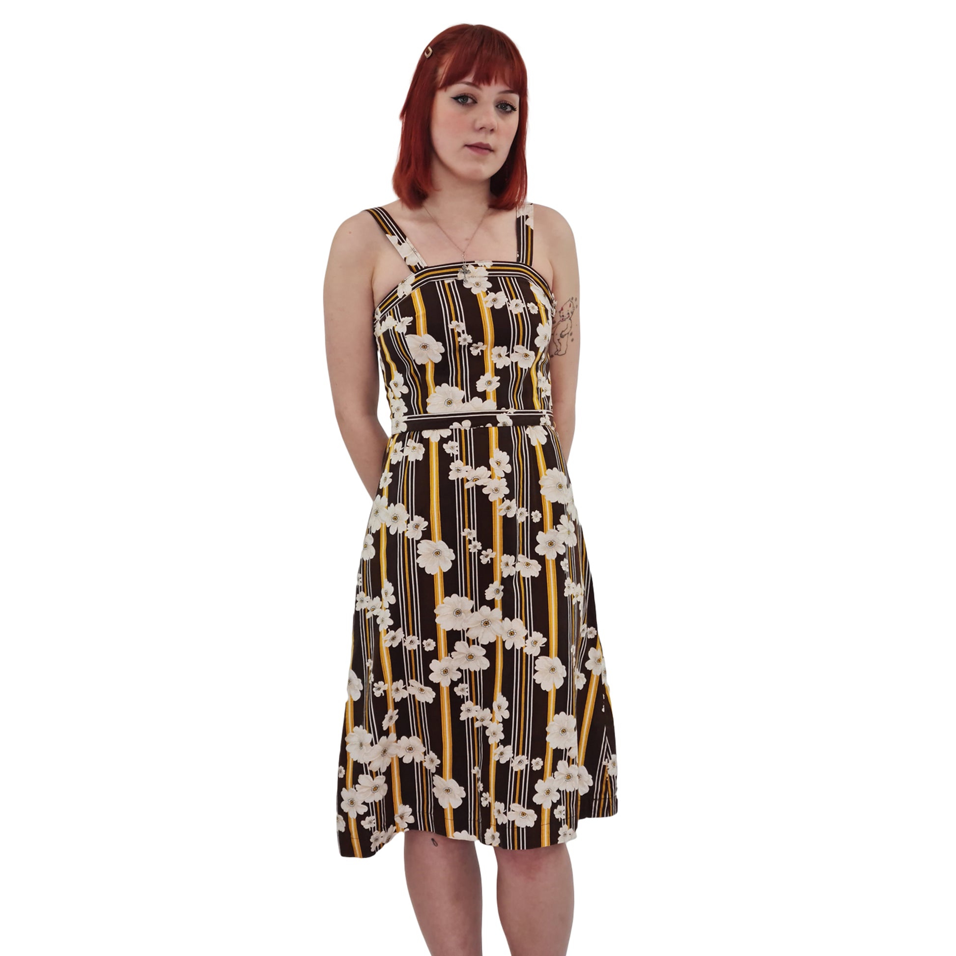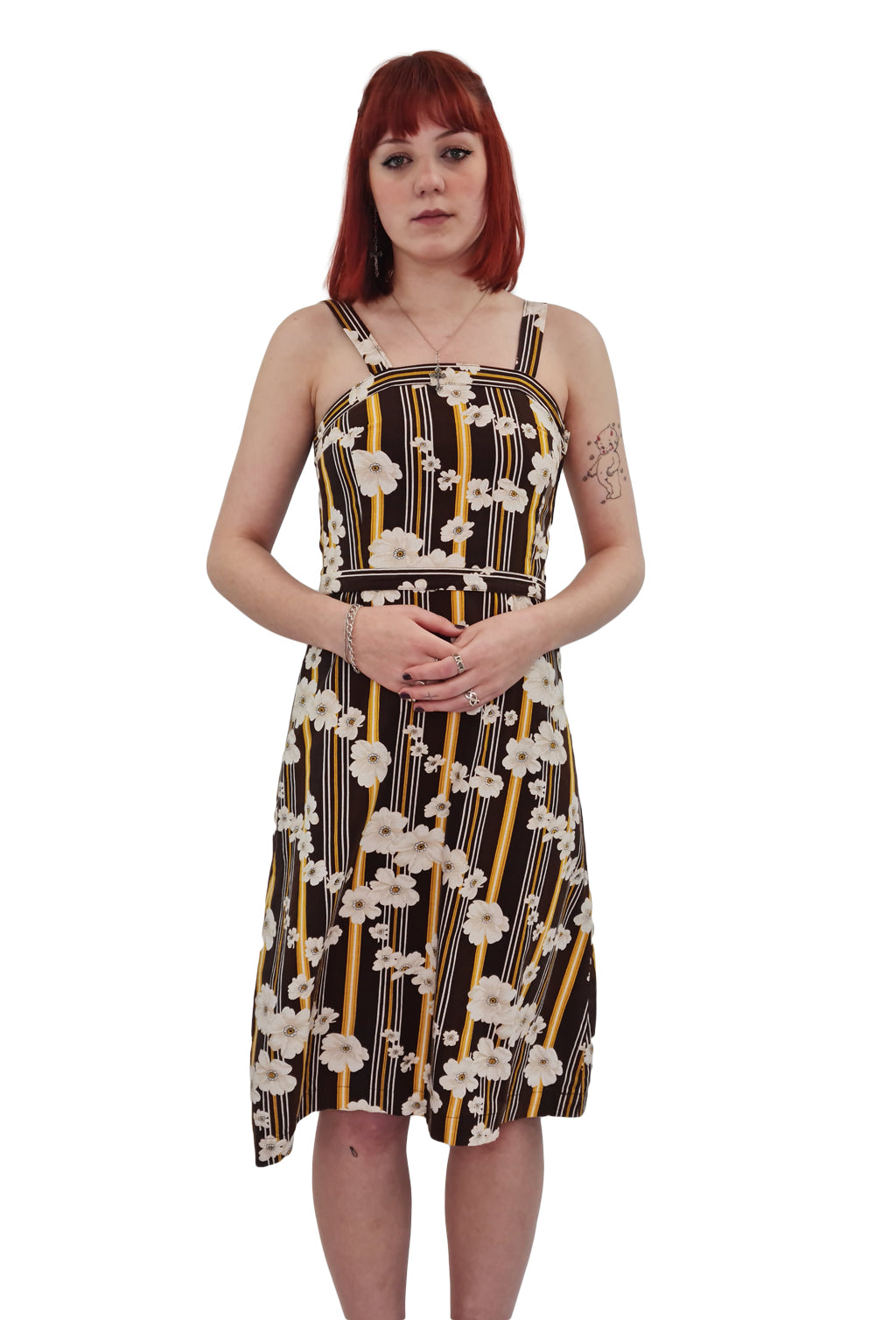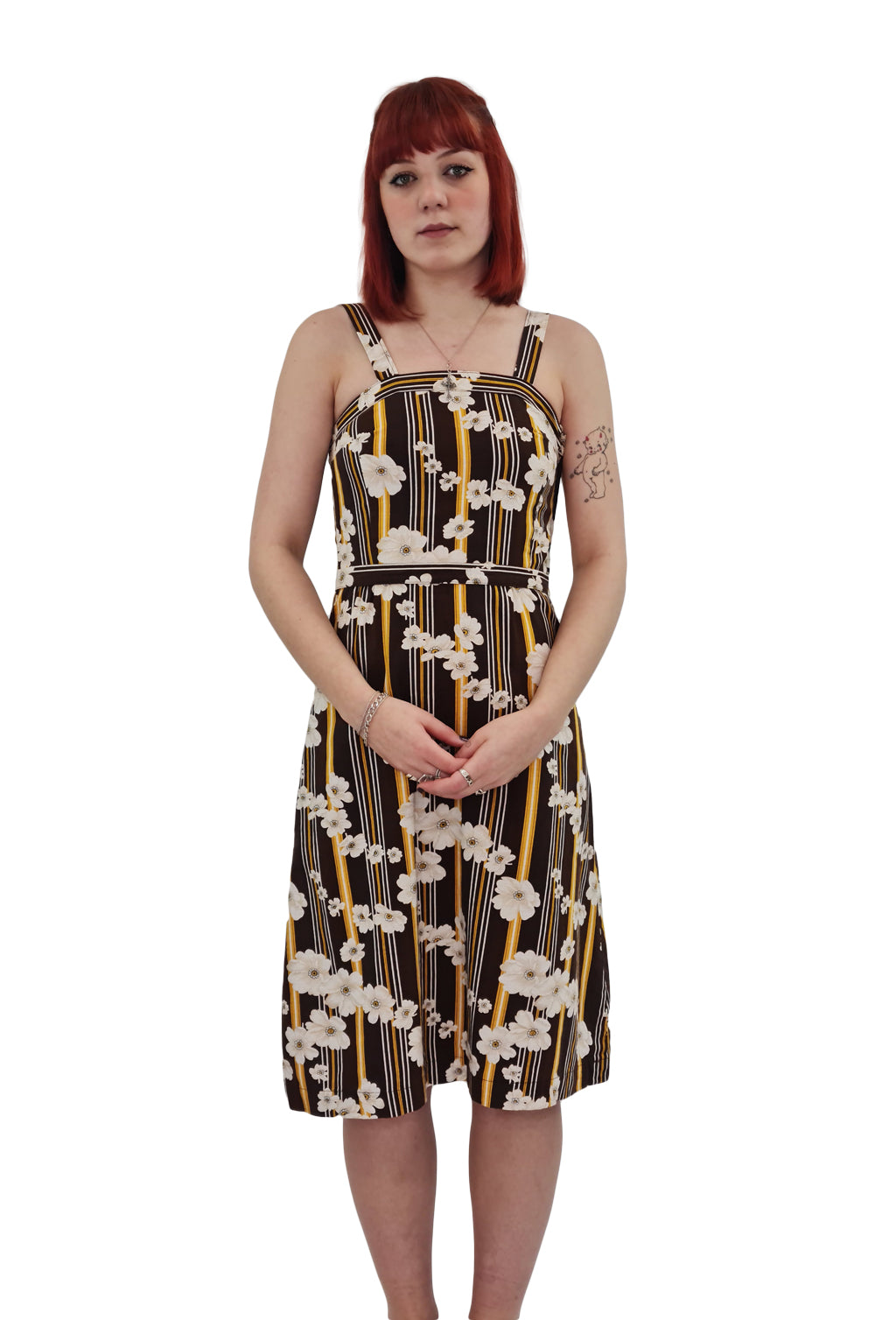 Lovely 1970's flower power print strap shoulder cotton sundress, with original self tie belt. A great piece of vintage, the textile surface pattern design is wonderful.