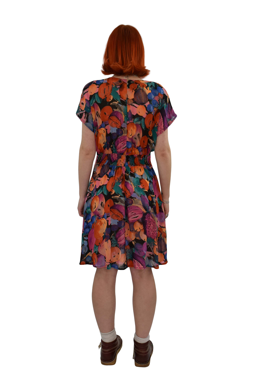 Lovely cross front abstract fruit print dress in a vibrant colourway. Softly gathered at waistline.