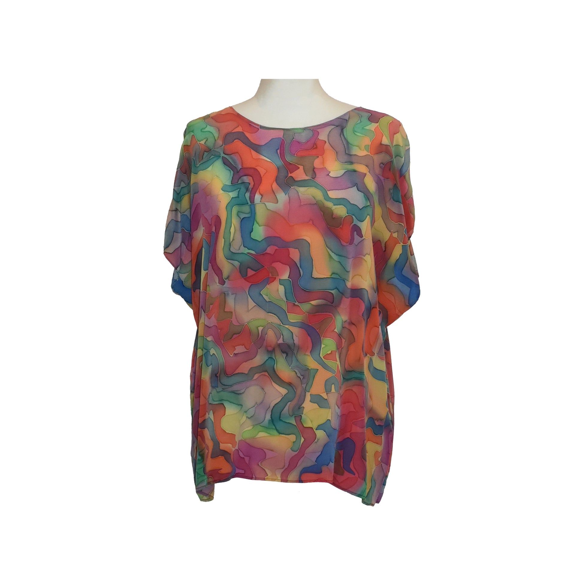 A beautiful loose fitting scoop neck silk top with an all over painterly effect in a myriad of bright colours. Lightweight silk and perfect for travel.