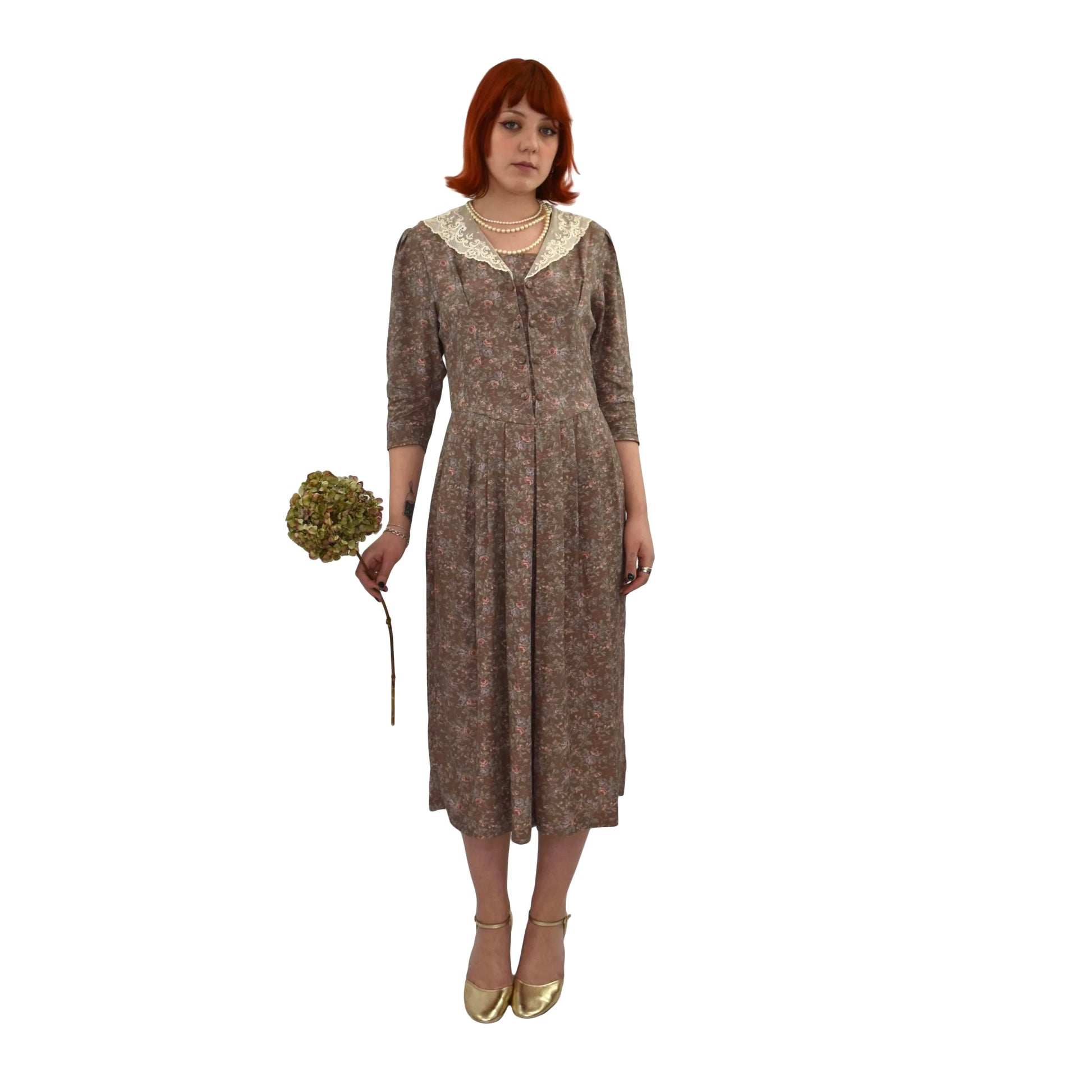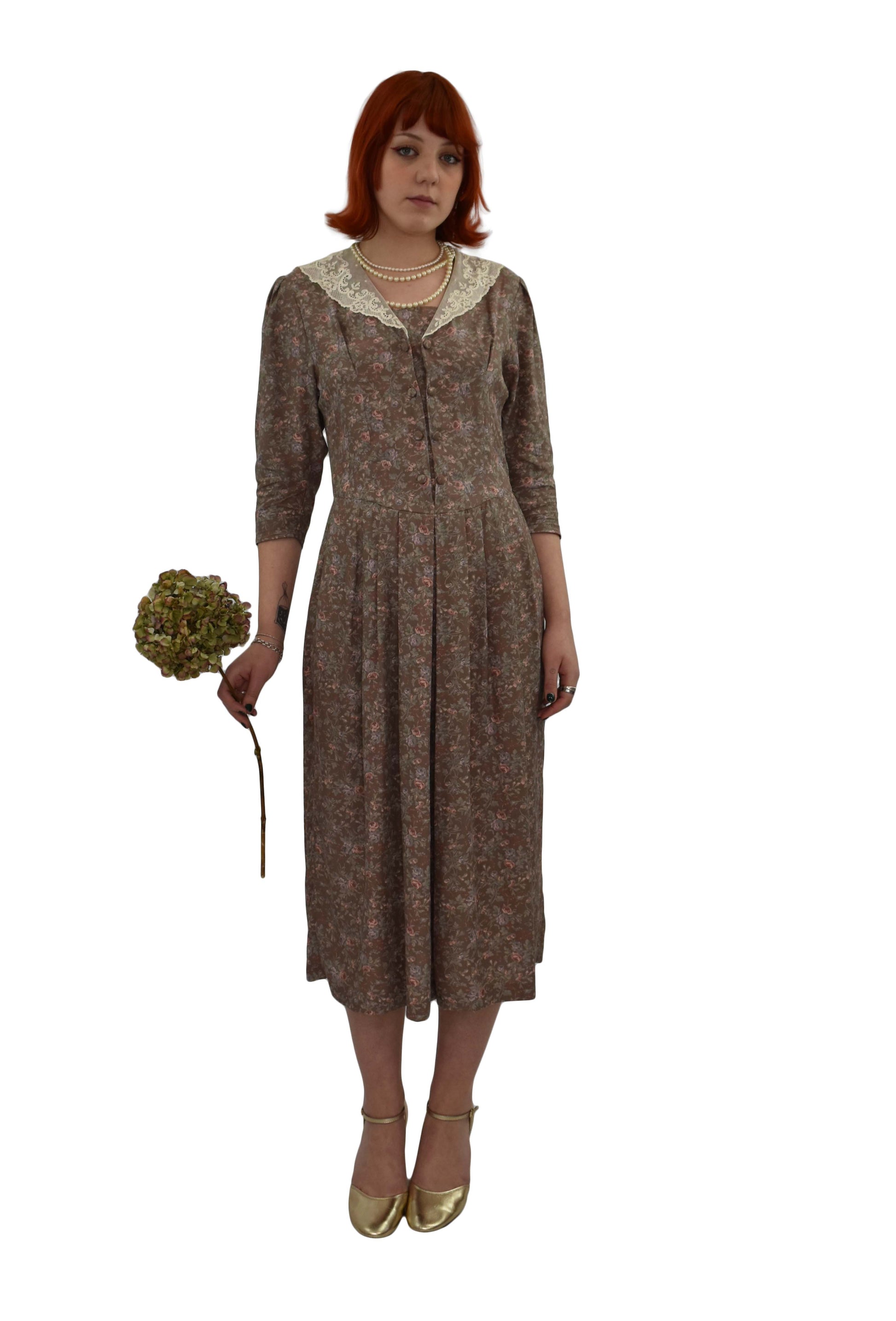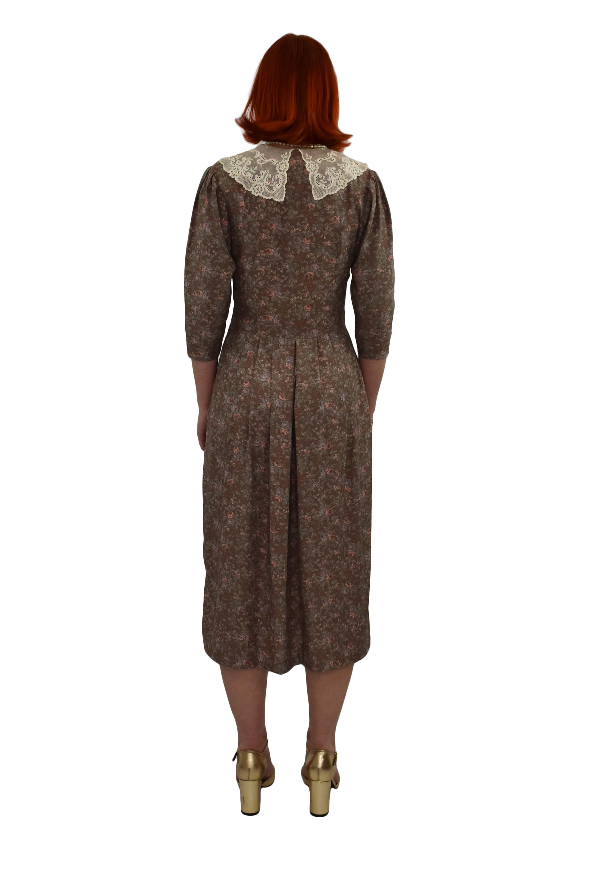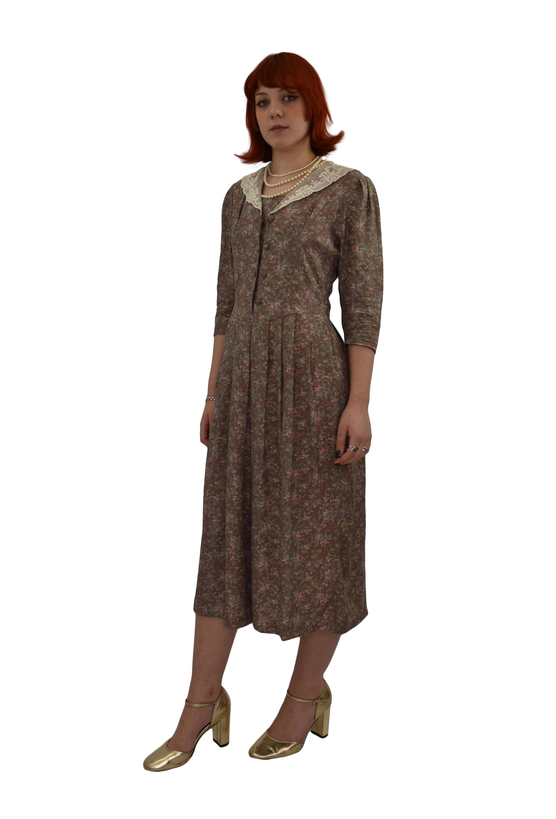 Gorgeously romantic Laura Ashley floral dress with deep fine lace collar. Unusual double row of covered buttons to the front bodice.
