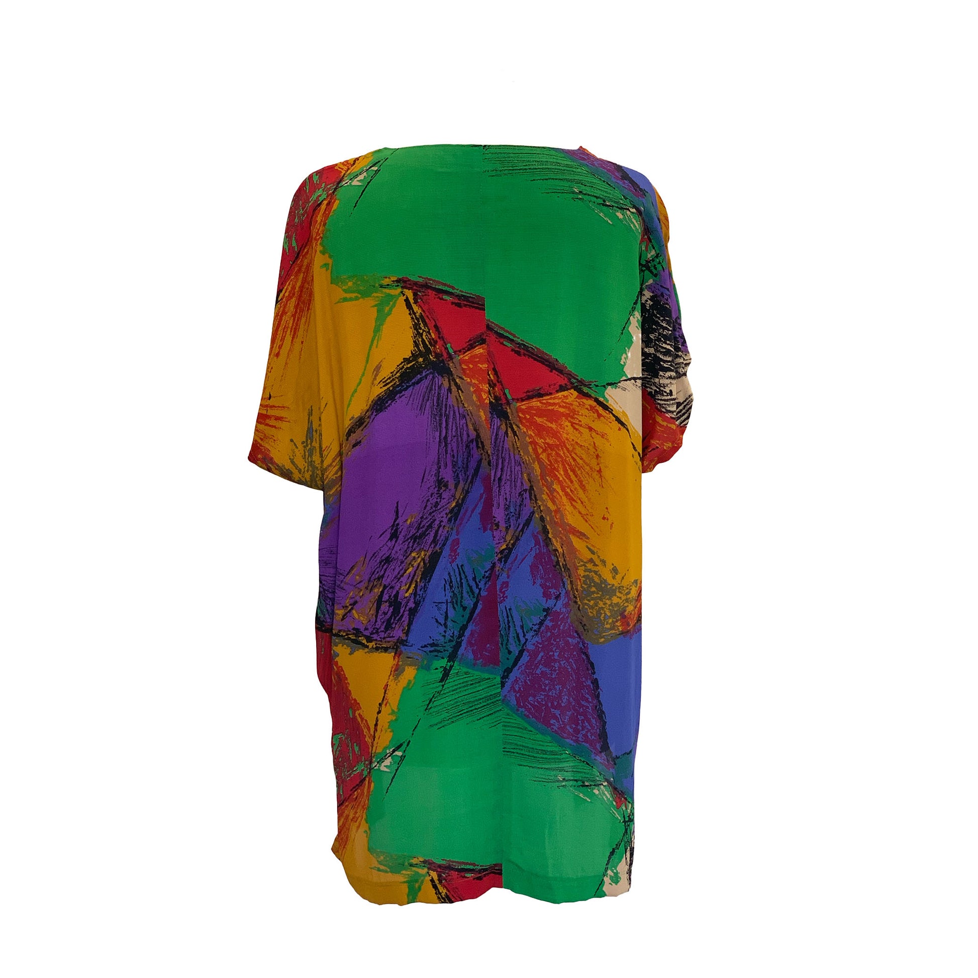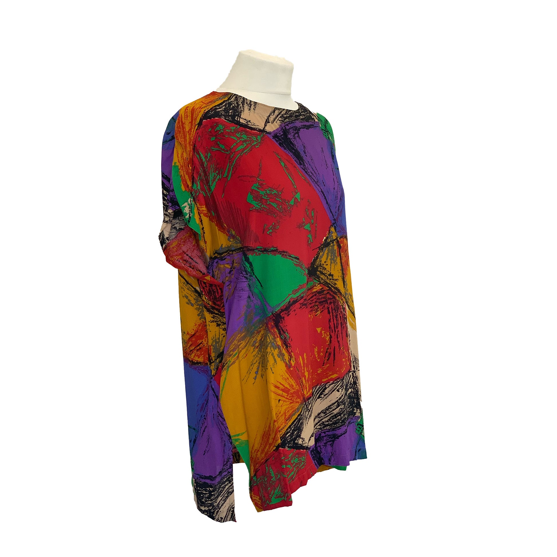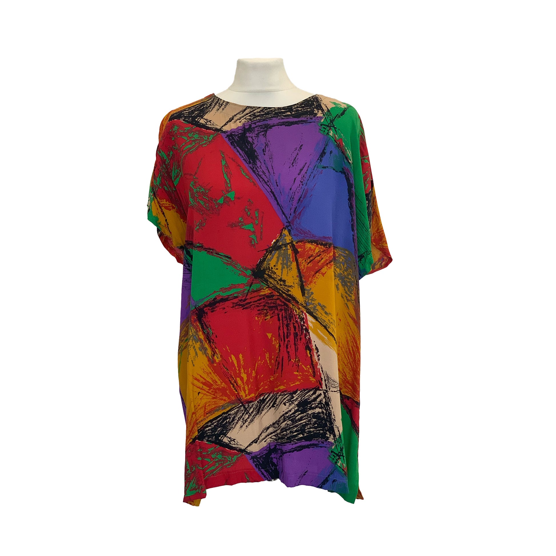 Hello colour! A loose fitting easy wear tunic top in a stunning painterly abstract print. Flattering short batwing sleeve. Viscose blend with slight sheen. Preloved circa 1990’s/Y2K