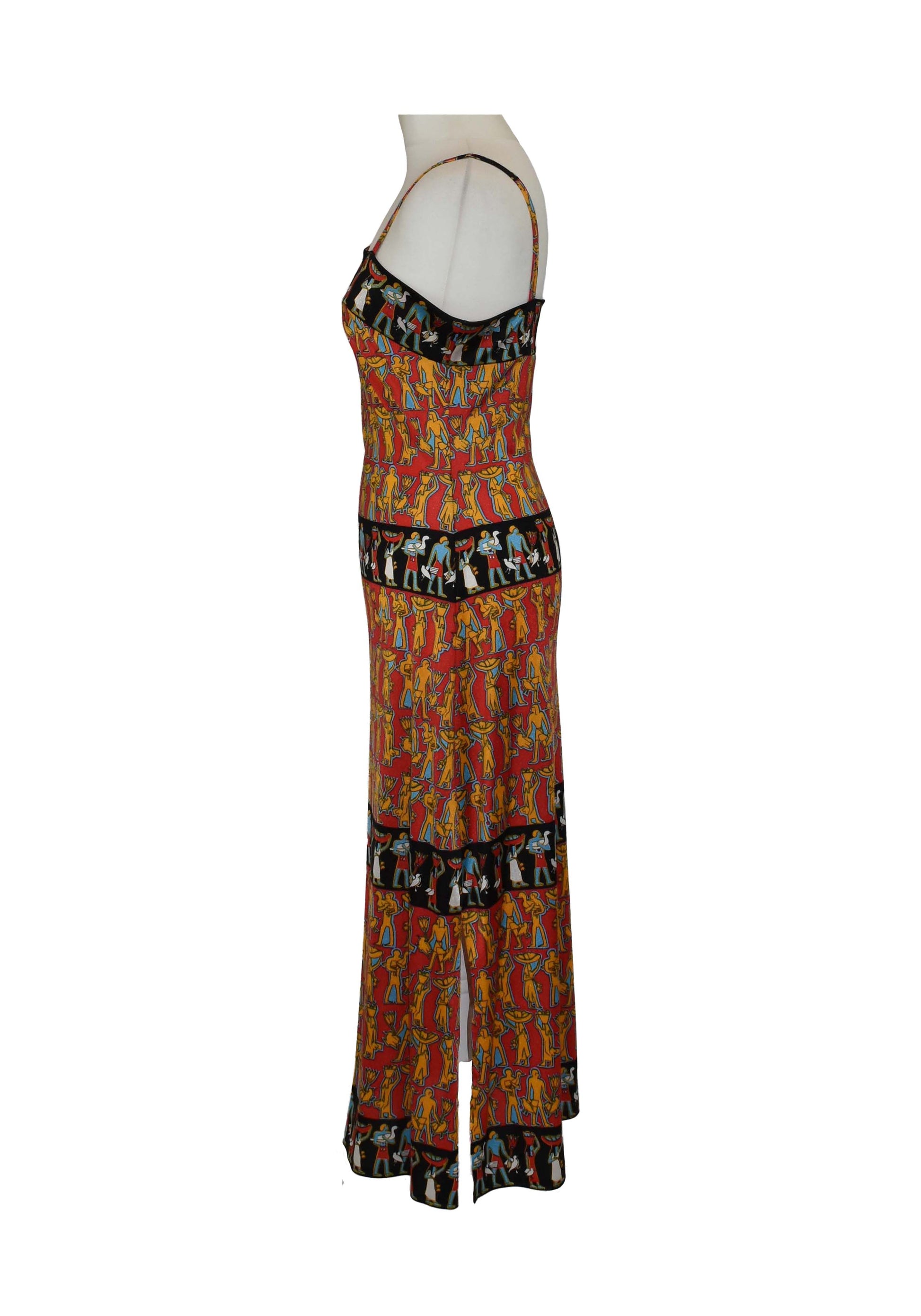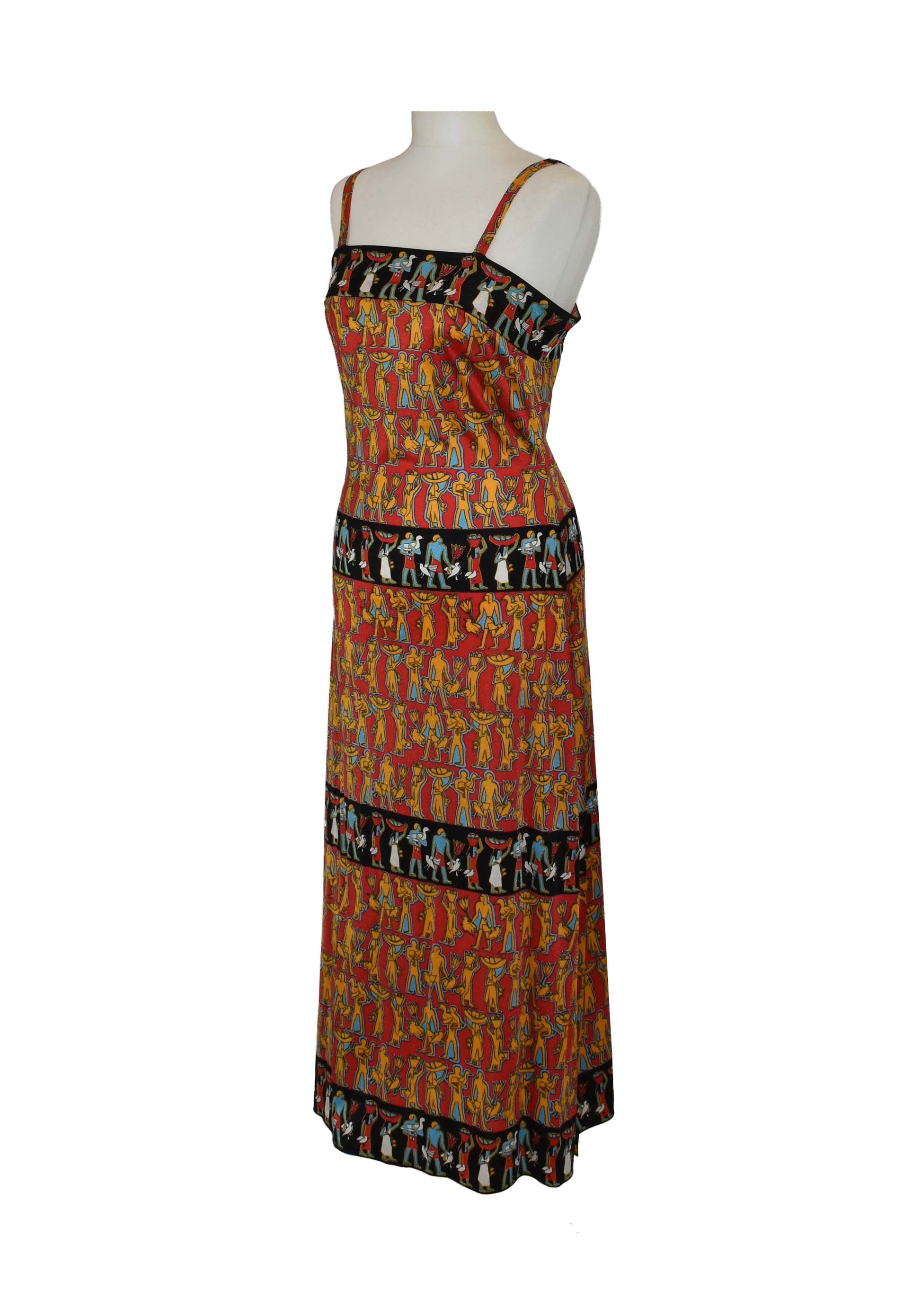 Fabulous fun Egyptian hieroglyph print slip dress with slim shoulder straps. Contrast panel to upper bodice for definition. Side slits to skirt.