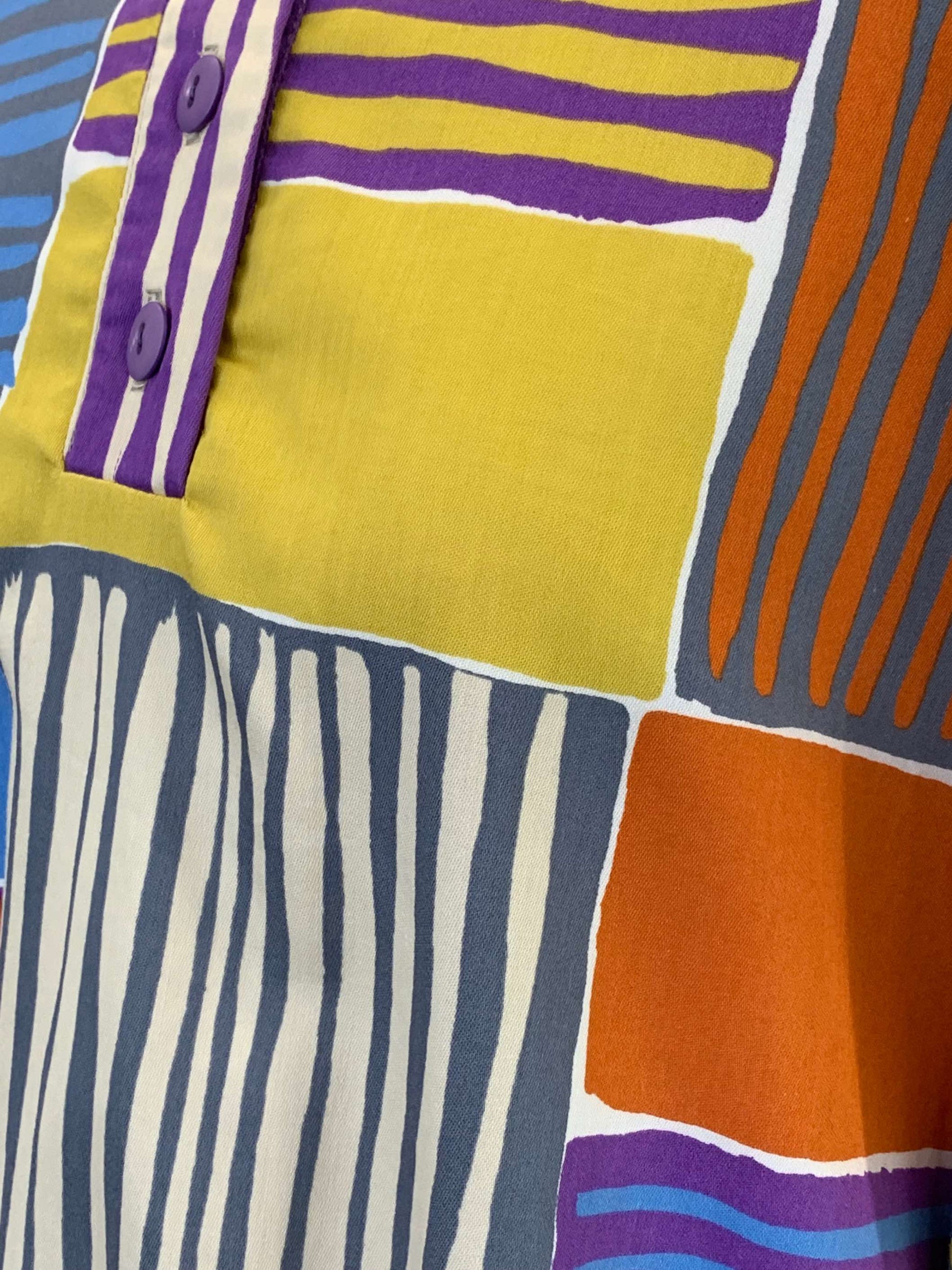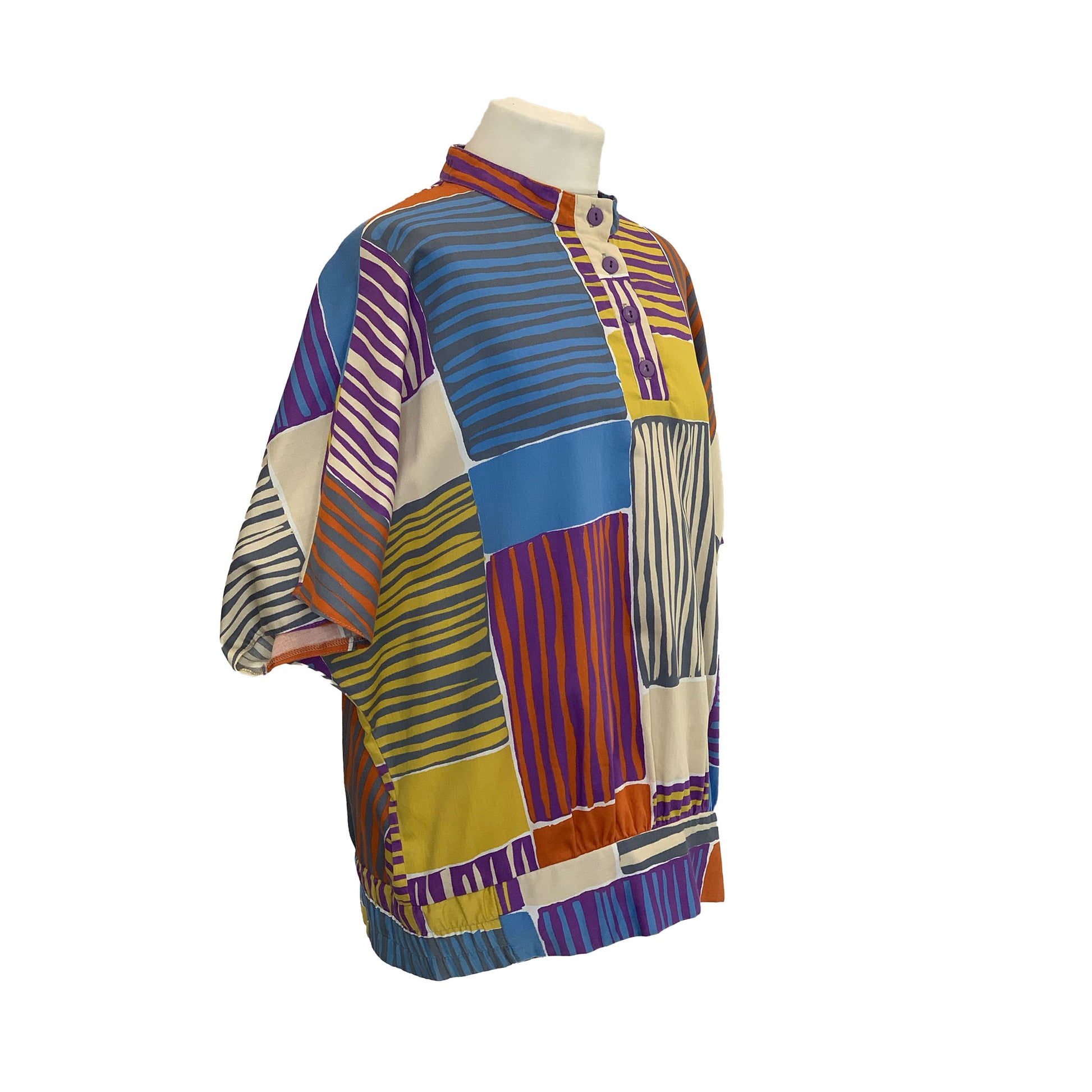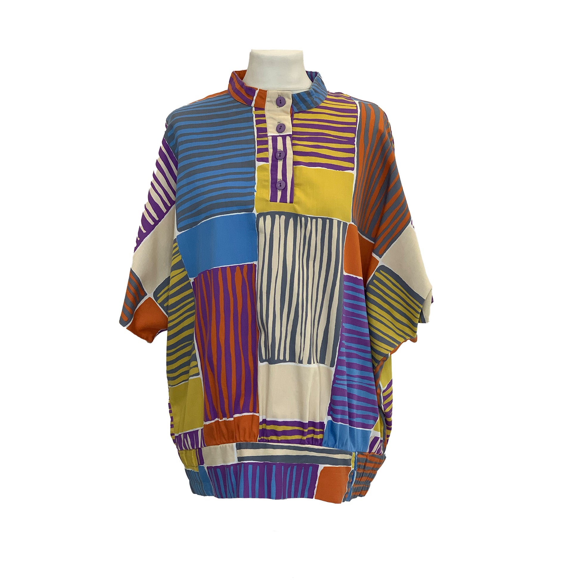 A super-cheerful oversized top in abstract patchwork style multicolour print. Batwing sleeves to elbow length. 3/4 button panel fastening to high neckline.