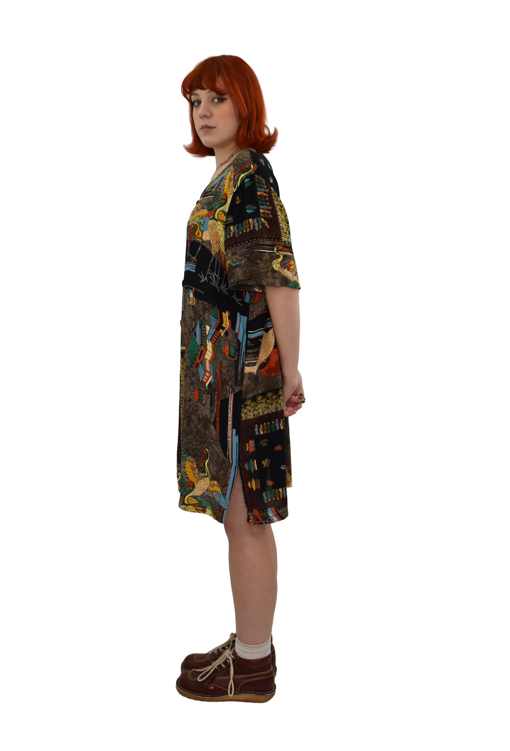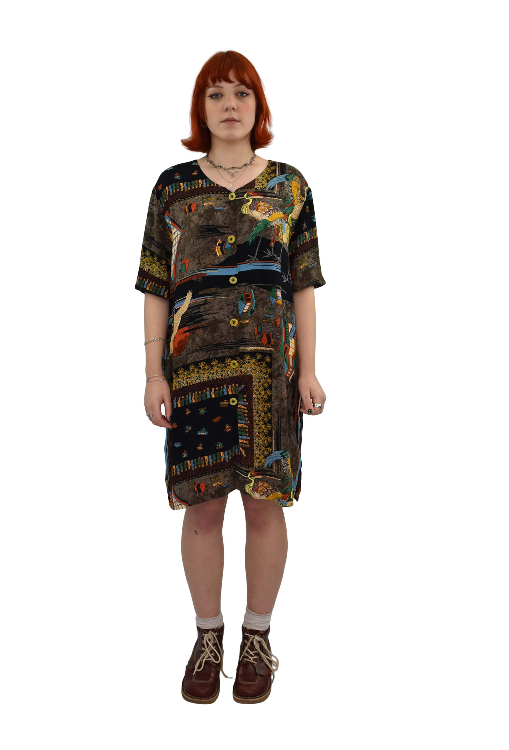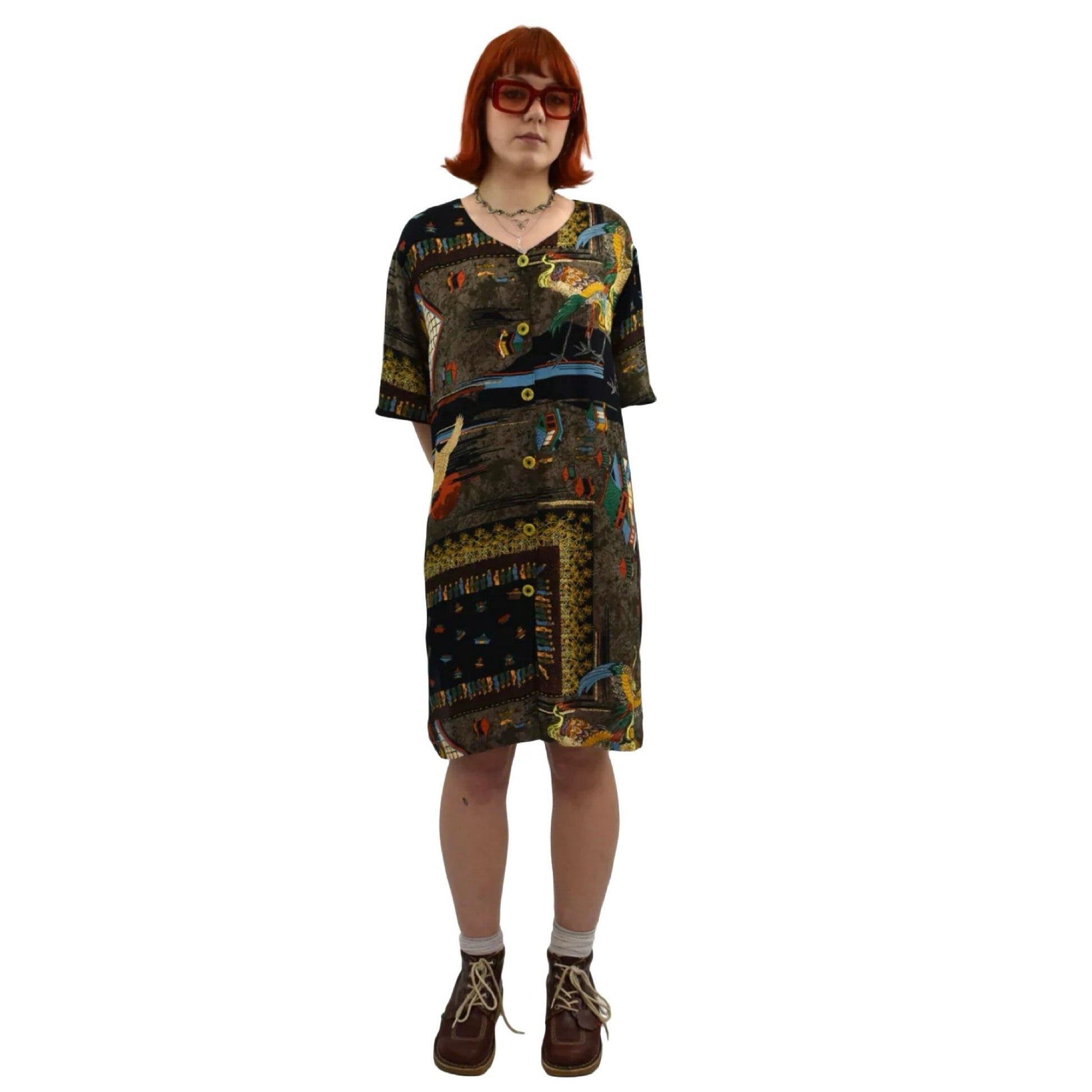 1990’s Oriental Motif Print Loose Shirt Dress | Preloved