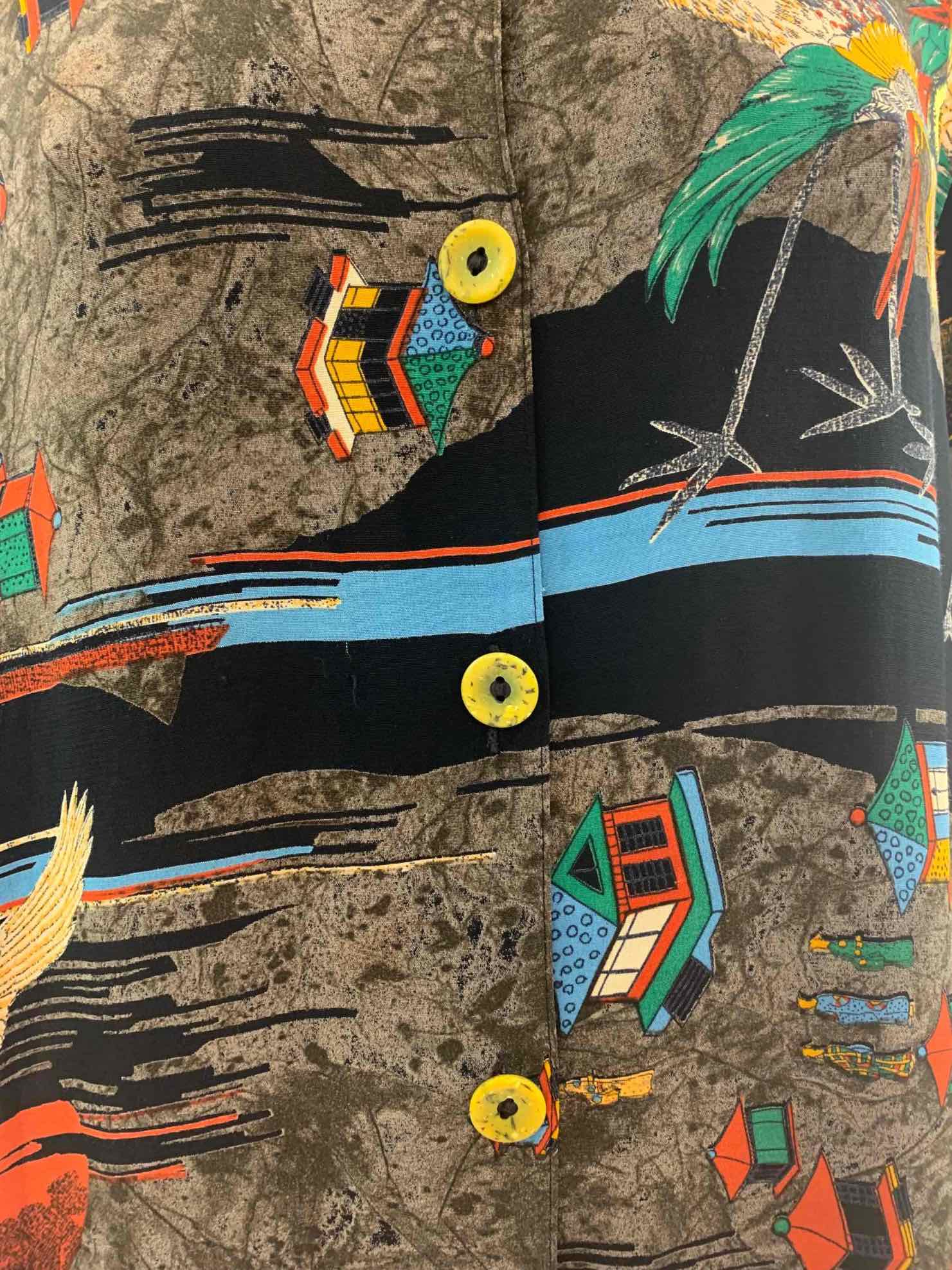 We love this oriental motif print so much! Loose shirt dress with button up front.