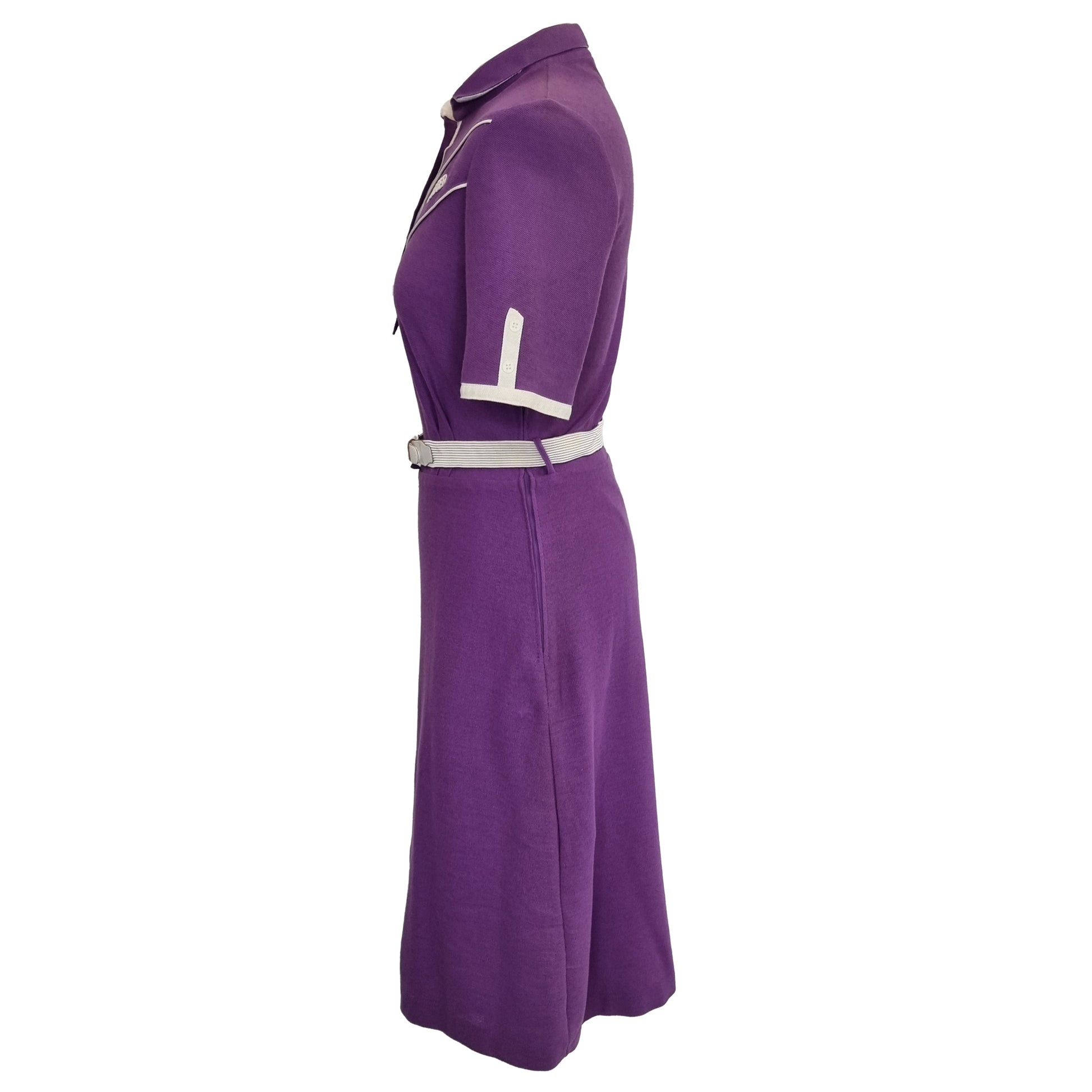 Fab vintage late 1970s early 80s purple dress with ‘Jogger’ contrast white trim and embroidery to the chest. Complete with original contrasting belt. Looks unworn deadstock.