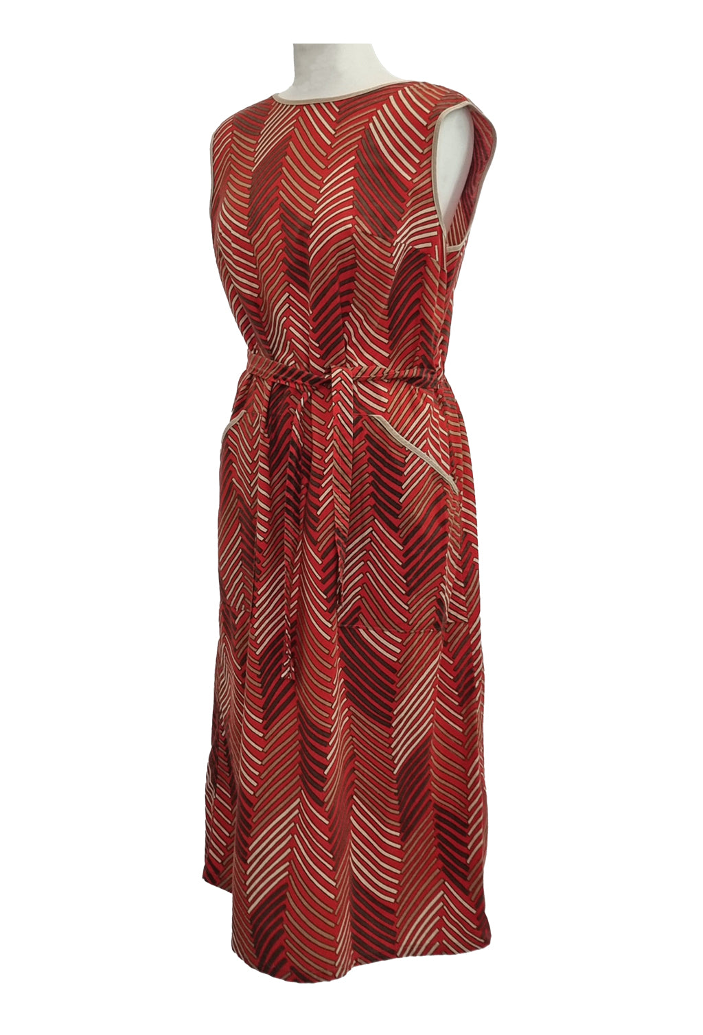 We love this so much. An 80’s cool cotton dress in an abstract print, with an open back detail fastening with a central button. Contrast piping trim to neckline, the armholes, and the deep pockets. Elasticated to back of the waistline.