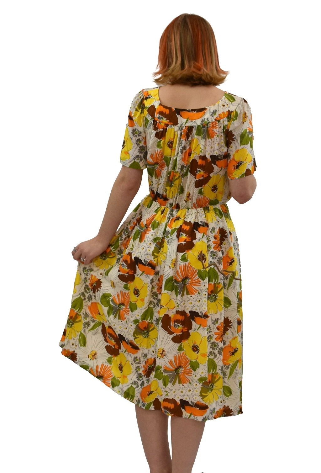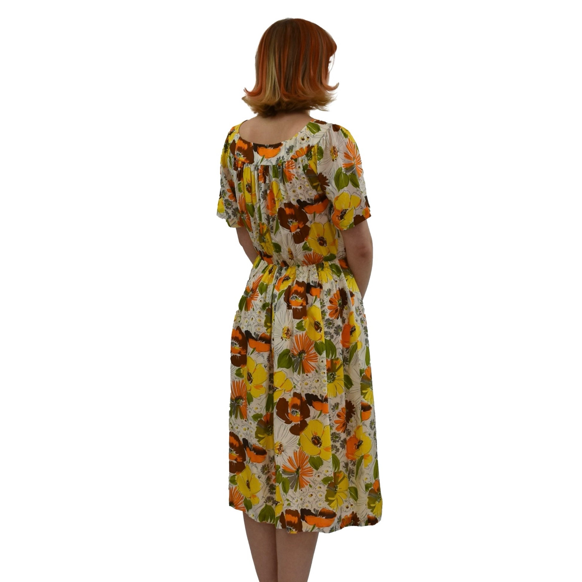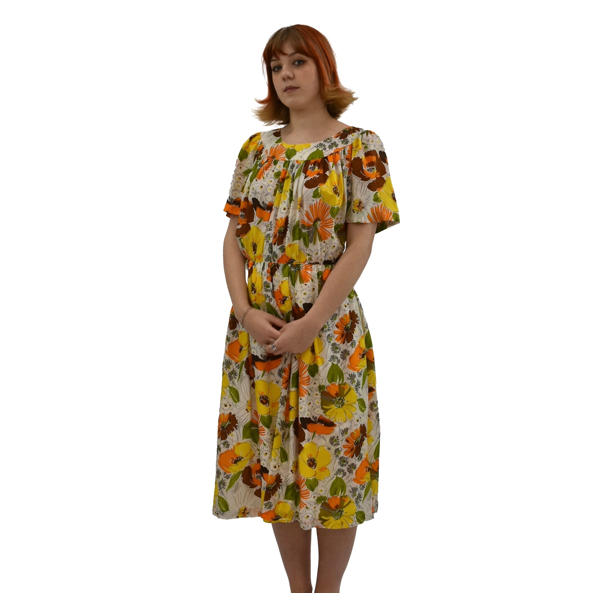 A beautiful 80's floral print dress with an elasticated waist. Easy to wear and style with heels or flats, all makes for an effortless and cheerful occasion dress. Rounded neckline with wide facing and loose short sleeves.
