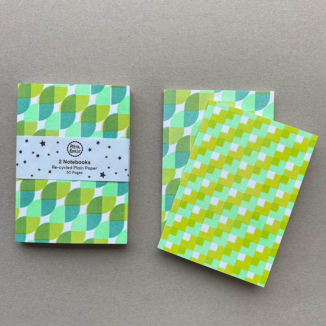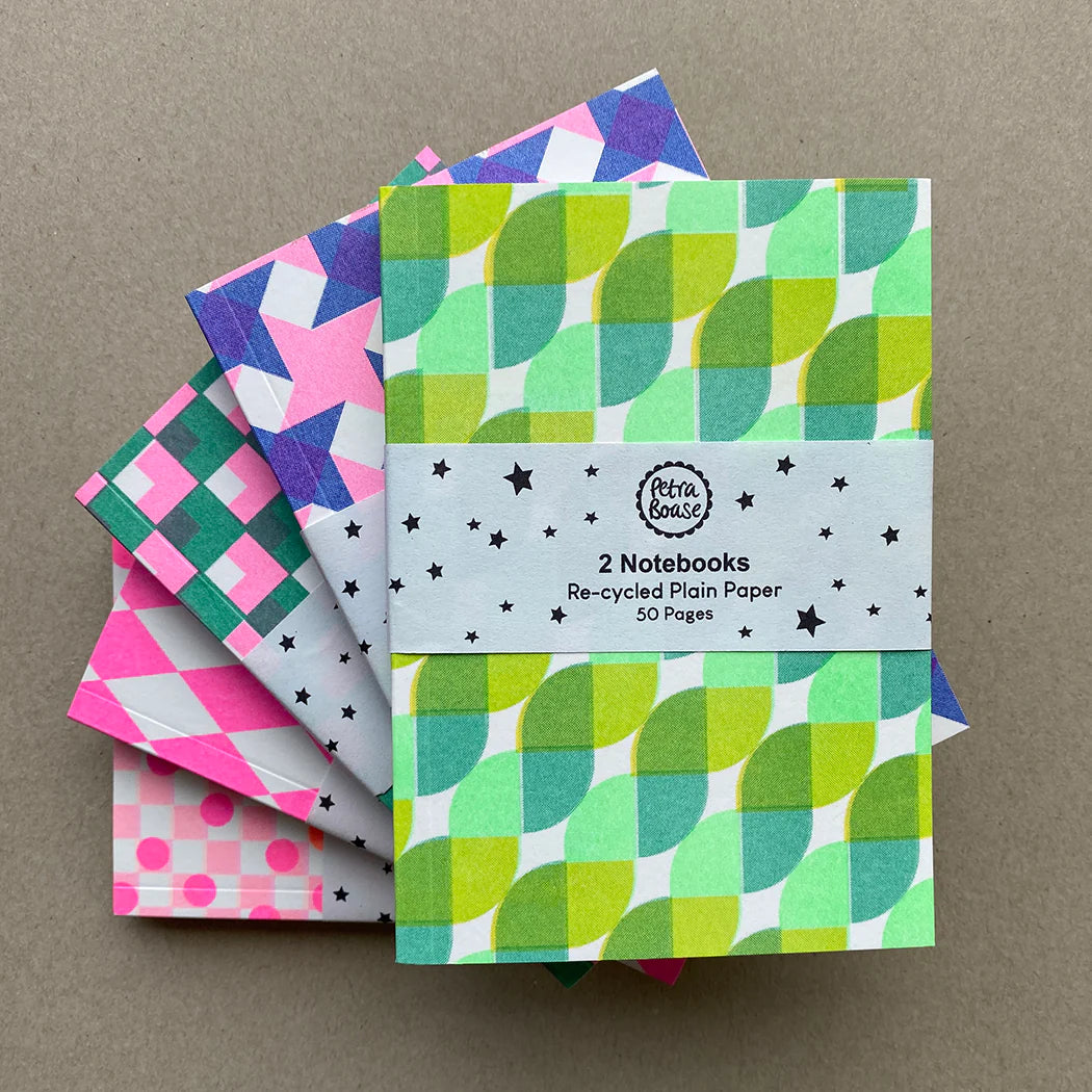A set of 2 notebooks with a bold Risograph printed pattern acid green and mint cover and plain pages for jotting dreams, notes & doodles.