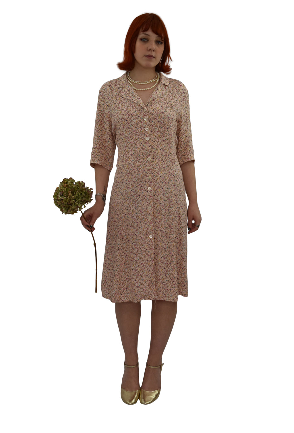 A simple and elegant easy-wear abstract floral print tea dress with collar and a faux mop button front. Delicate bright printed floral motifs over an abstract print of brick red and brown hues.