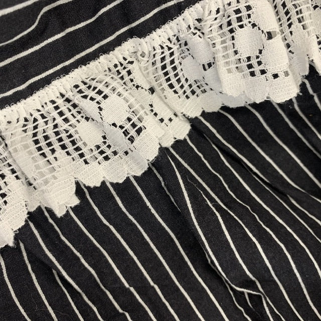 Black and white pinstriped tiered cotton maxi dress with off-white broderie anglaise trim detailing. Removable pretty red floral brooch positioned at the waist. Original self-tie belt. Unworn.