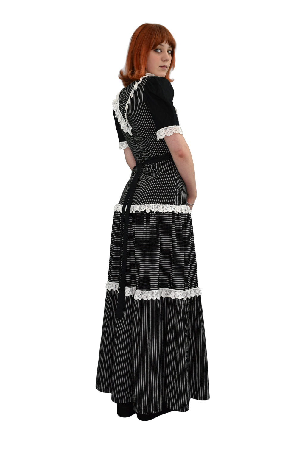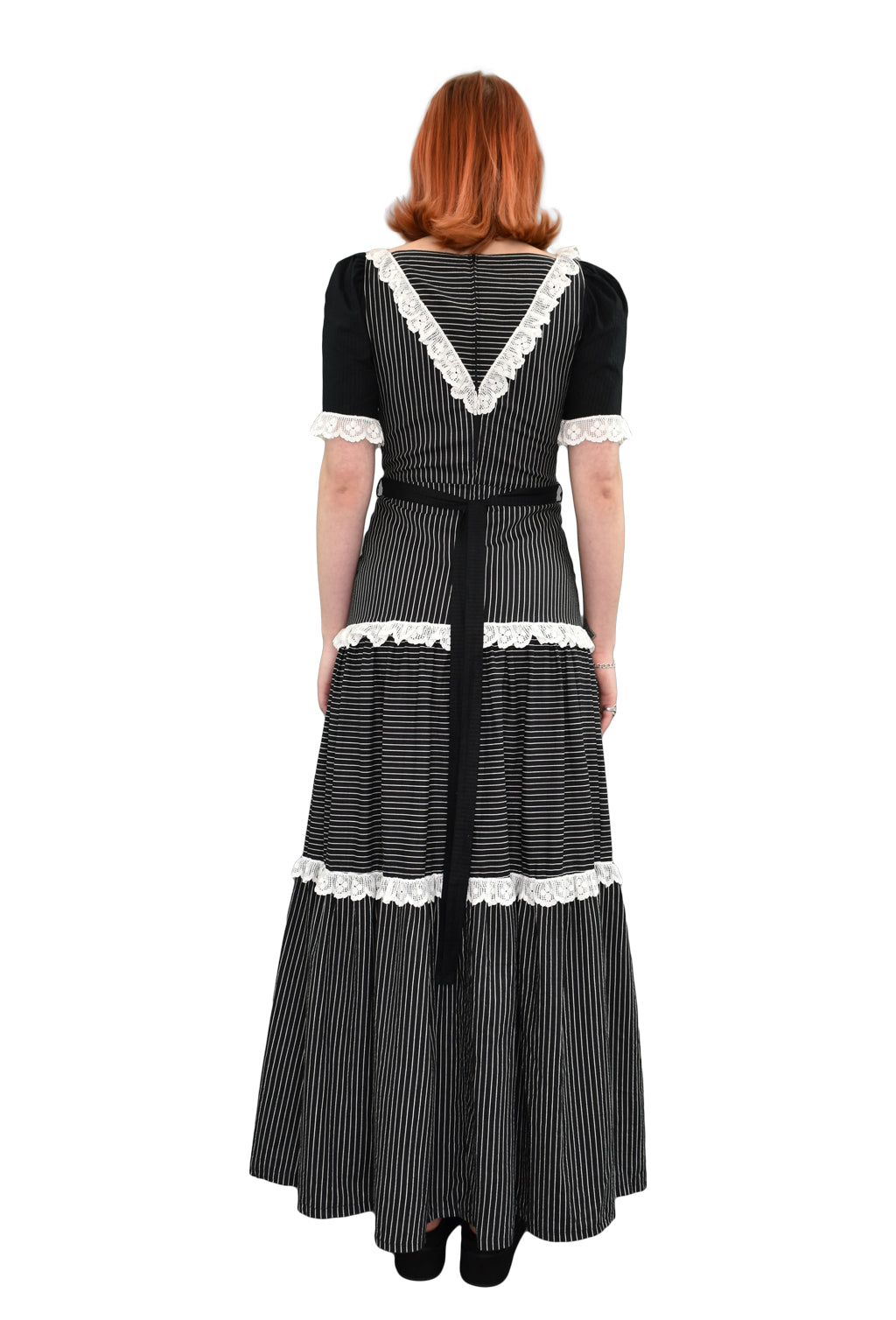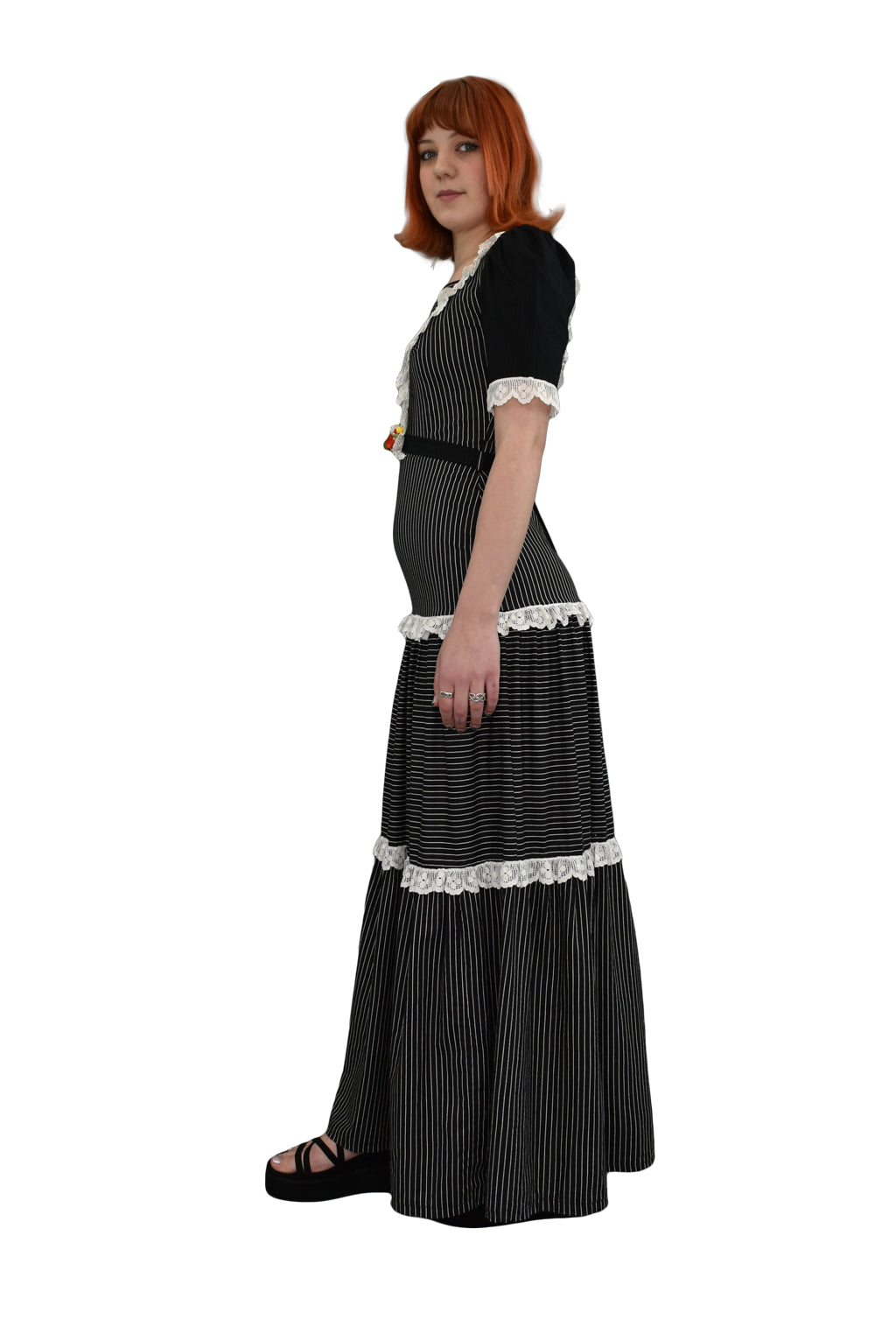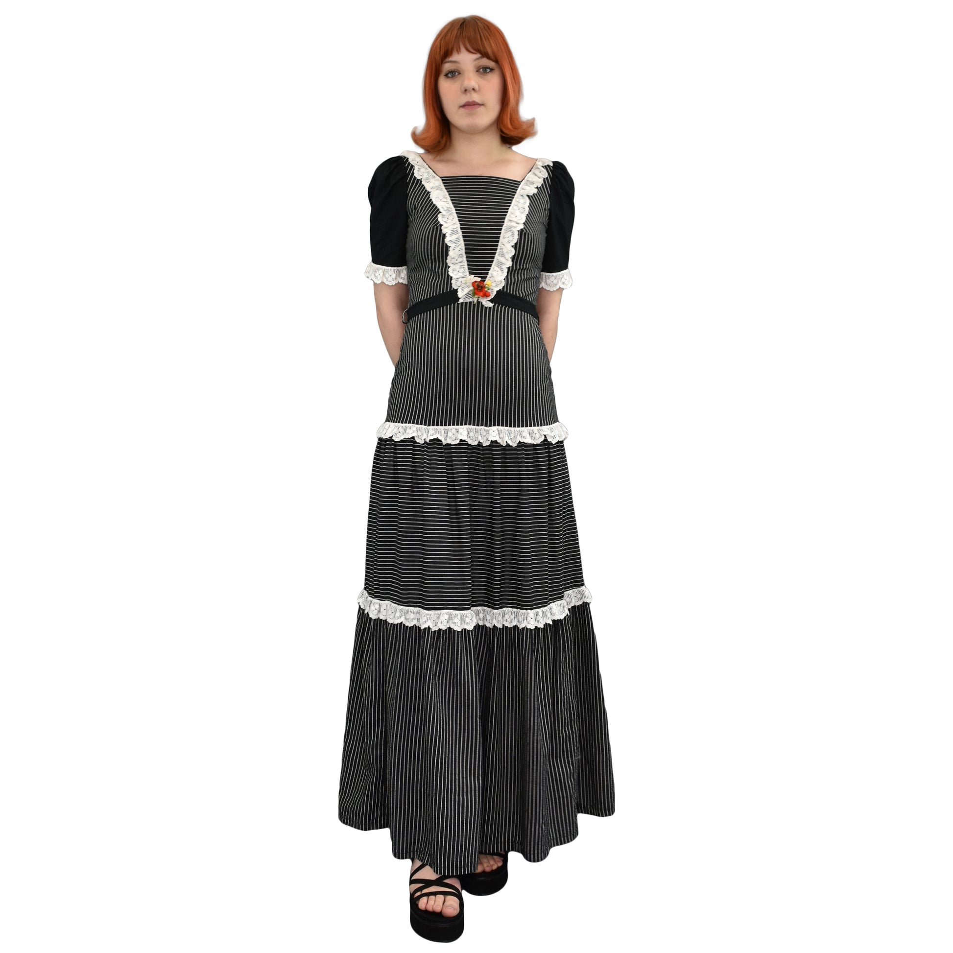 1970’s Monochrome Striped Tiered Maxi Dress With Floral Brooch Detail | Vintage