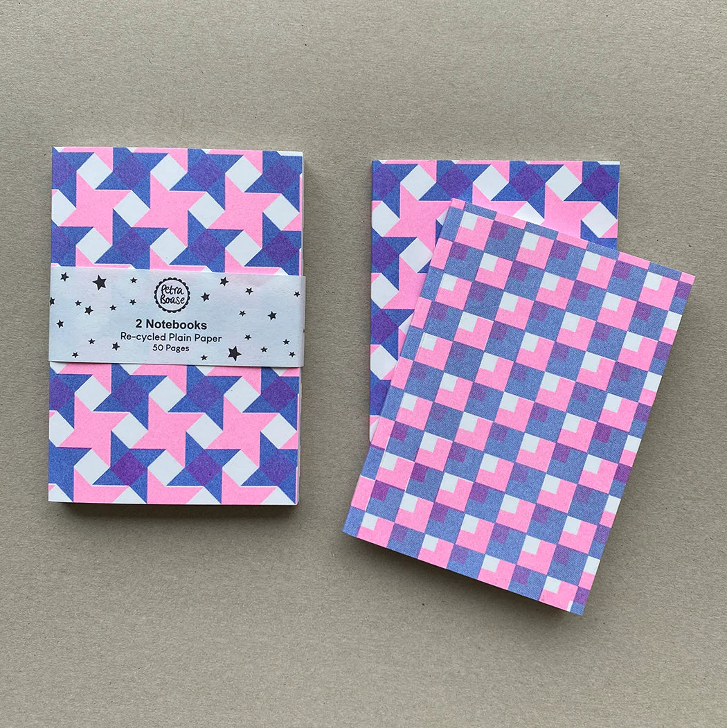 A set of 2 notebooks with a bold Risograph printed pattern blue and hot pink cover and plain pages for jotting dreams, notes & doodles.