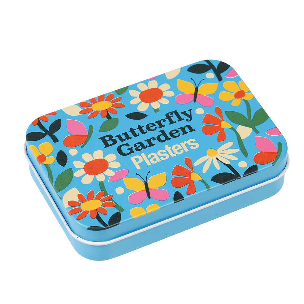 Butterfly Garden tin contains 30 printed plasters in three different sizes.