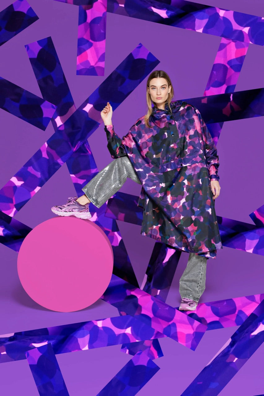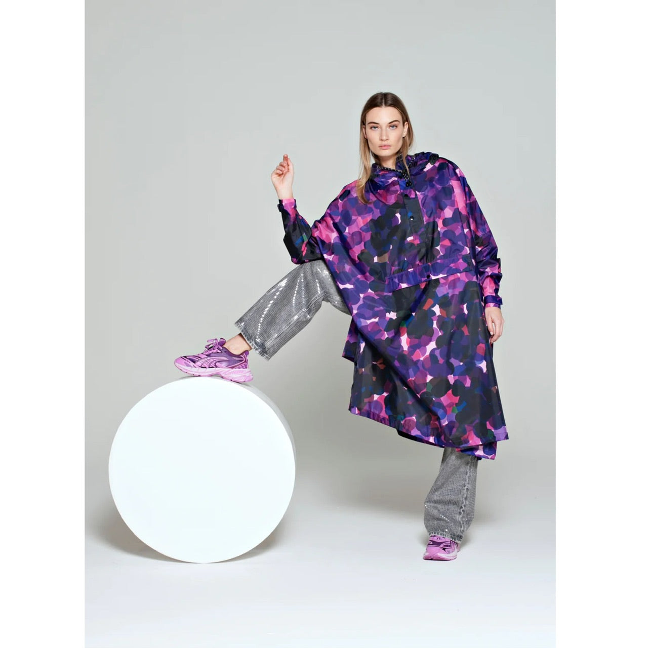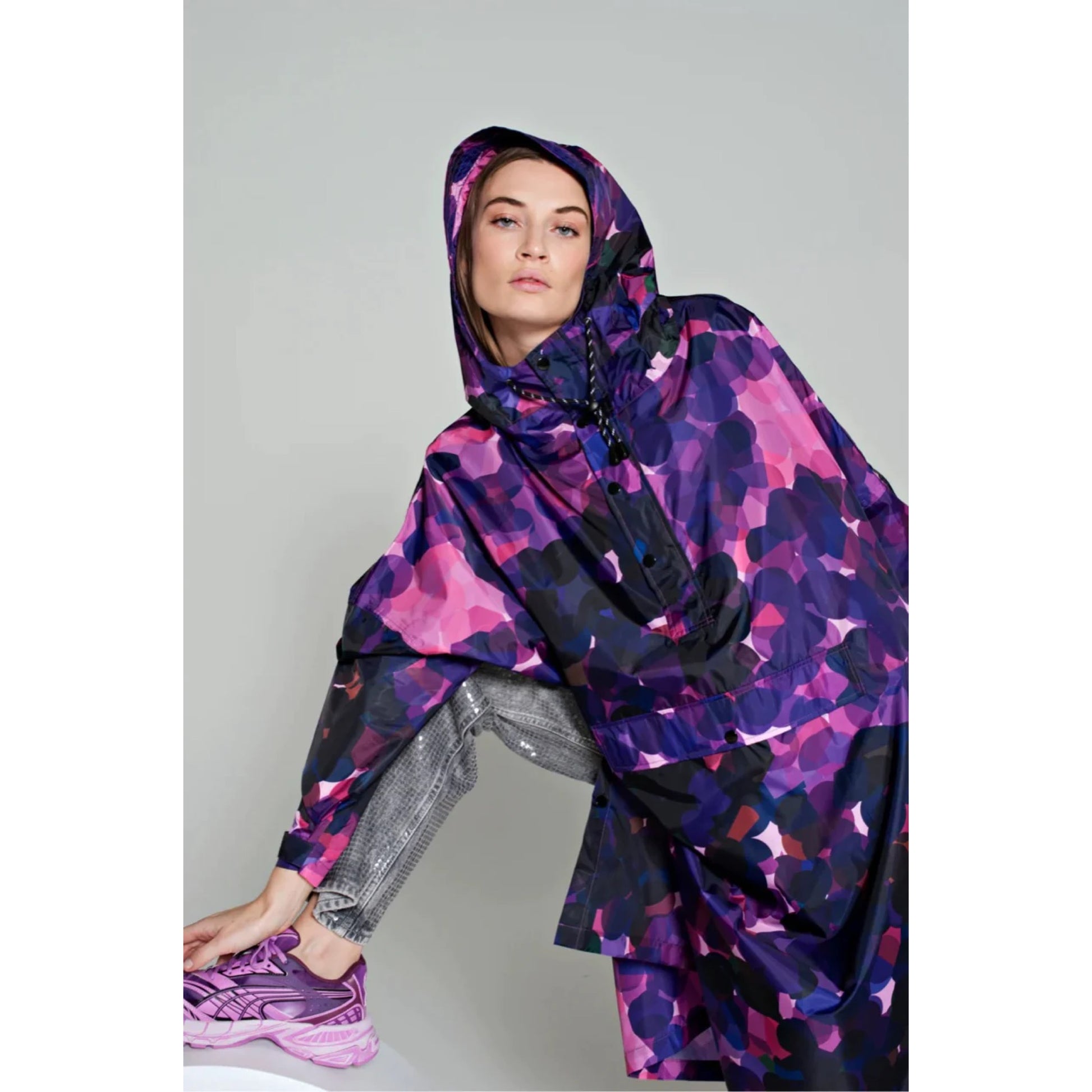 The vibrantly colourful City Lights rain poncho features an aesthetic Bokeh blur effect of a vibrant cityscape at night.