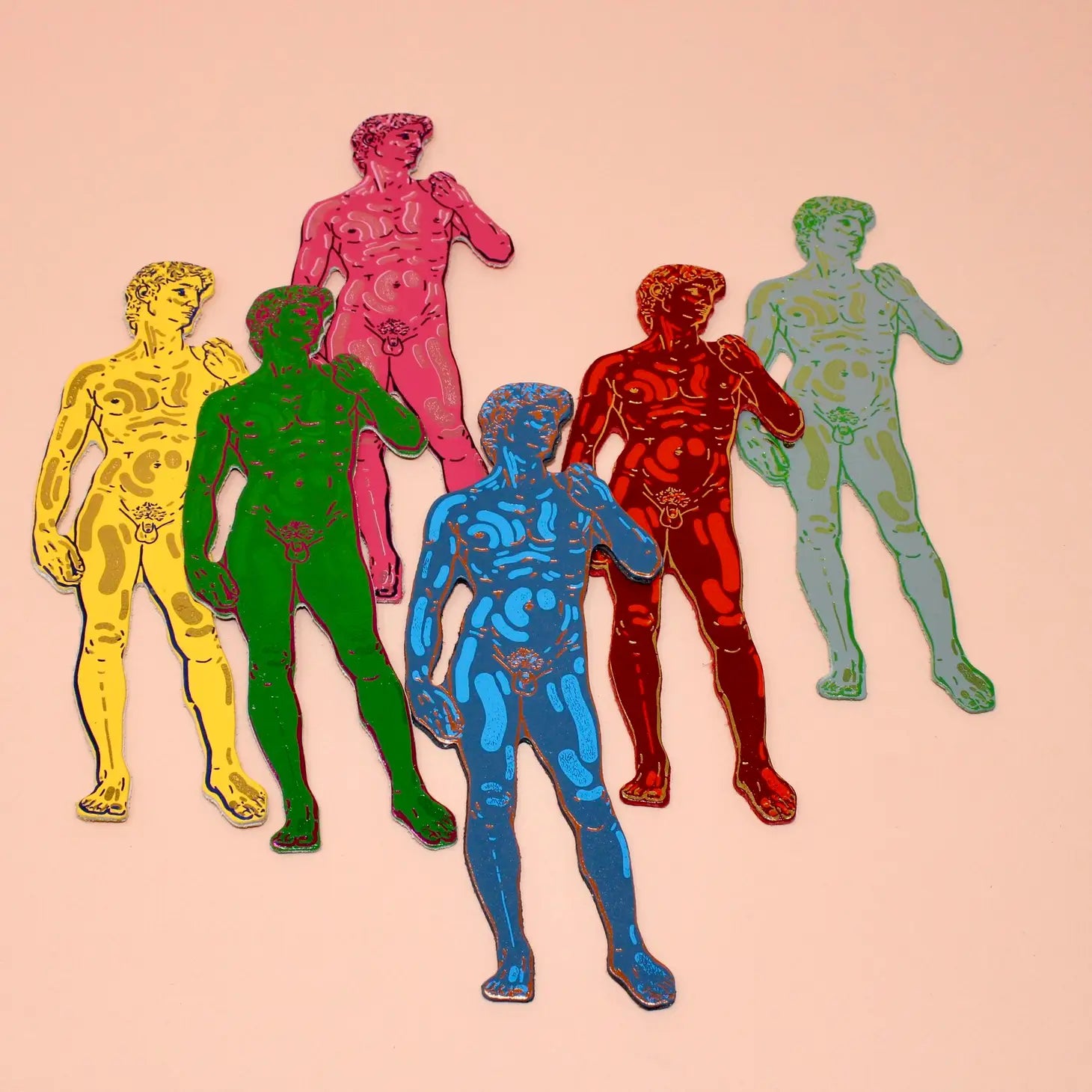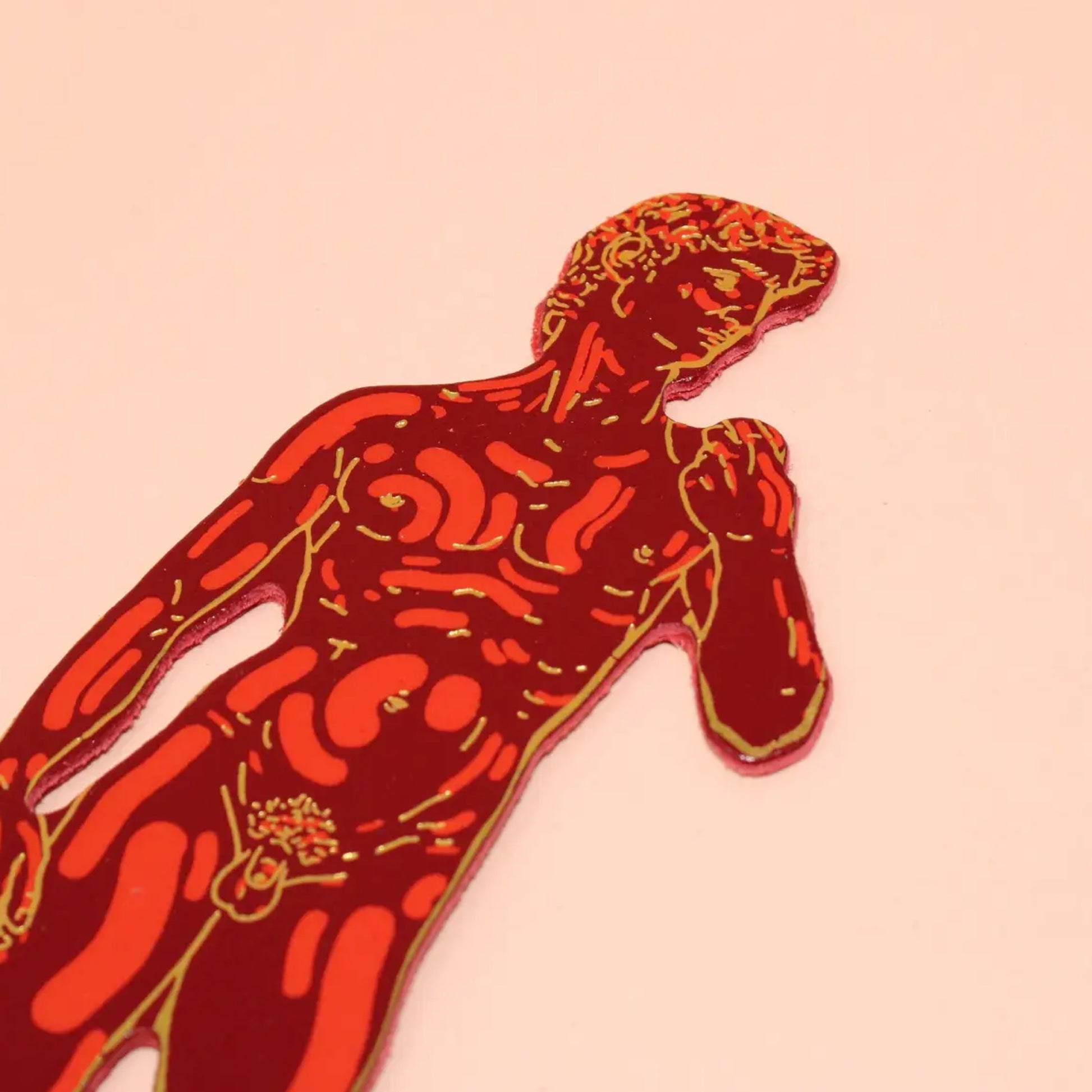 A leather bookmark inspired by Michelangelo’s David, in a vibrant red, with gold embossed detailing.