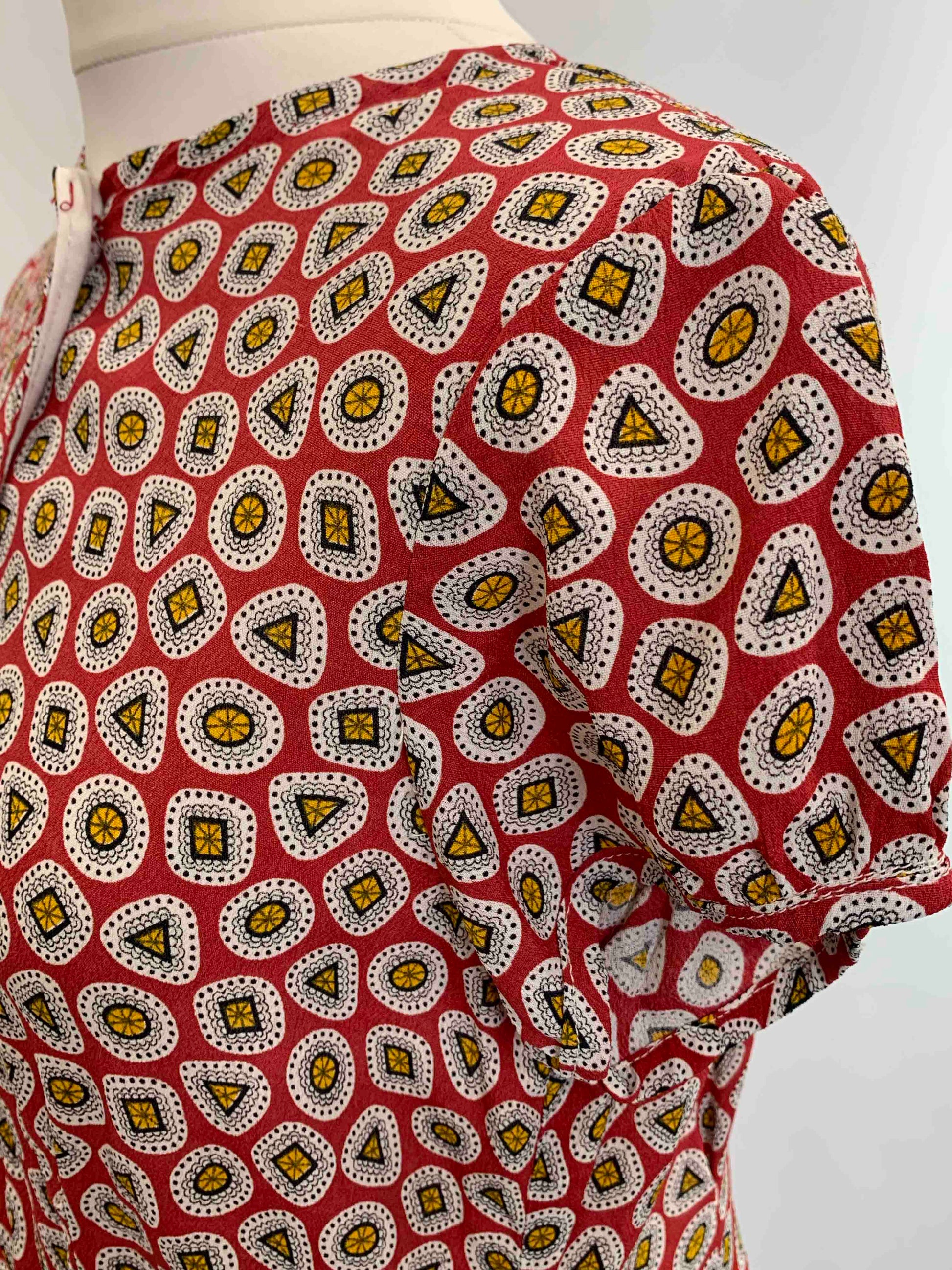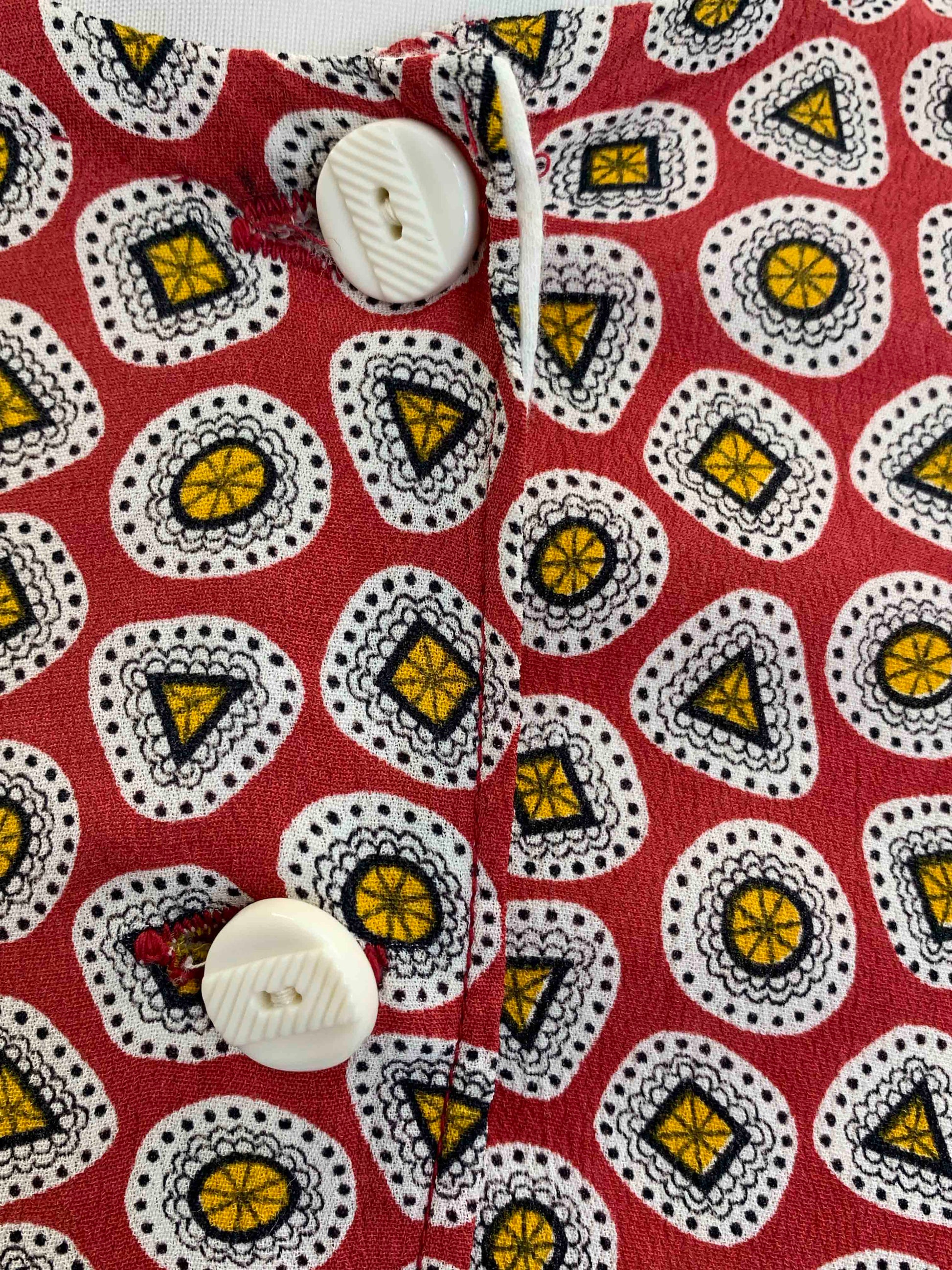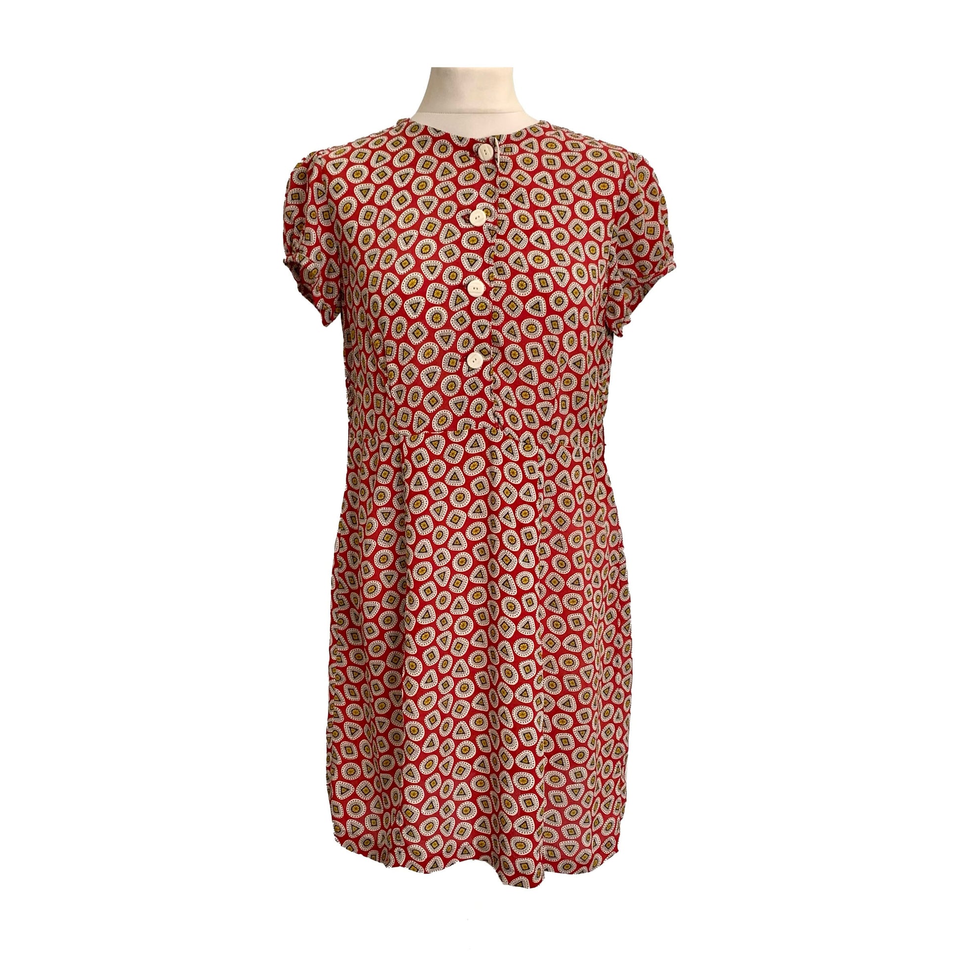 An adorable 1930’s day dress in a crisp jewel motif print. With four contrasting white buttons to the bodice. Simple, cute, and very wearable.