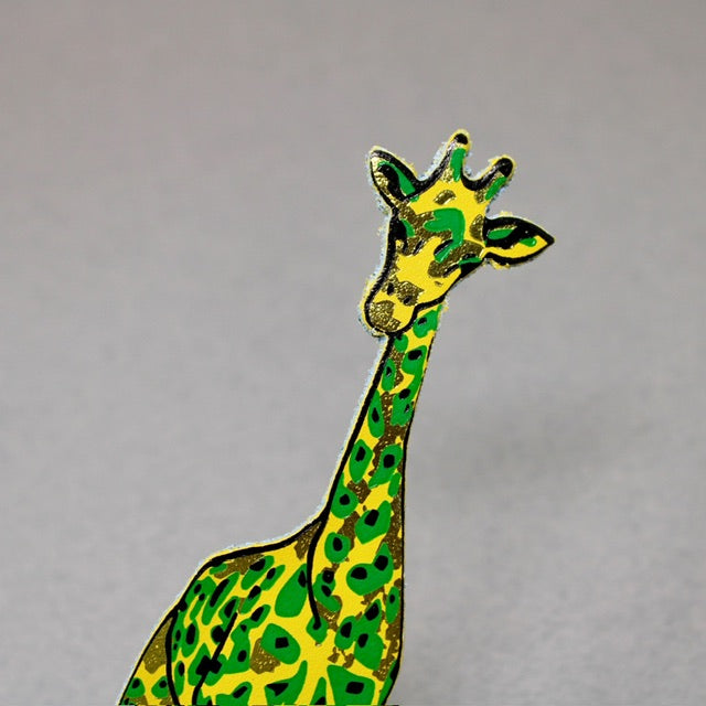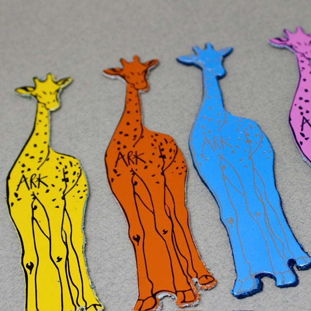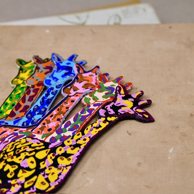 A Giraffe shaped leather bookmark, in a vibrant yellow and green colourway, with embossed detailing.