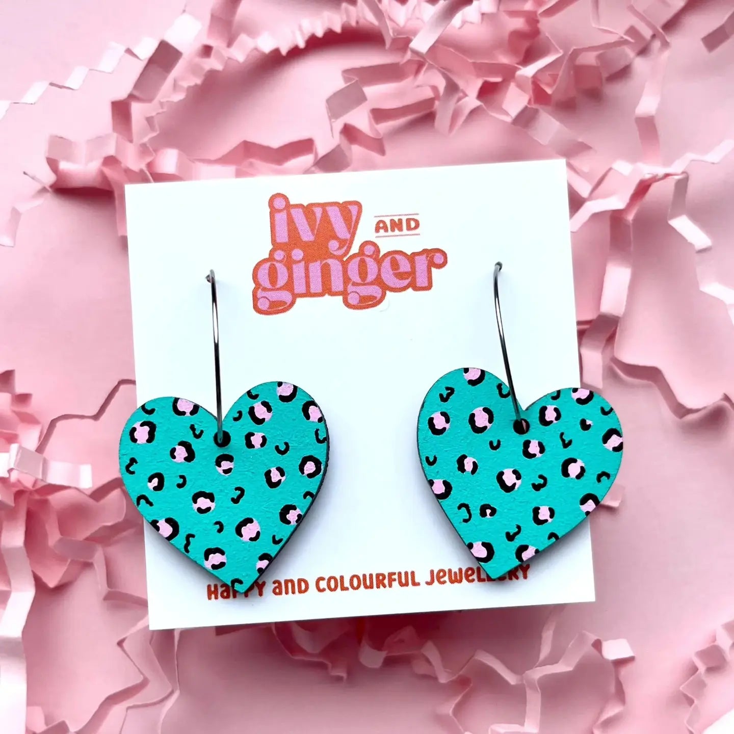 Green and Pink Leopard Print Heart Hoops | Handmade Wooden Earrings