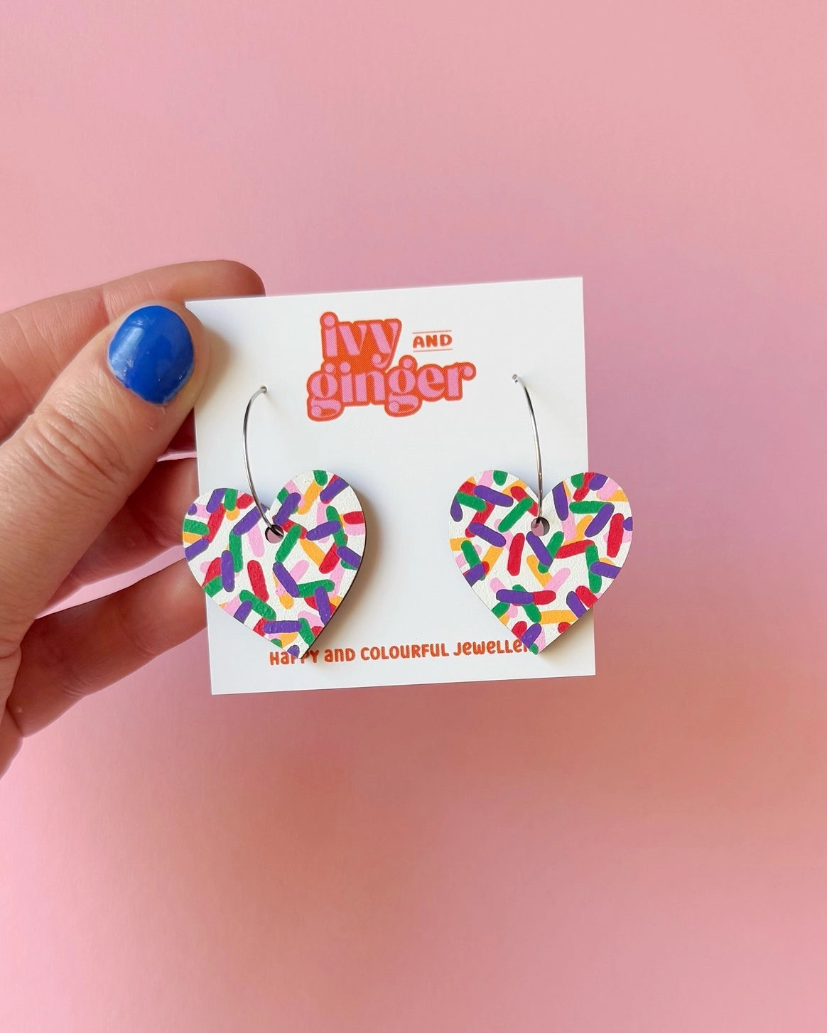 Hand Painted Confetti Heart Hoops | Handmade Wooden Earrings