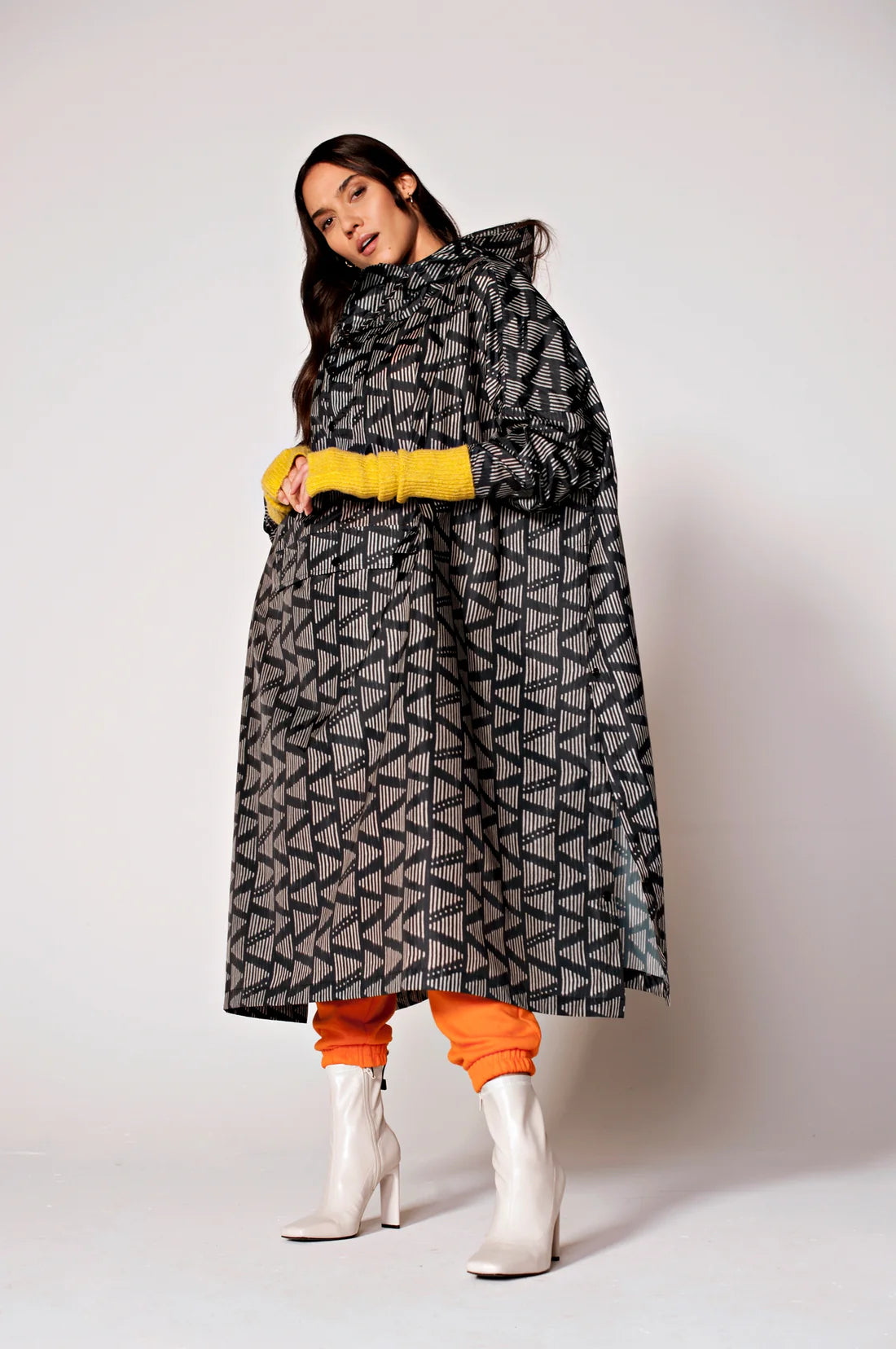 A gorgeous print from the design team at Rainkiss. The Moa Rainkiss poncho features a two-tone print of navy and light grey beautifully combined to recreate a weaving technique on a digital canvas.