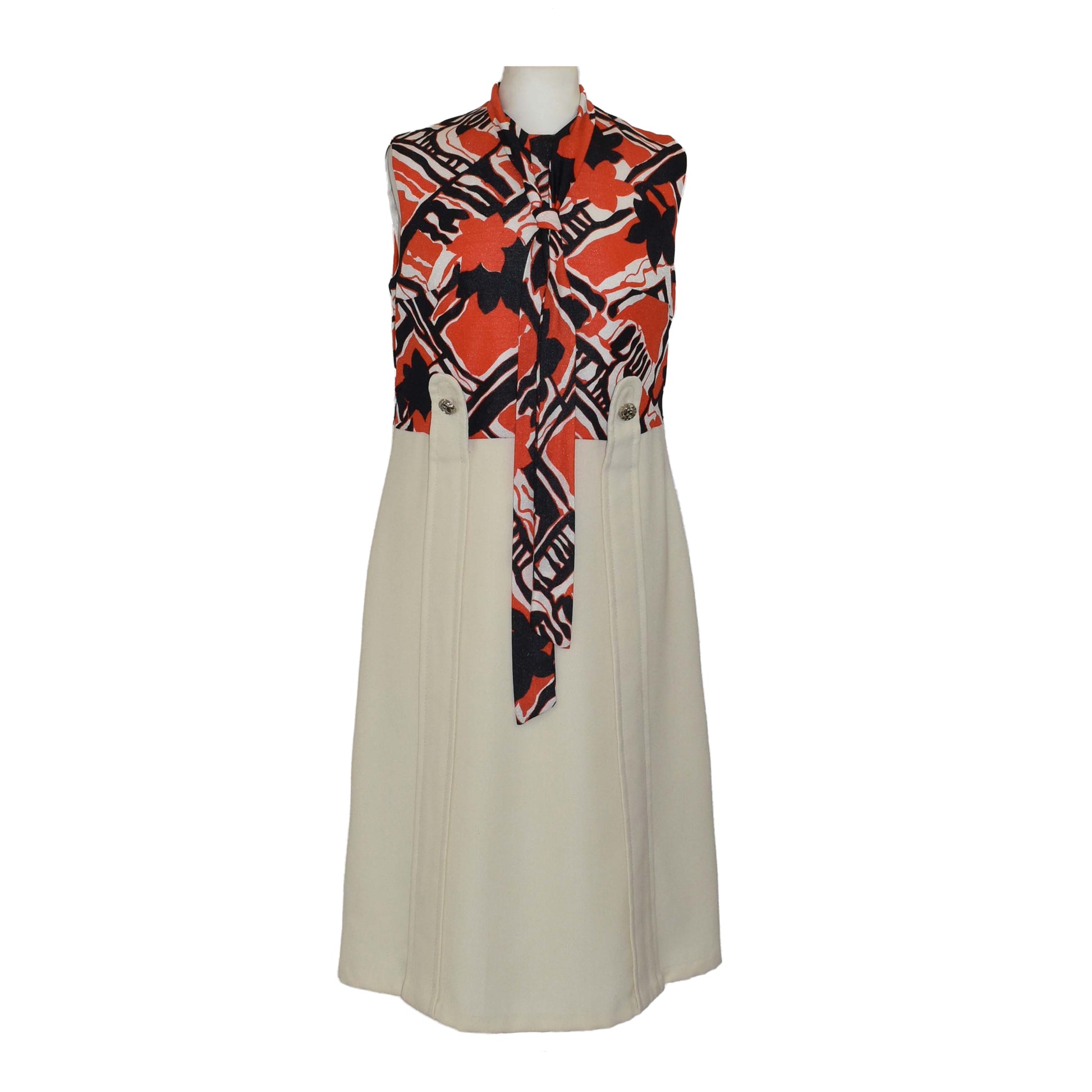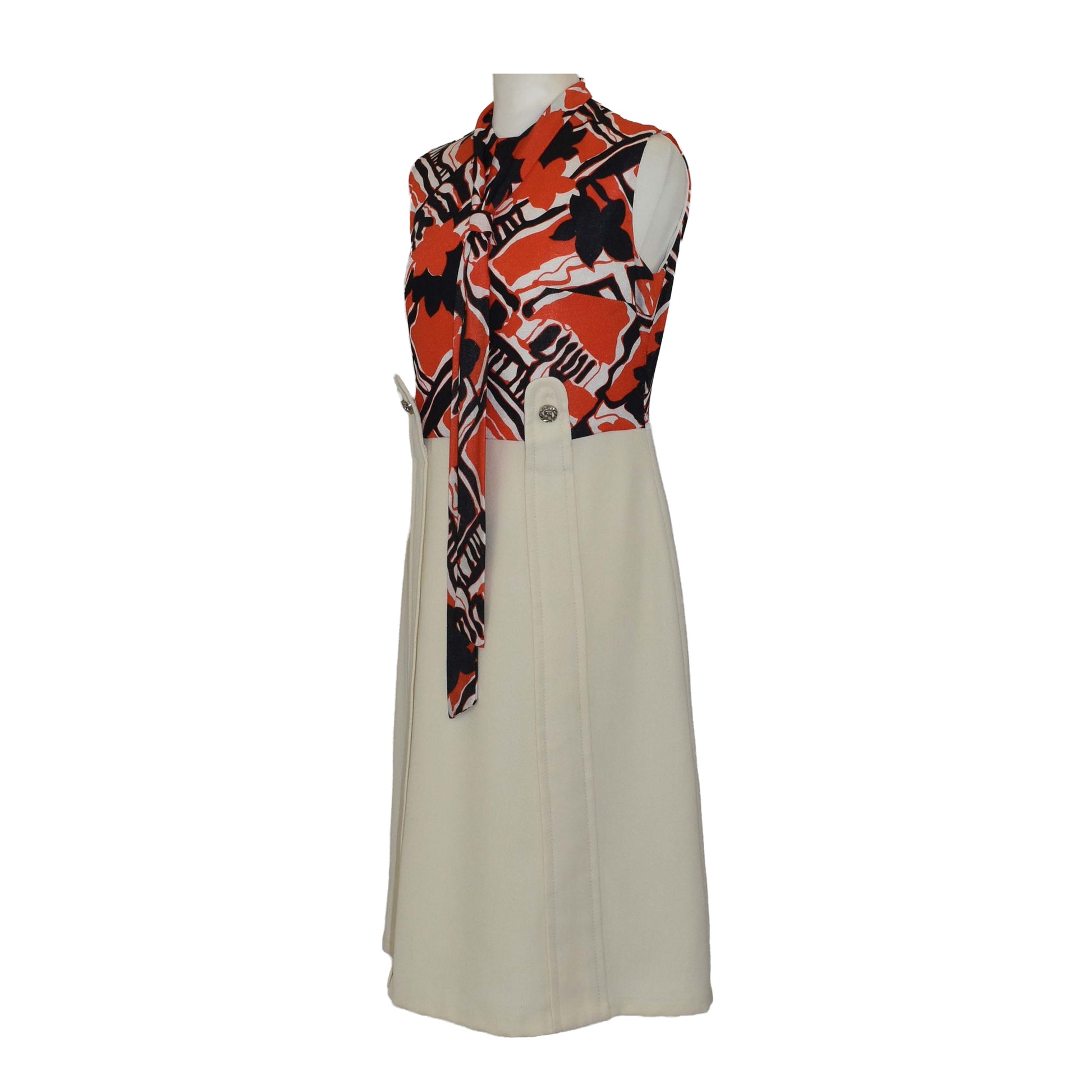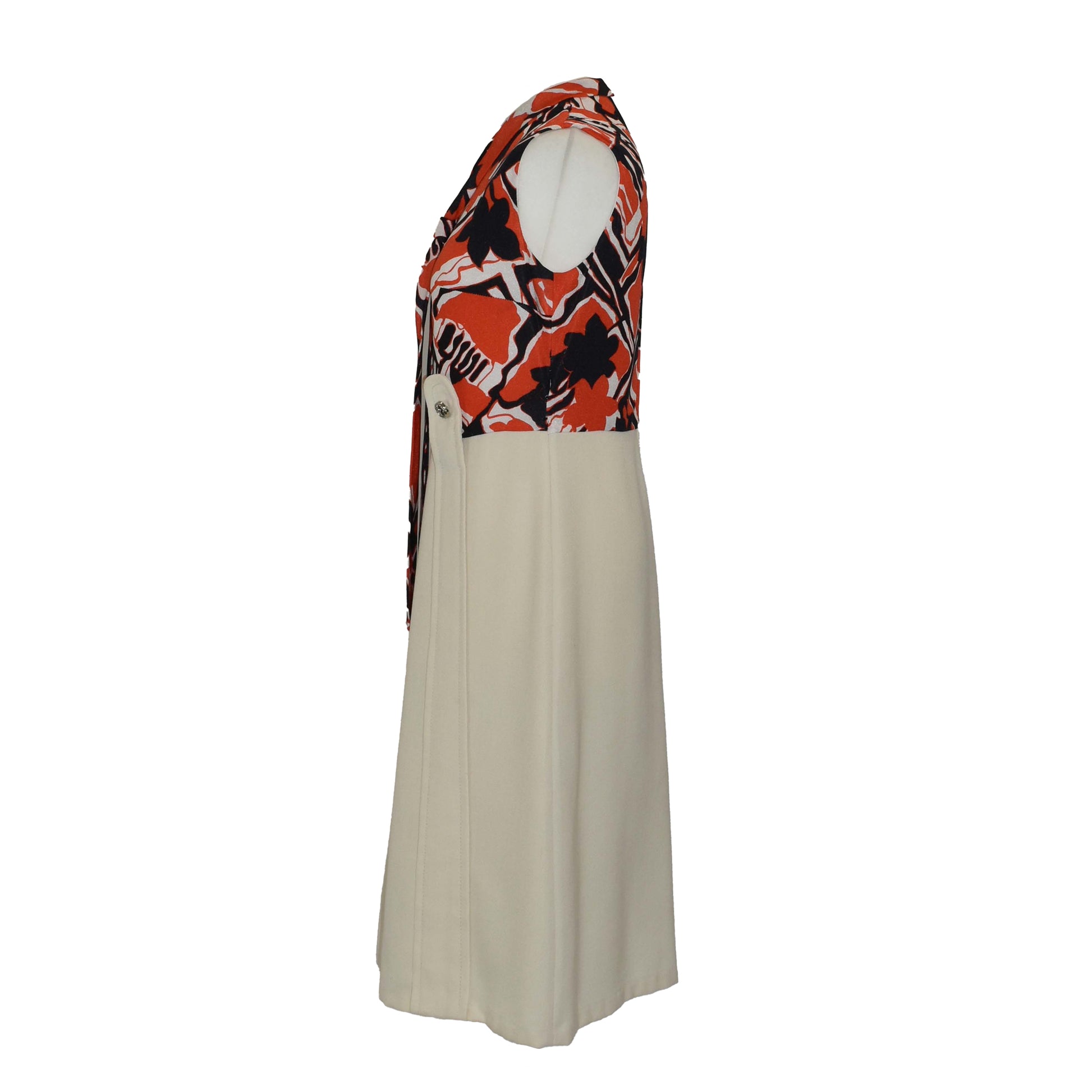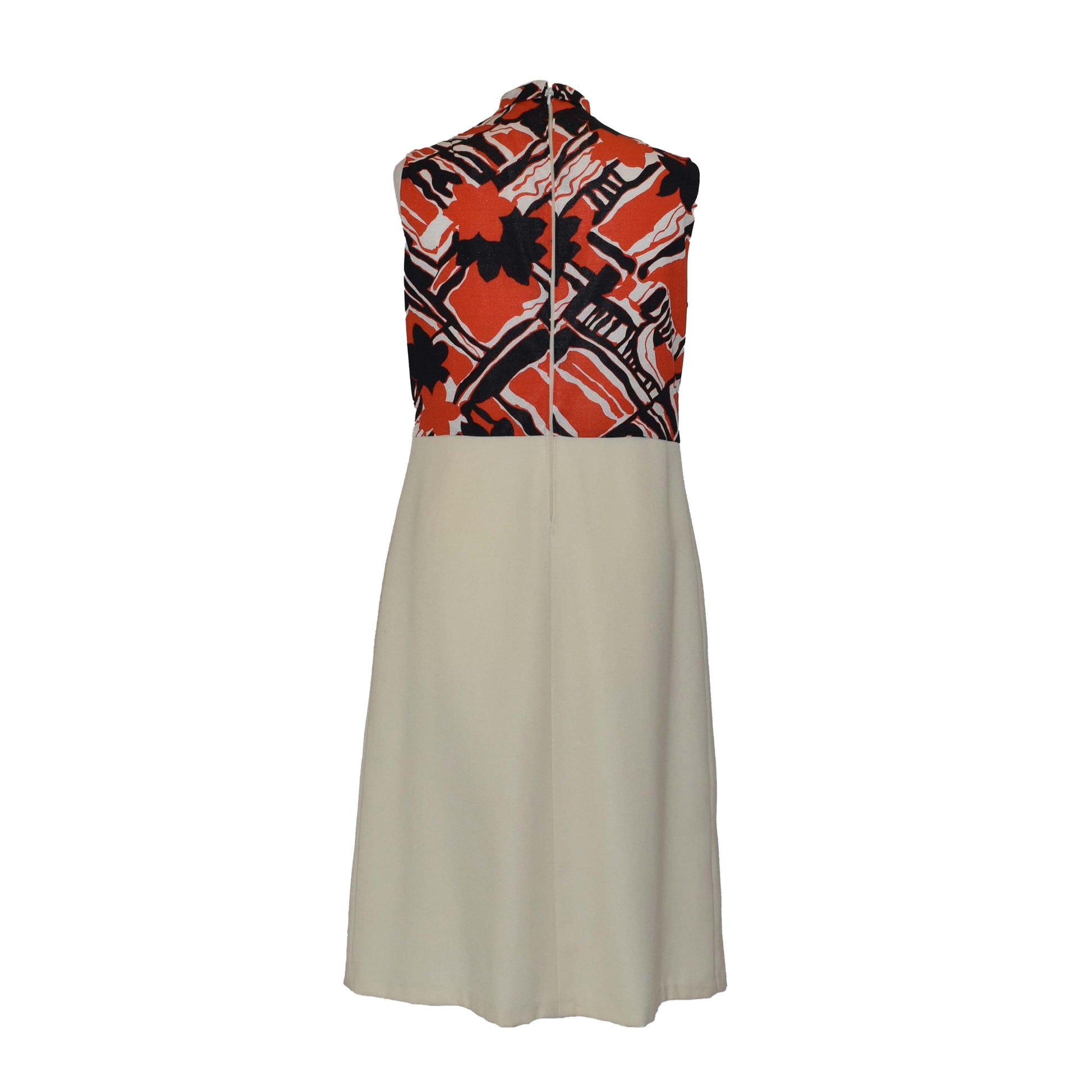 An absolutely wonderful 60’s mod shift. With a heavier weight skirt (likely a cotton blend) under a lighter-weight vibrantly printed bodice in a fantastic abstract design, with self-tie detail to the neckline. Tabs extend from the skirt seams with button detailing to complete the look.