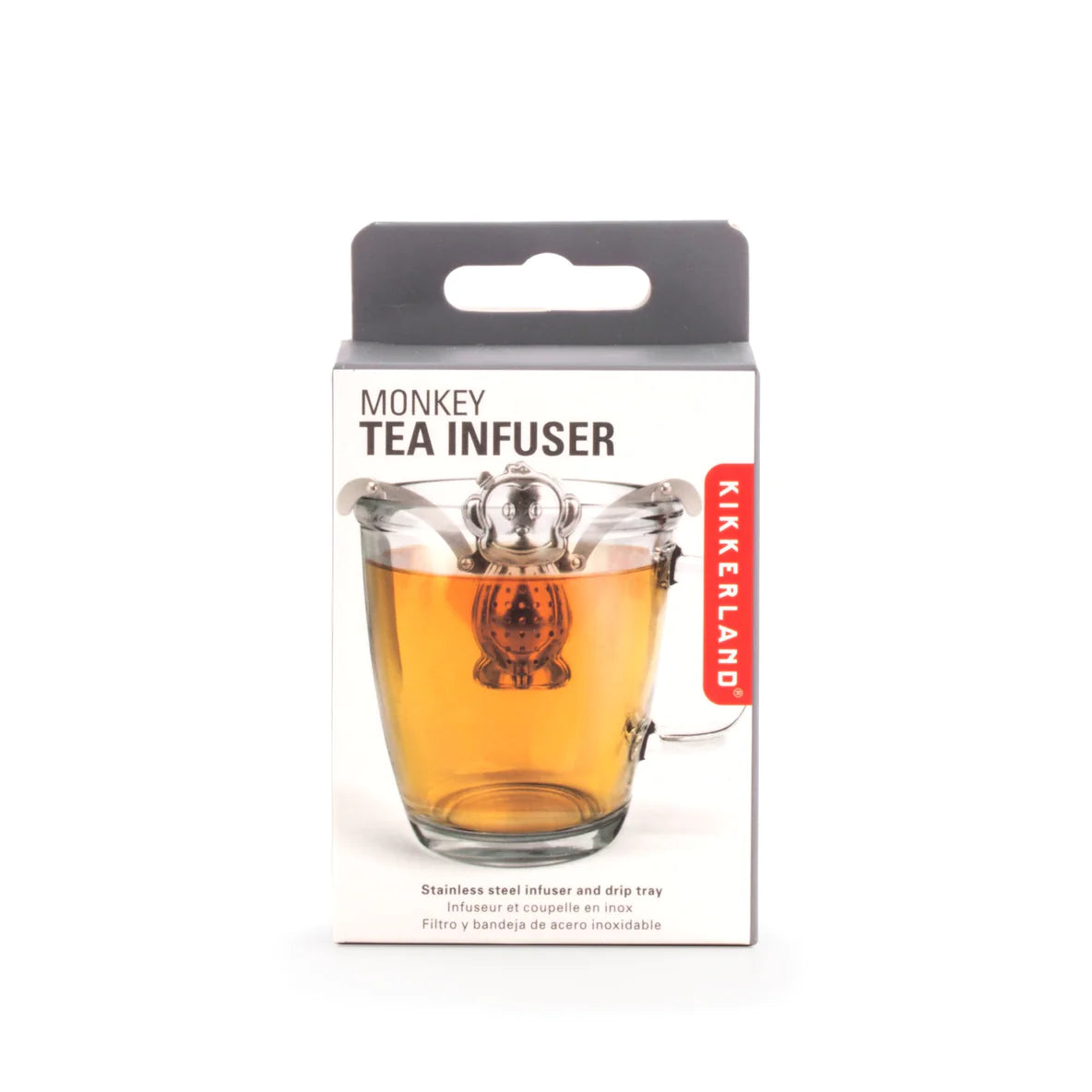 This stainless steel cheeky little monkey tea infuser has adjustable arms so you can easily drop them into any size mug. The included tray serves as a saucer when their job is done.