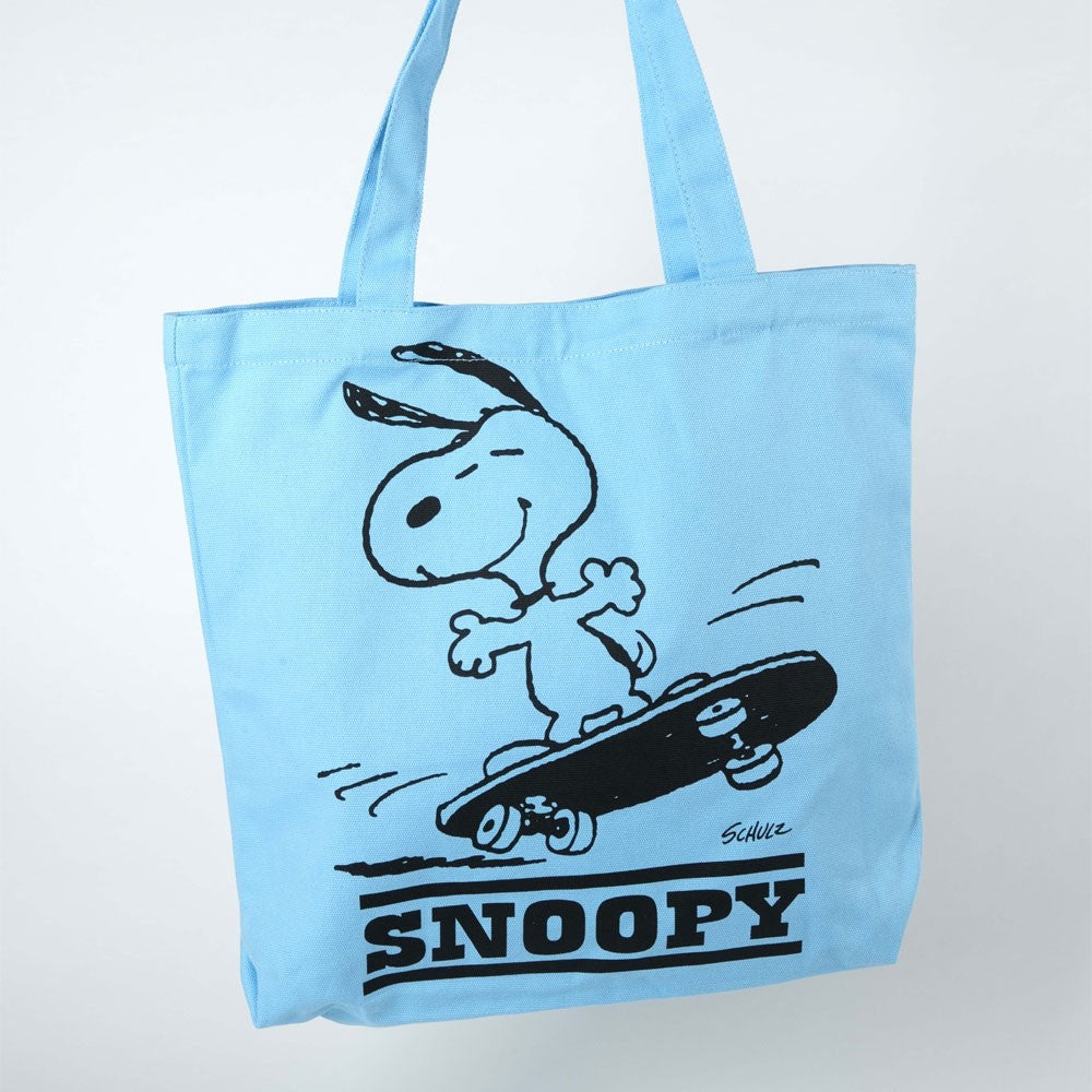 Peanuts by Charles Shultz screen-printed tote bag in a blue, featuring Snoopy celebrating life on a skateboard. Snoopy print to front and ‘I’ve got to start acting more sensible tomorrow’ text print to the back.