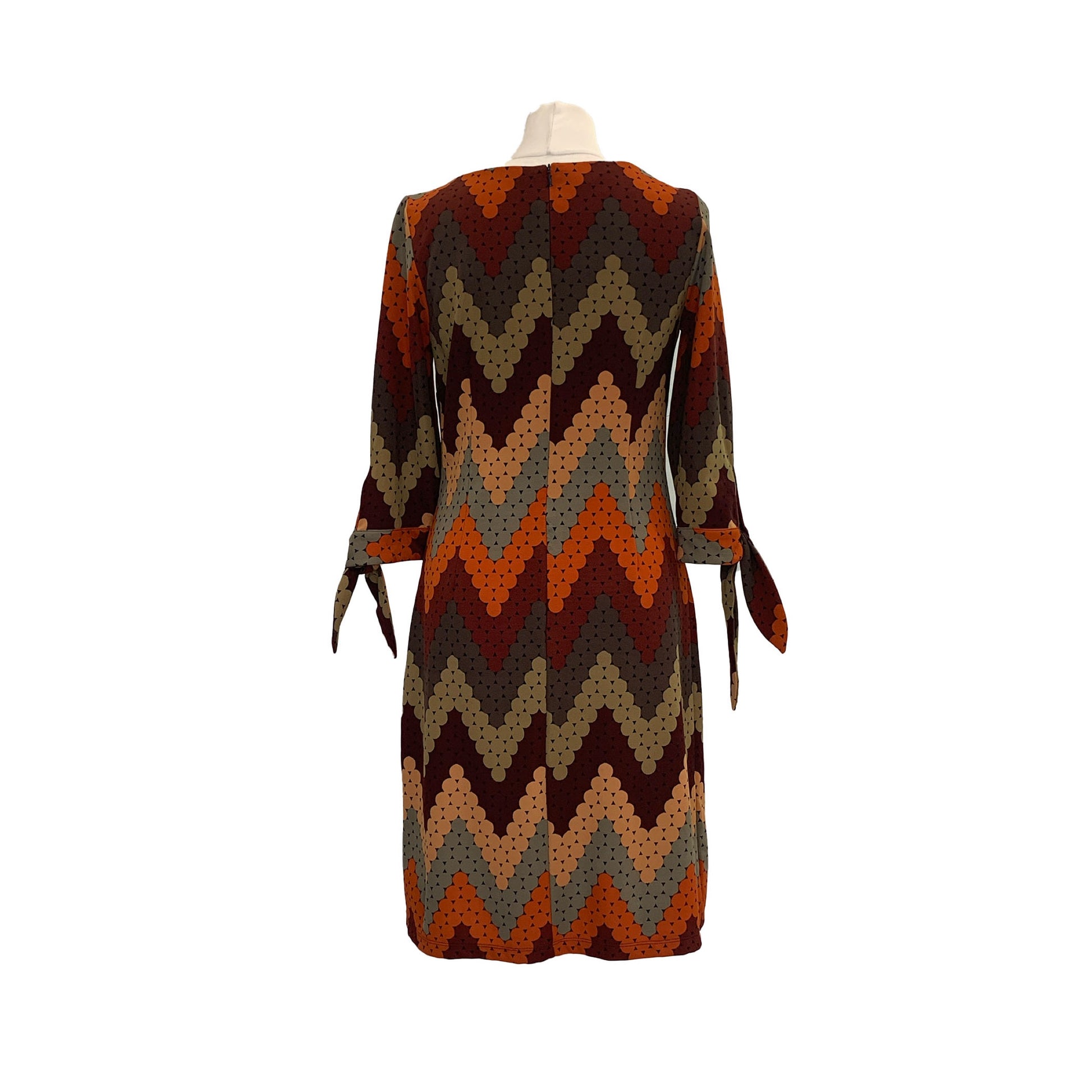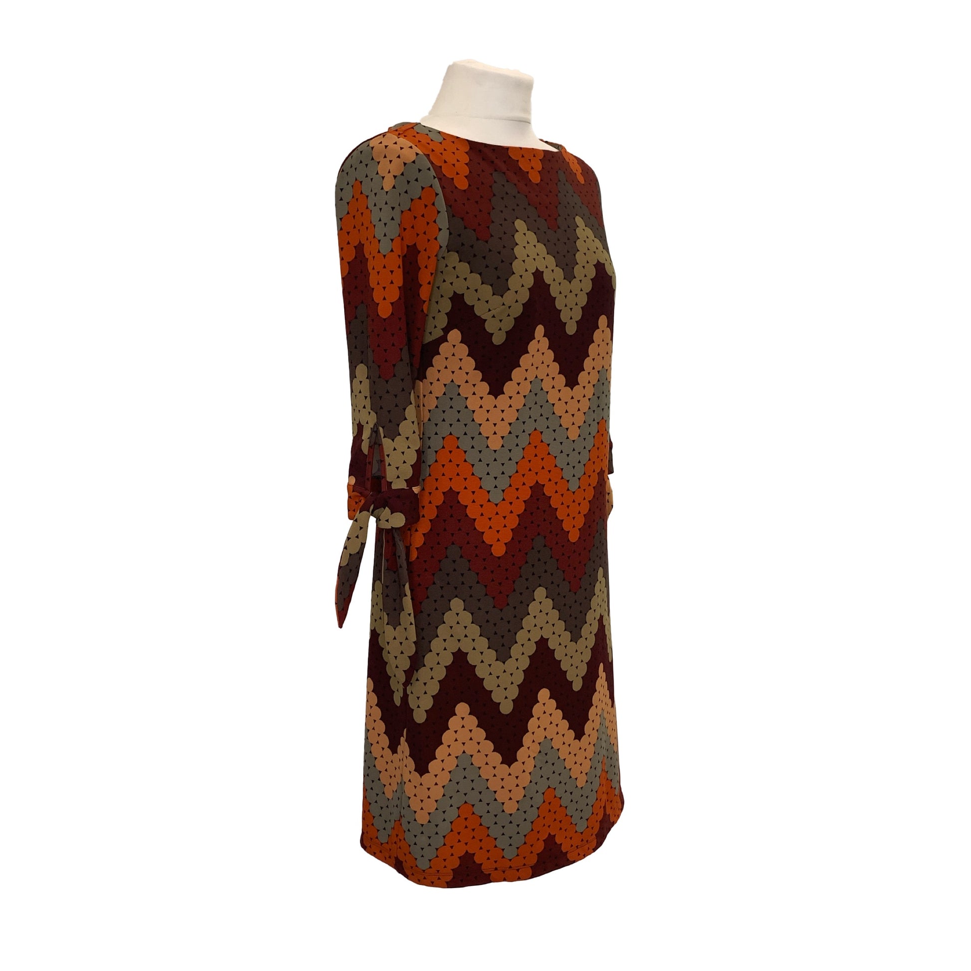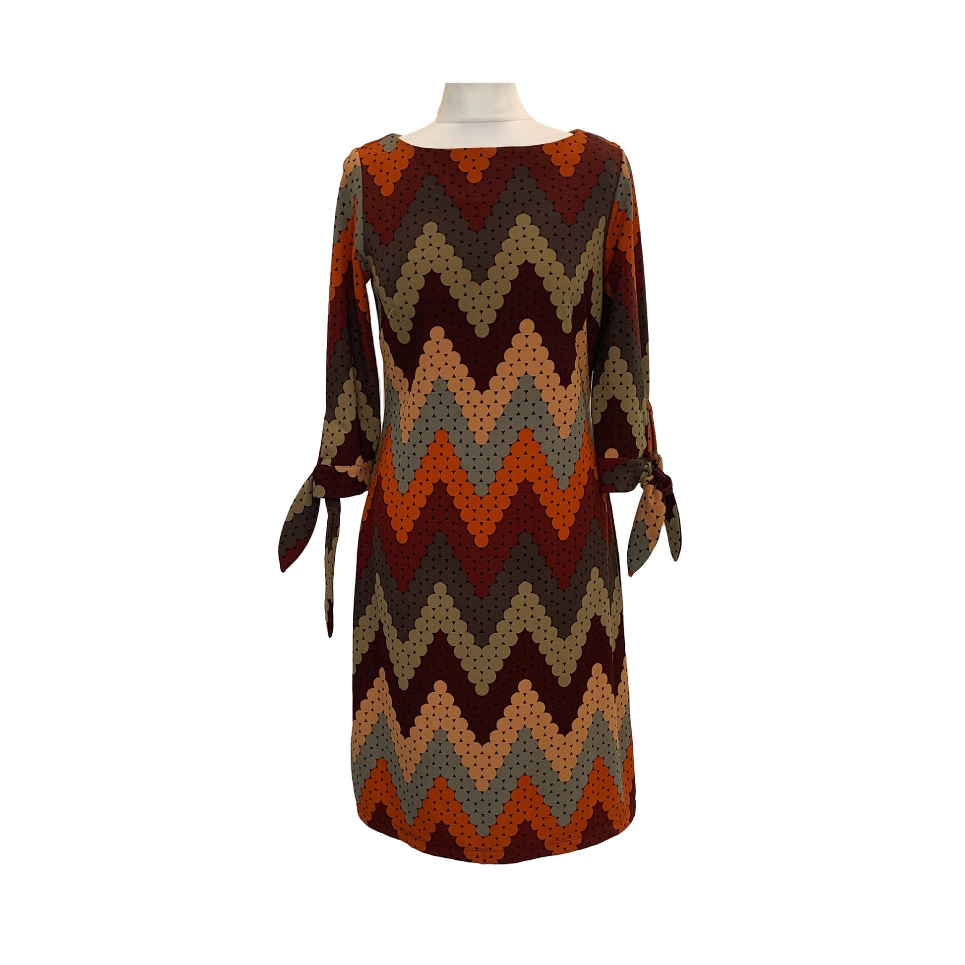 Not vintage, not very old either, we just think the pattern design and shape is cool. A lovely shape to this retro 70’s style dress. Boat neckline with long sleeves finishing with ties. Warm Autumnal colour palette.