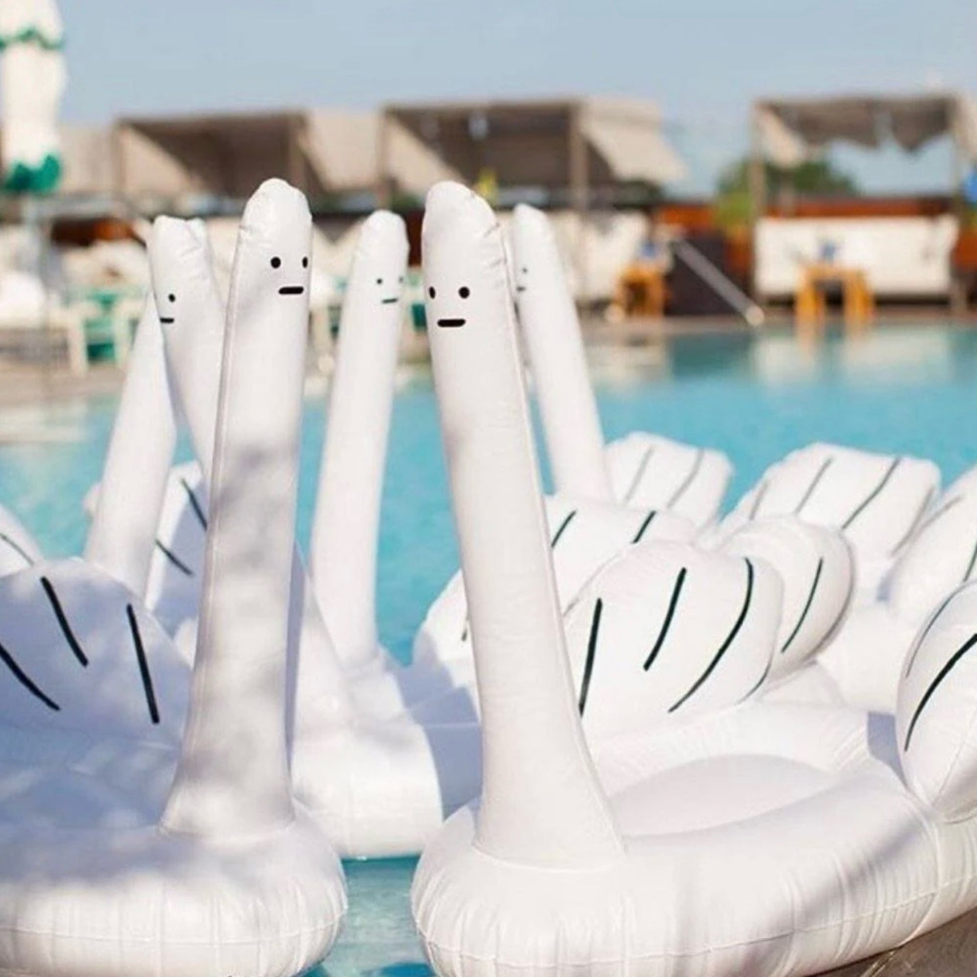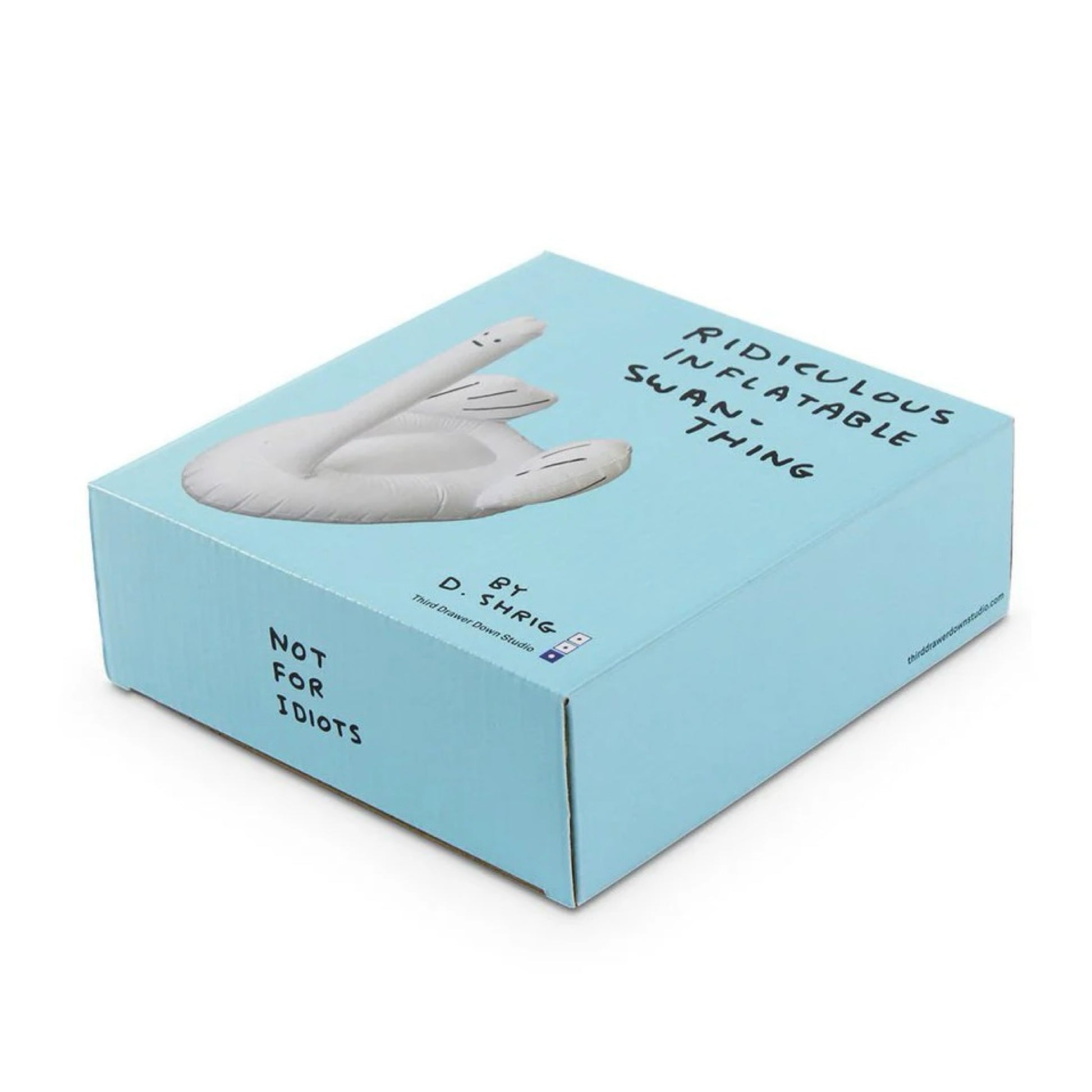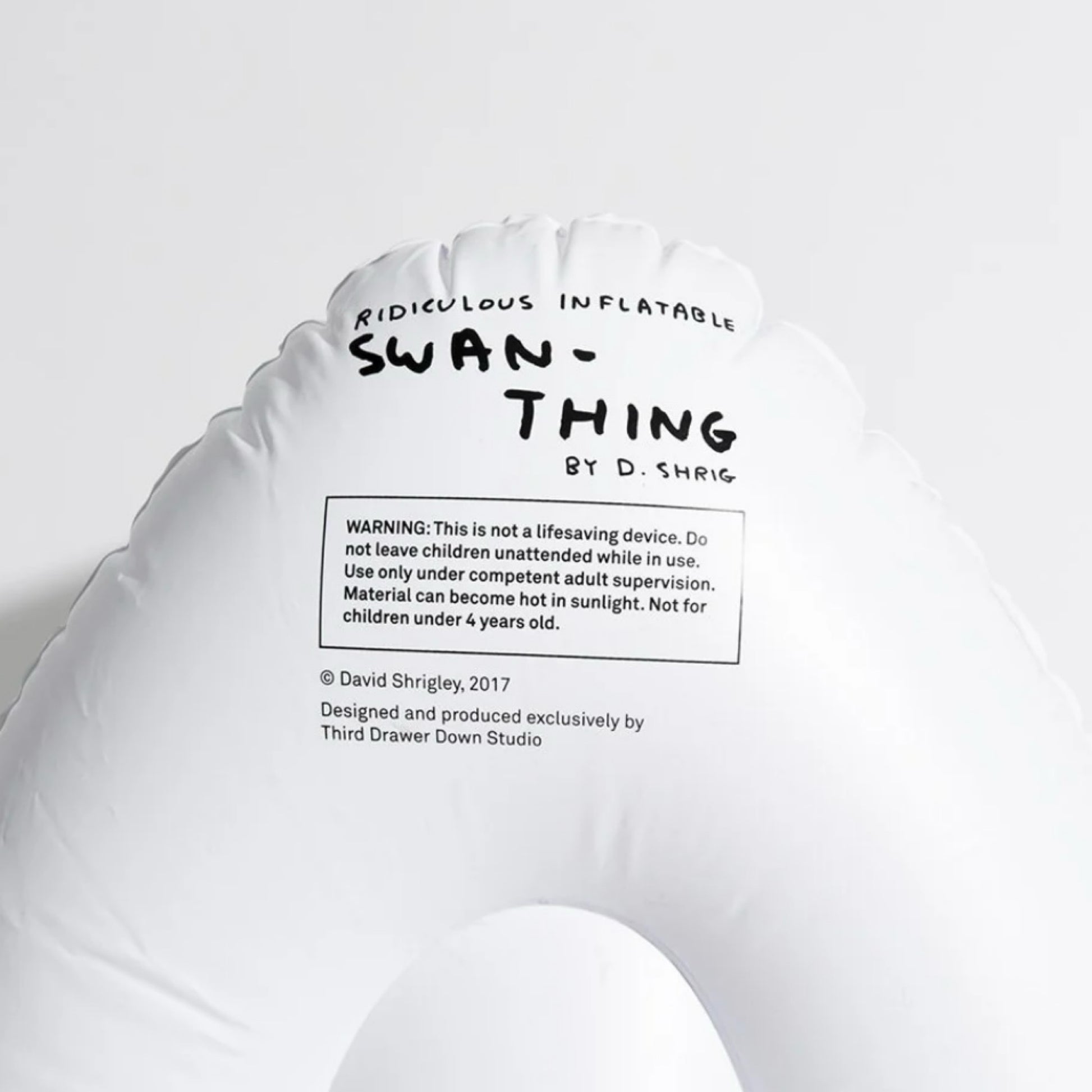 Designed by David Shrigley. This inflatable swan may be missing the graceful curves true to a classic swan, but with its hand-drawn blank expression and erect white neck, it knows exactly what it is, it is a "Ridiculous Inflatable Swan-Thing" and pool-ready. The summer of swanning is here.