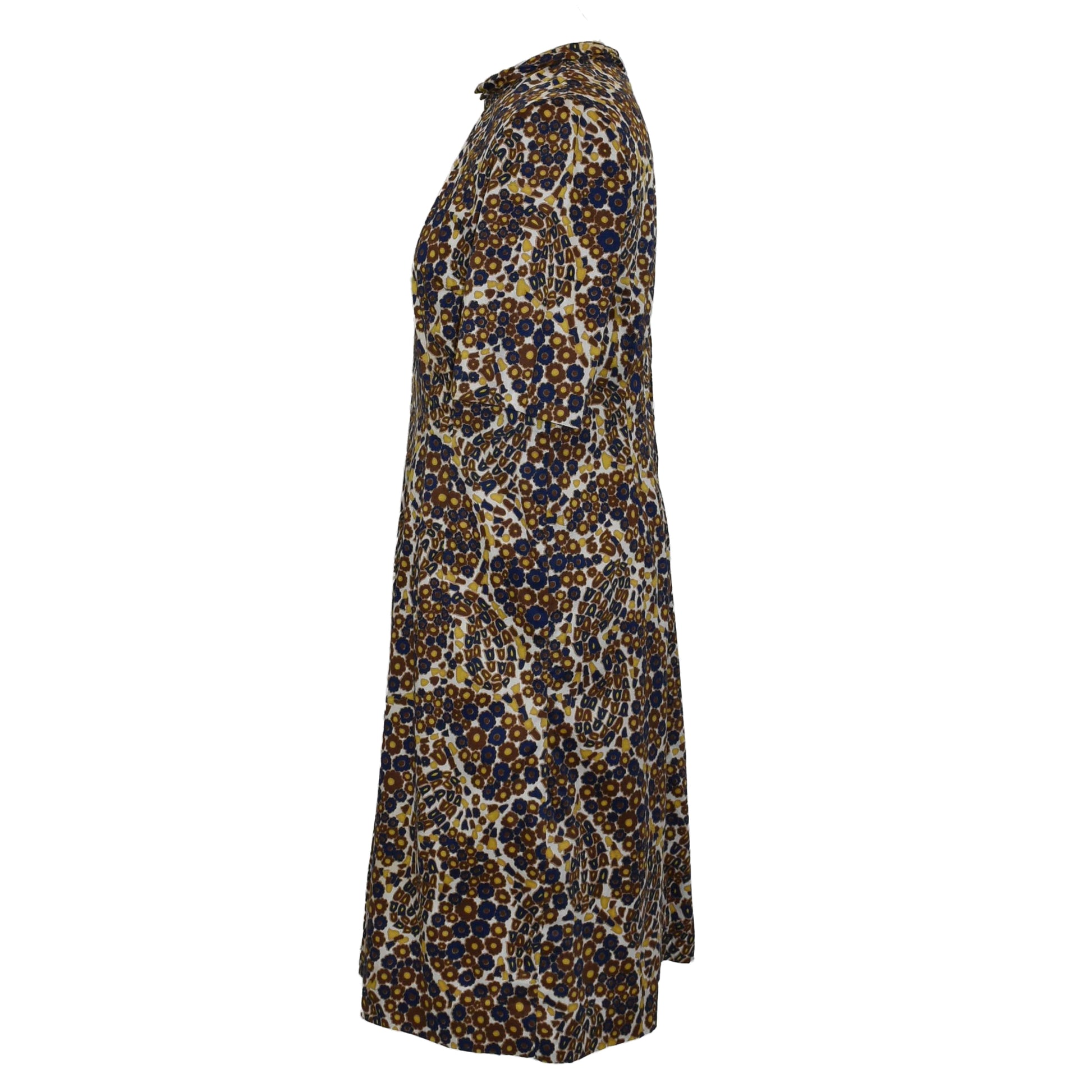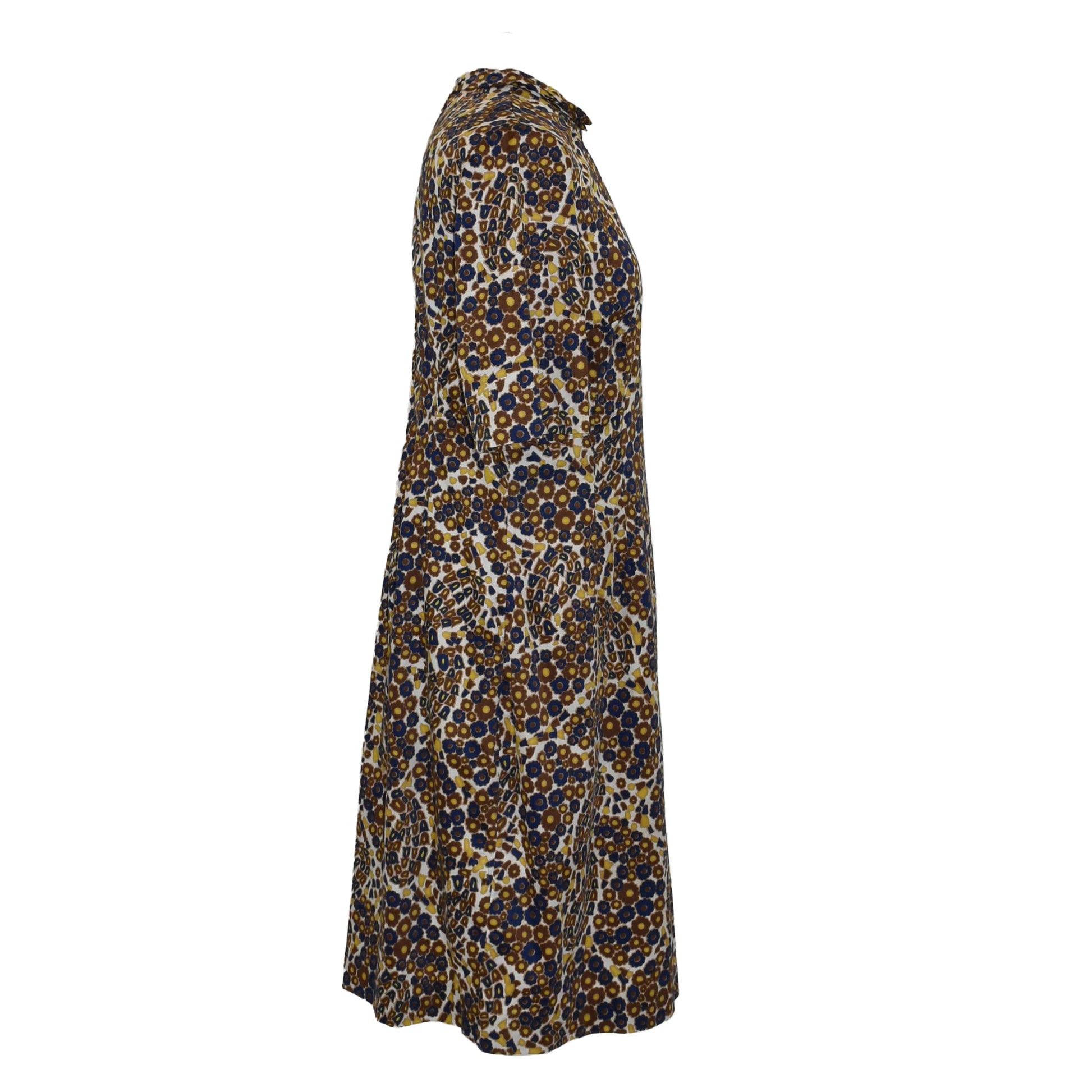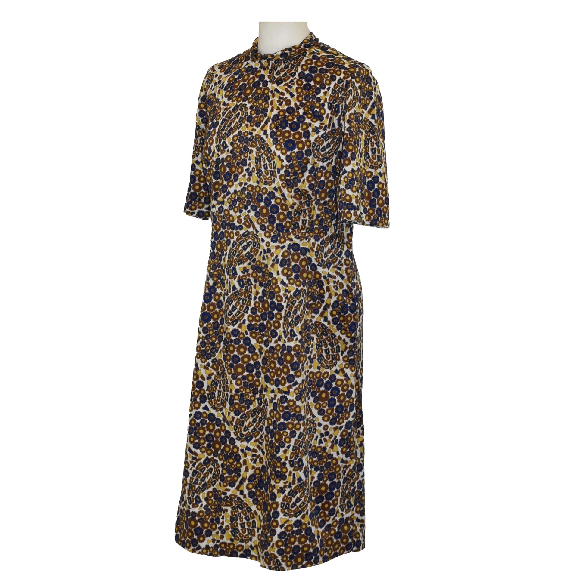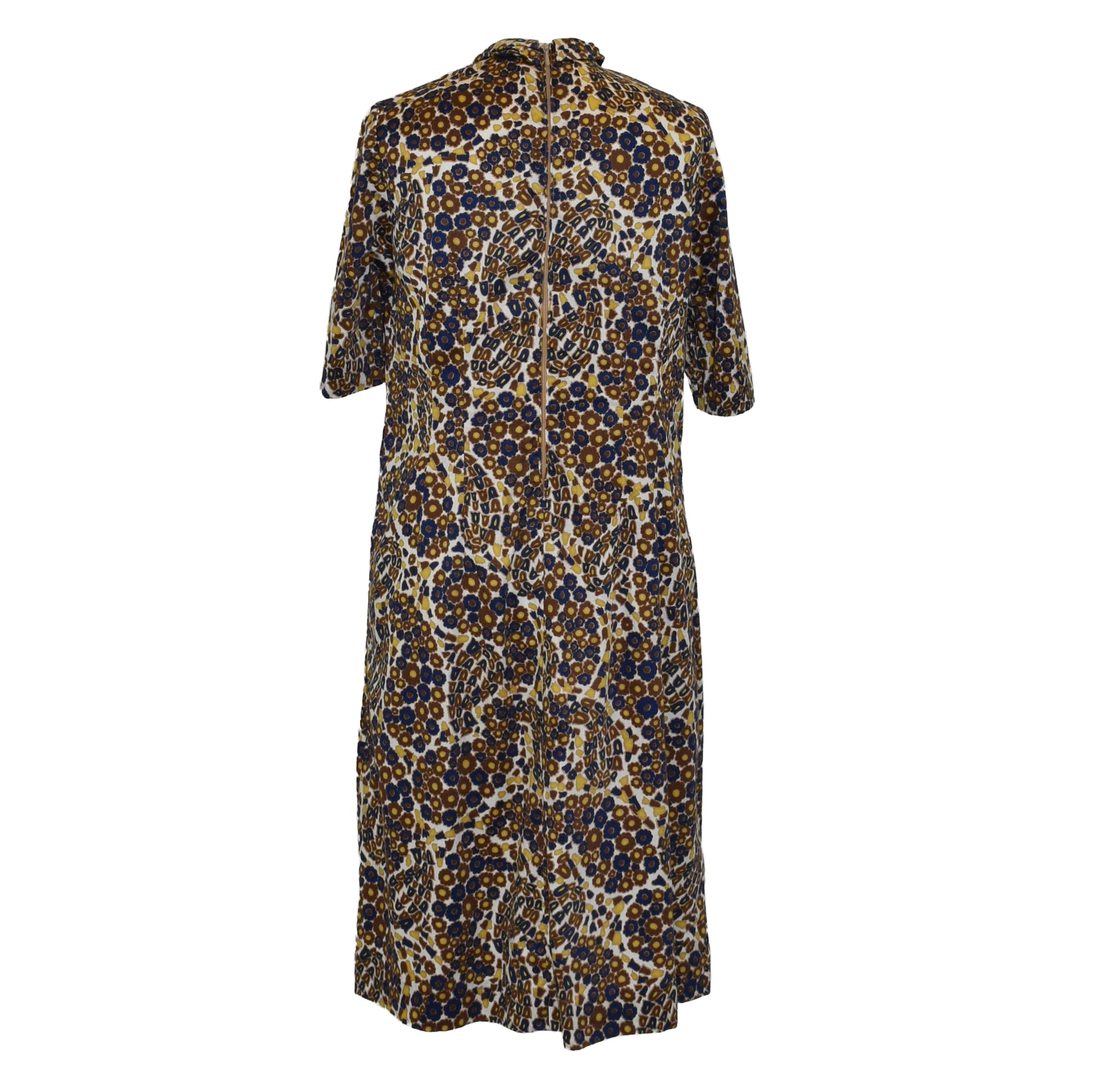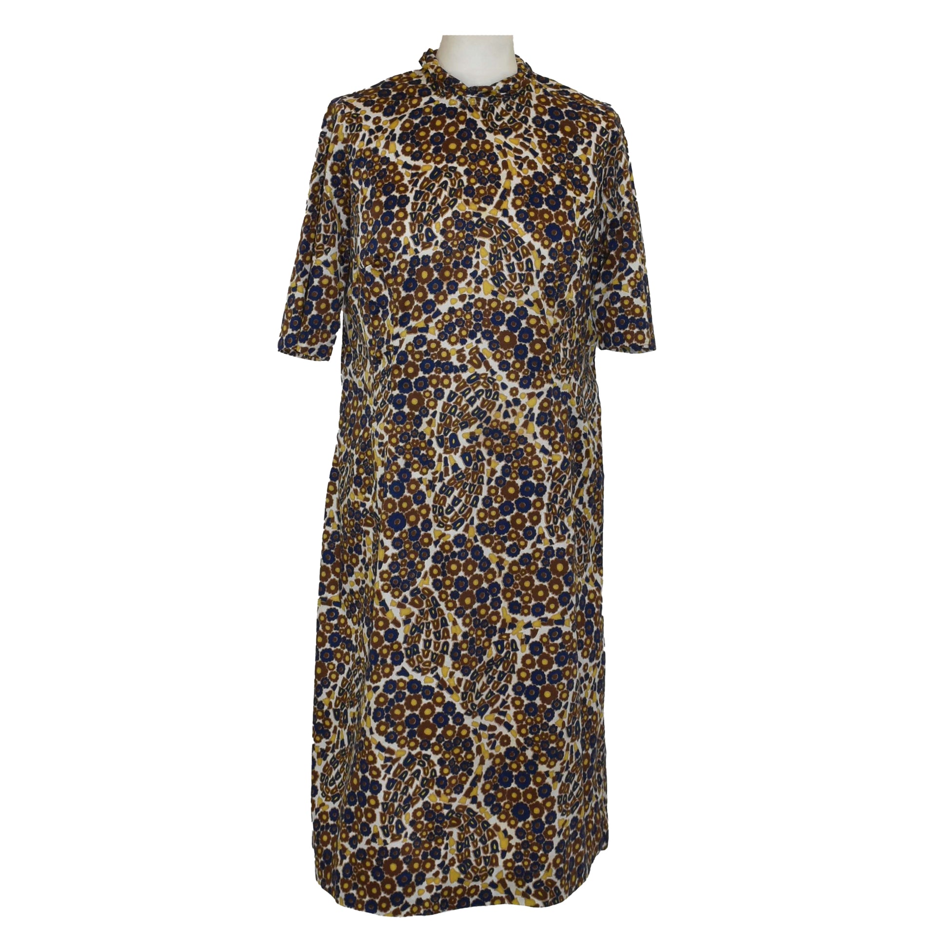 An elegant vintage 60’s high necked hand-sewn shift dress from the 1960’s. Constructed using a lightweight cotton sateen, in a beautiful floral motif print hidden within a paisley pattern. The colour-palette used in designing this surface pattern was well executed.